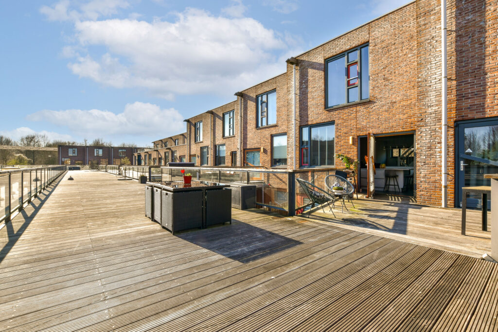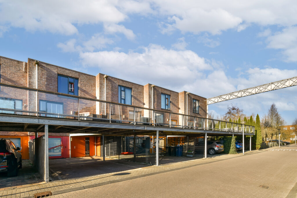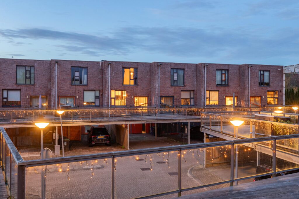 A small step takes you to the kitchen at the front. Thanks to the large windows and the pivot door, similar to the front door, this space is also wonderfully light. The kitchen is modern and attractively finished with light tones and high-quality materials. The layout consists of a fixed kitchen unit and a large cooking island with an adjoining breakfast bar. The kitchen is equipped with a sink, refrigerator, freezer, oven, dishwasher, microwave and an induction hob with recirculation hood in the cooking island. From the kitchen, you can see one of the special features of this property: the communal upper deck. This deck connects 32 homes and is an ideal place for a terrace or extra play area for children. It faces southwest, allowing you to enjoy the sun almost all day long. There is an active owners' association for this upper deck; the contribution for this is €70 per month. This ensures that everything is well maintained.