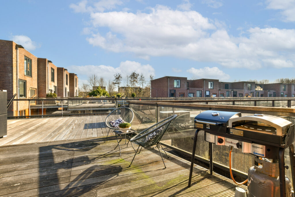 Een klein afstapje brengt je naar de keuken aan de voorzijde. Door de grote ramen en de taatsdeur, vergelijkbaar met de voordeur, is ook deze ruimte heerlijk licht. De keuken is modern en sfeervol afgewerkt met lichte tinten en hoogwaardige materialen. De opstelling bestaat uit een vast keukenblok en een groot kookeiland met aangrenzende ontbijtbar. De keuken is voorzien van een spoelbak, koelkast, vriezer, oven, vaatwasser, magnetron en een inductiekookplaat met recirculatiekap in het kookeiland. Vanuit de keuken kijk je uit op een bijzonder pluspunt van deze woning: het gemeenschappelijke bovendek. Dit dek verbindt 32 woningen en is een ideale plek voor een terras of extra speelruimte voor kinderen. Het ligt op het zuidwesten, waardoor je er vrijwel de hele dag van de zon kunt genieten. Voor dit bovendek is een actieve VvE; de bijdrage hiervoor bedraagt € 70,- per maand. Dit zorgt ervoor dat alles keurig wordt onderhouden.