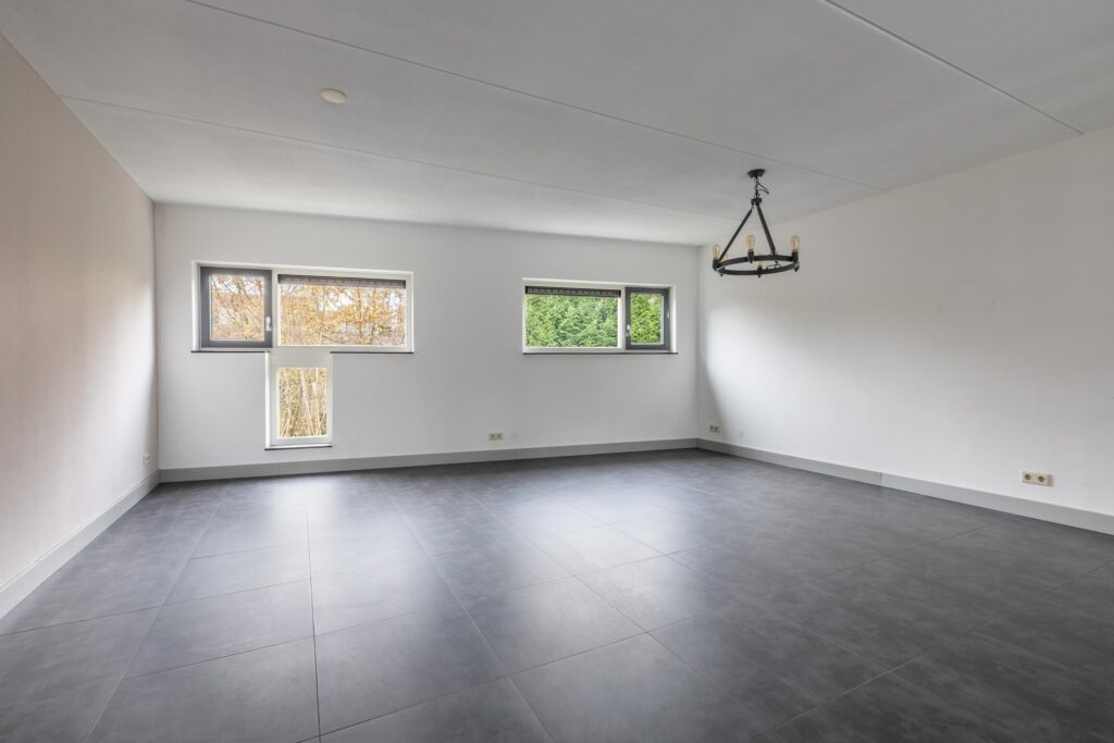 De ruime eetkamer ligt aan de tuinzijde en biedt een prettig uitzicht op het groen. De nette tegelvloer met vloerverwarming zorgt hier voor extra comfort.