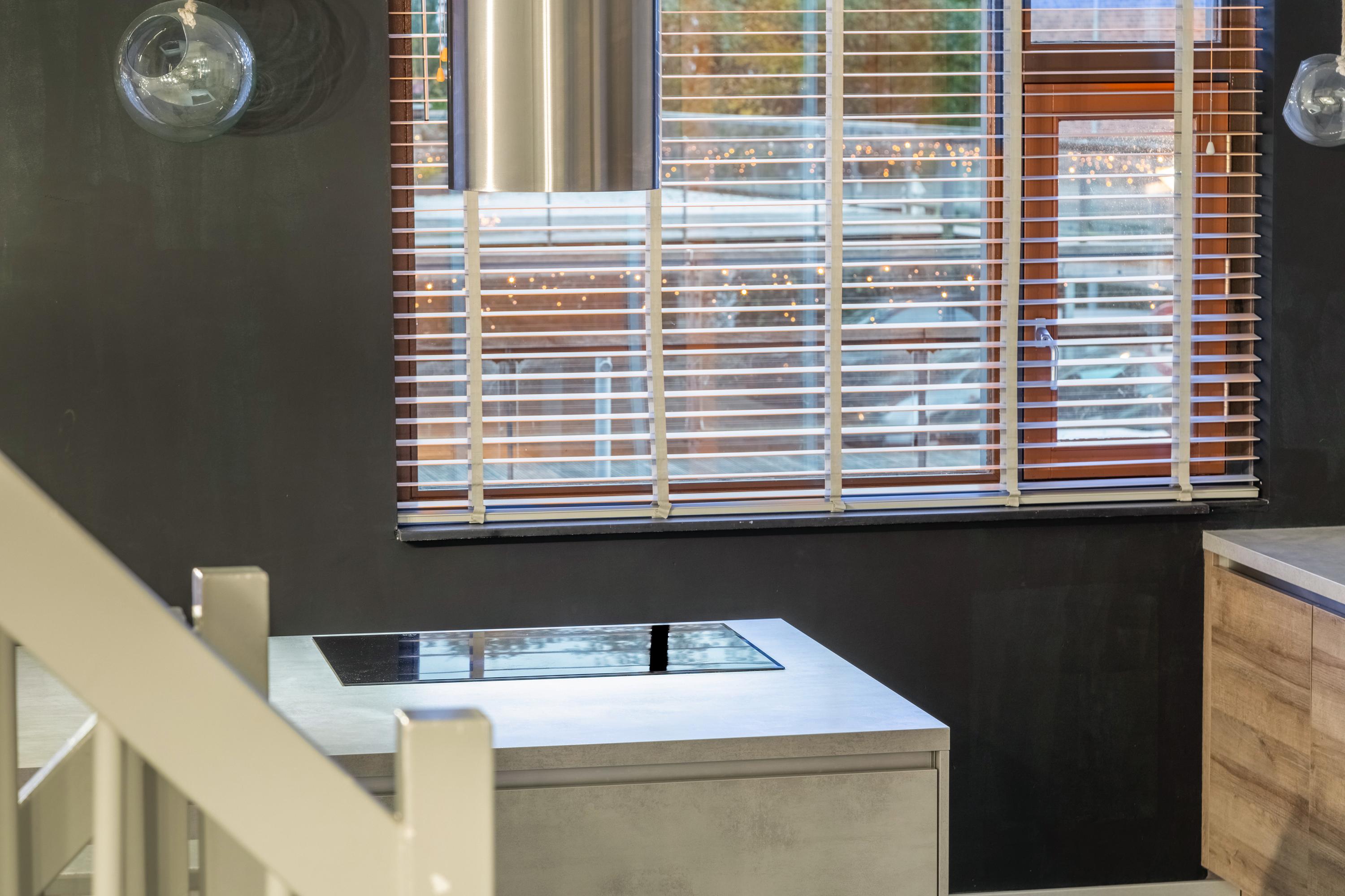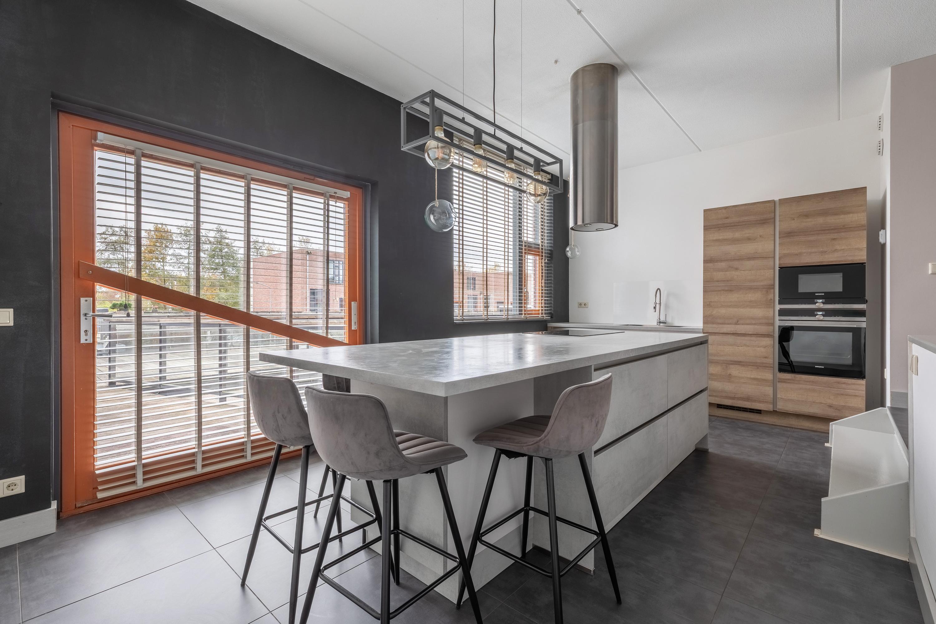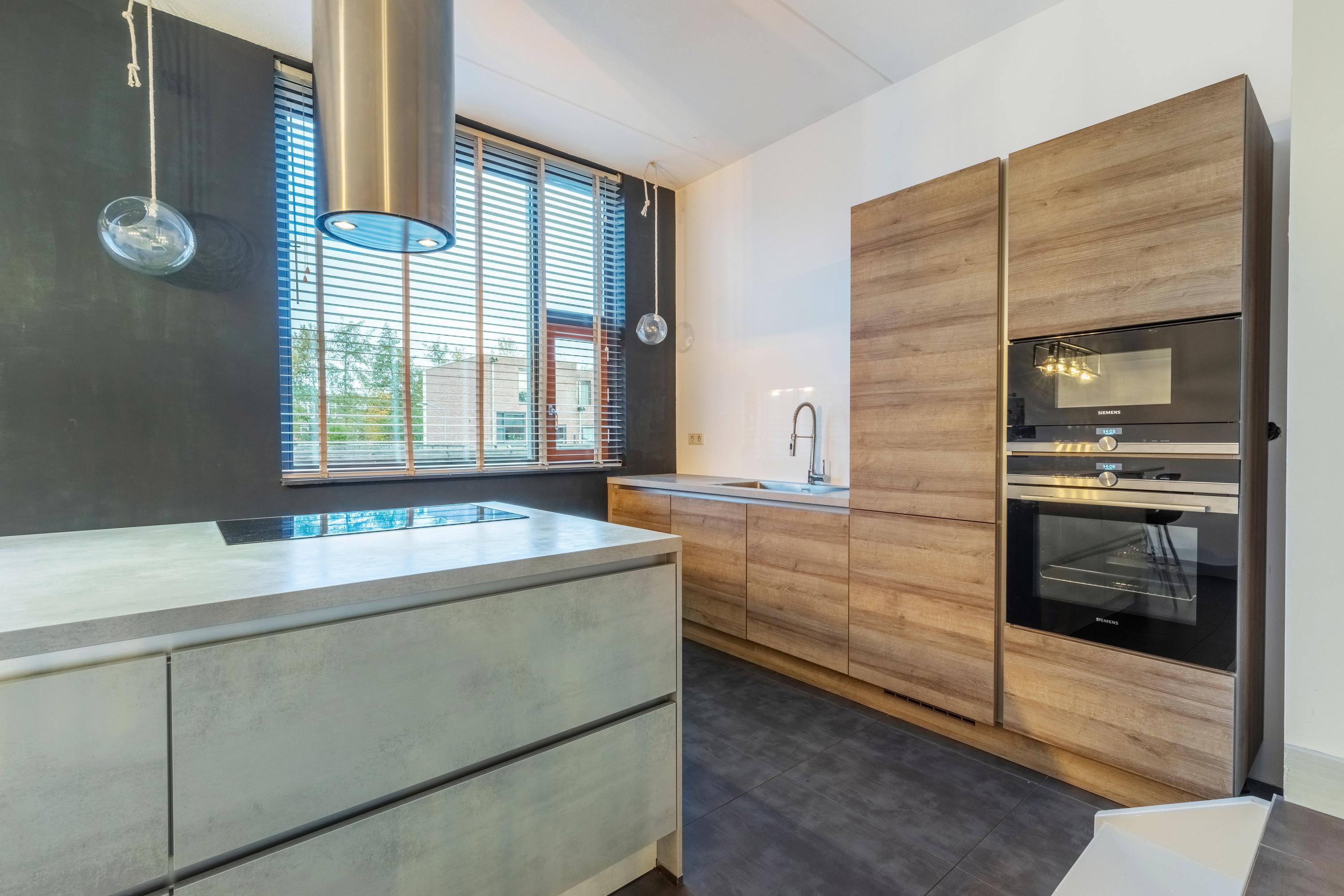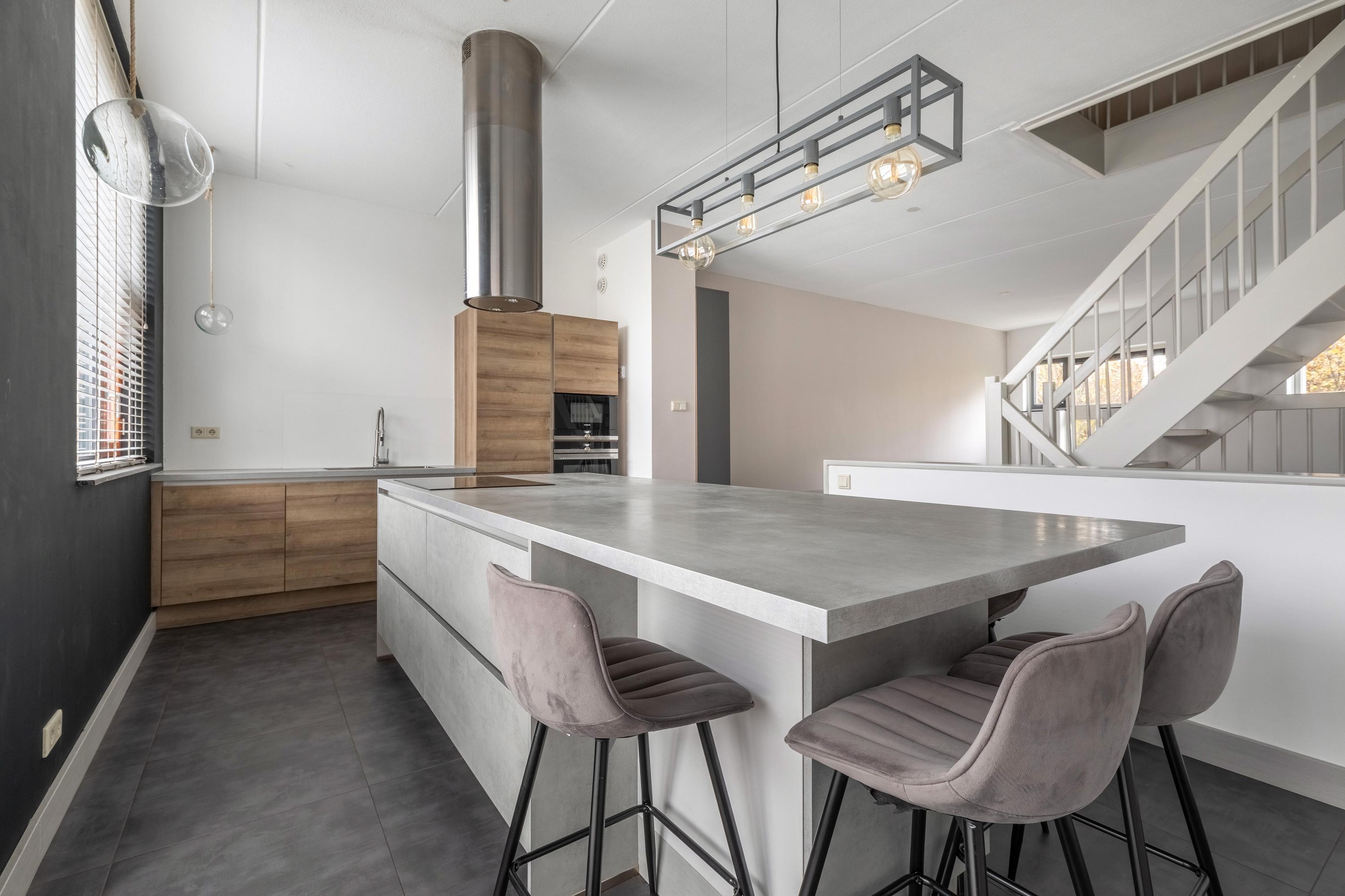 A small step takes you to the kitchen at the front. Thanks to the large windows and the pivot door, similar to the front door, this space is also wonderfully light. The kitchen is modern and attractively finished with light tones and high-quality materials. The layout consists of a fixed kitchen unit and a large cooking island with an adjoining breakfast bar. The kitchen is equipped with a sink, refrigerator, freezer, oven, dishwasher, microwave and an induction hob with recirculation hood in the cooking island. From the kitchen, you can see one of the special features of this property: the communal upper deck. This deck connects 32 homes and is an ideal place for a terrace or extra play area for children. It faces southwest, allowing you to enjoy the sun almost all day long. There is an active owners' association for this upper deck; the contribution for this is €70 per month. This ensures that everything is well maintained.