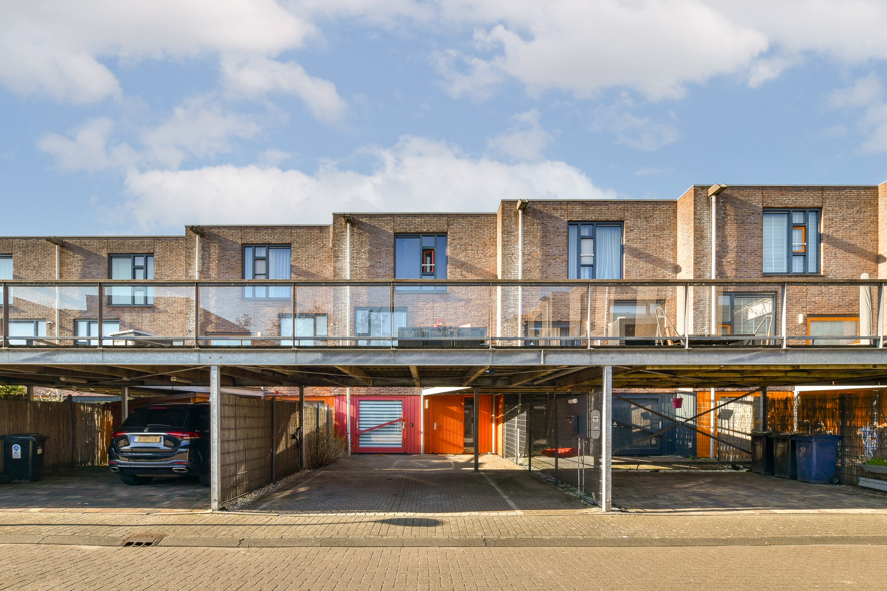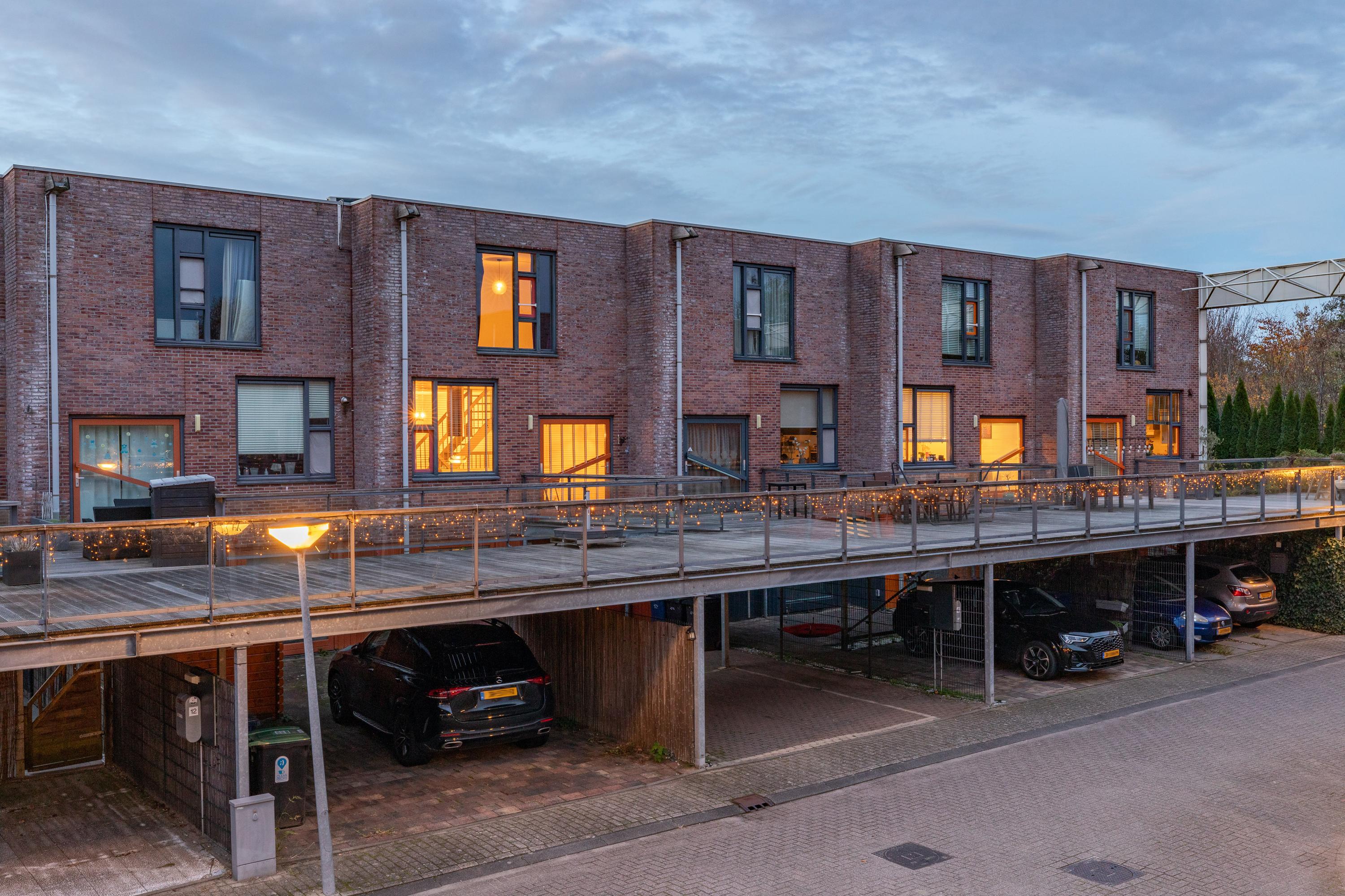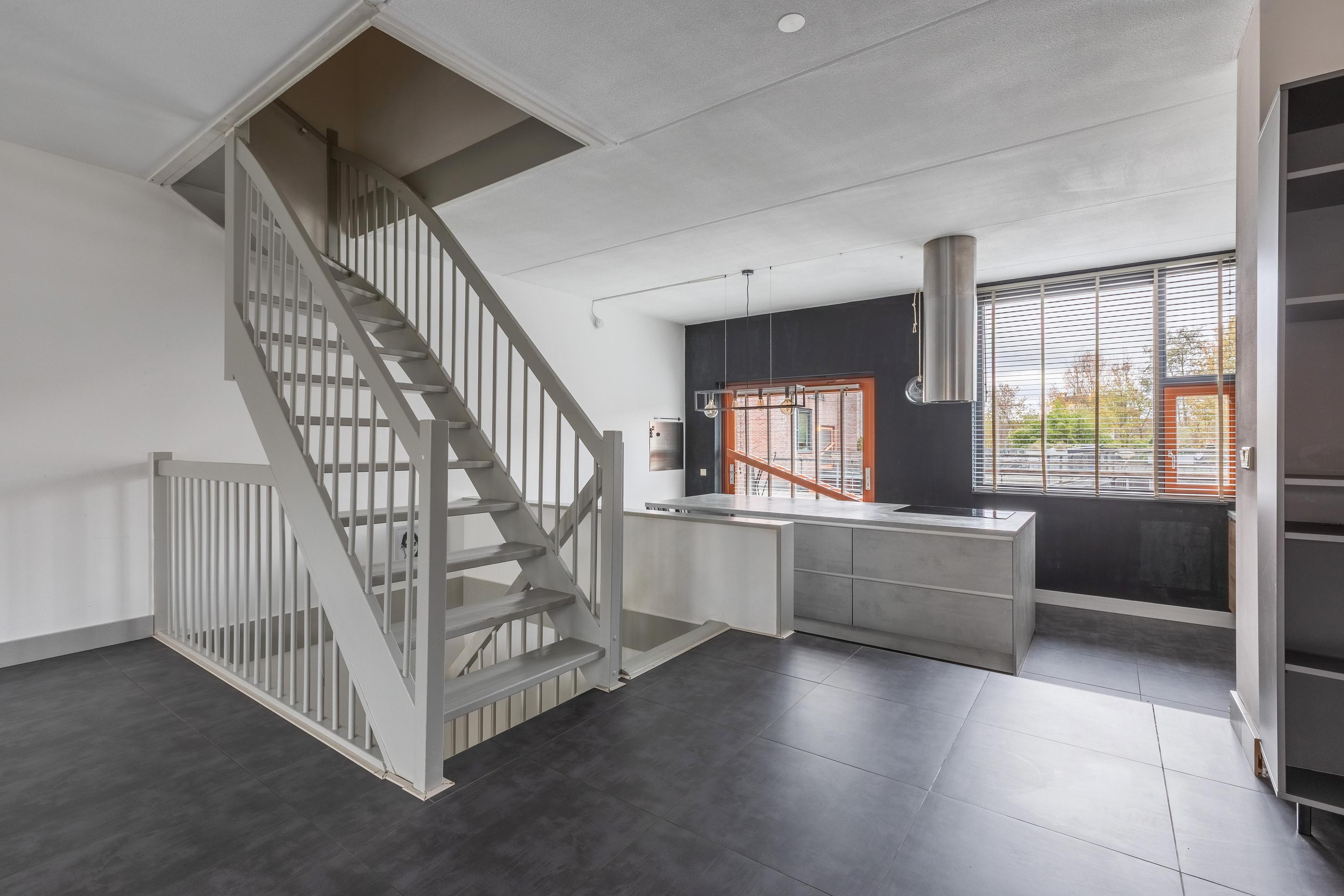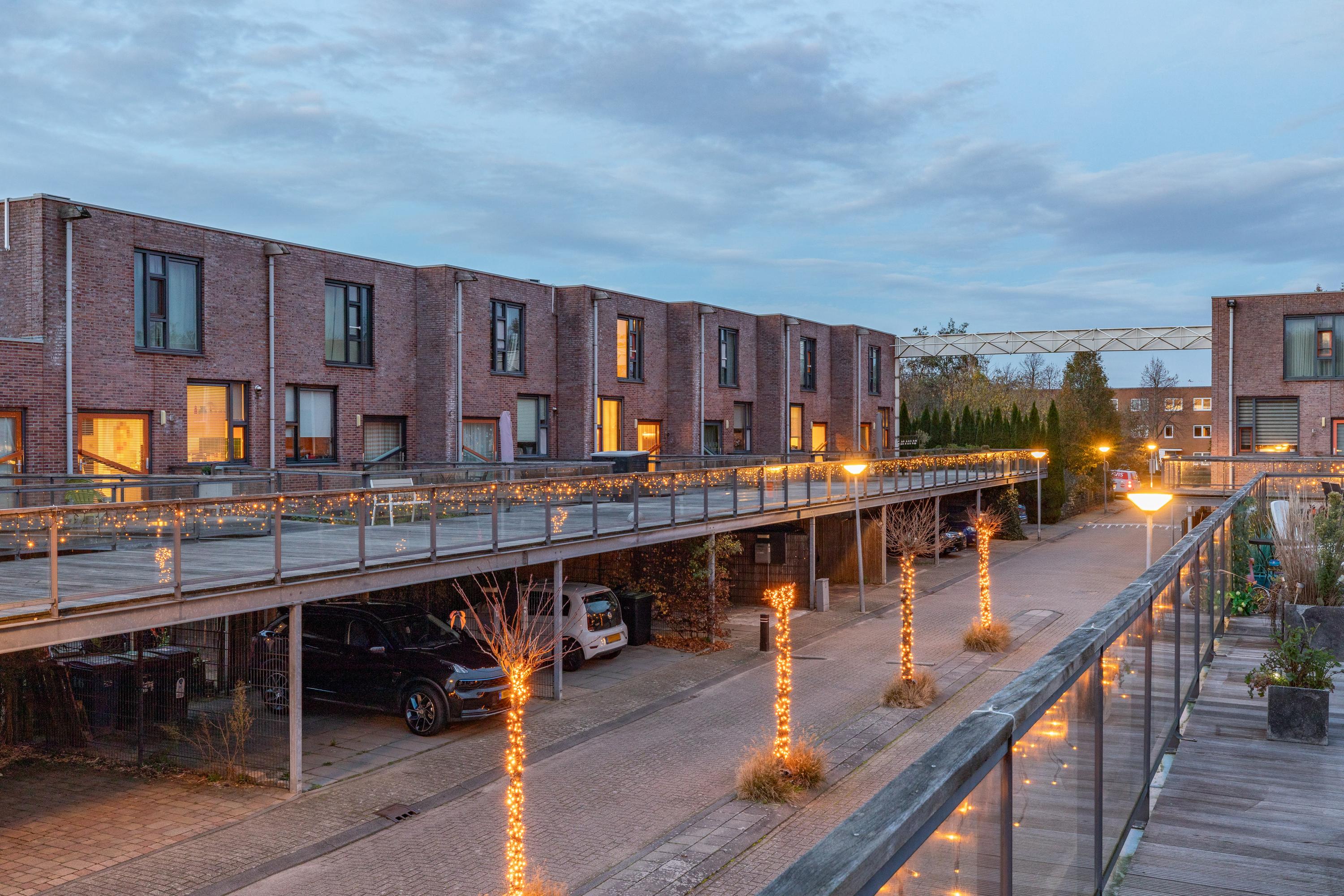 A small step takes you to the kitchen at the front. Thanks to the large windows and the pivot door, similar to the front door, this space is also wonderfully light. The kitchen is modern and attractively finished with light tones and high-quality materials. The layout consists of a fixed kitchen unit and a large cooking island with an adjoining breakfast bar. The kitchen is equipped with a sink, refrigerator, freezer, oven, dishwasher, microwave and an induction hob with recirculation hood in the cooking island. From the kitchen, you can see one of the special features of this property: the communal upper deck. This deck connects 32 homes and is an ideal place for a terrace or extra play area for children. It faces southwest, allowing you to enjoy the sun almost all day long. There is an active owners' association for this upper deck; the contribution for this is €70 per month. This ensures that everything is well maintained.