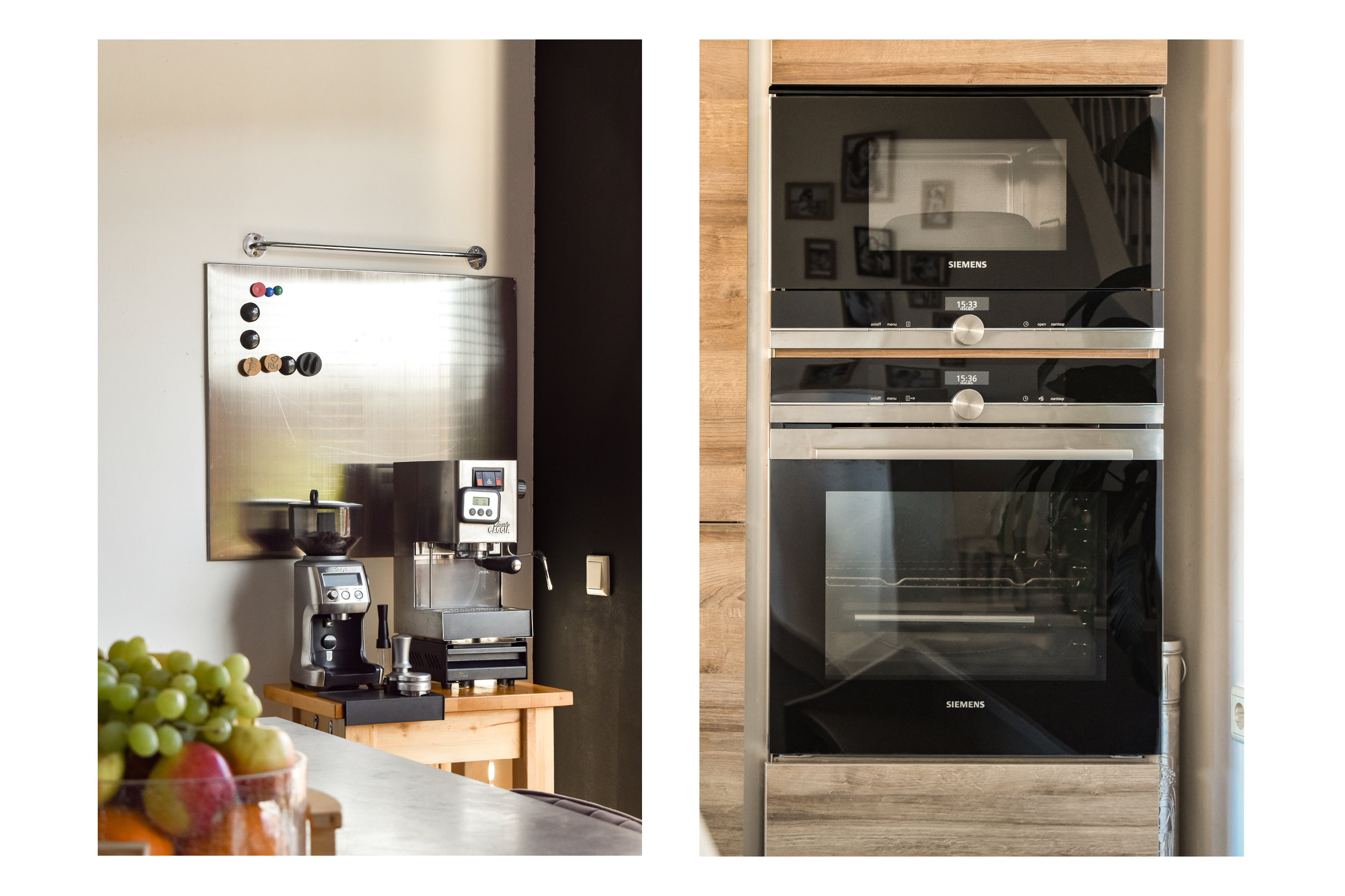 The spacious dining room is located on the garden side and offers a pleasant view of the greenery. The neat tiled floor with underfloor heating provides extra comfort here.
