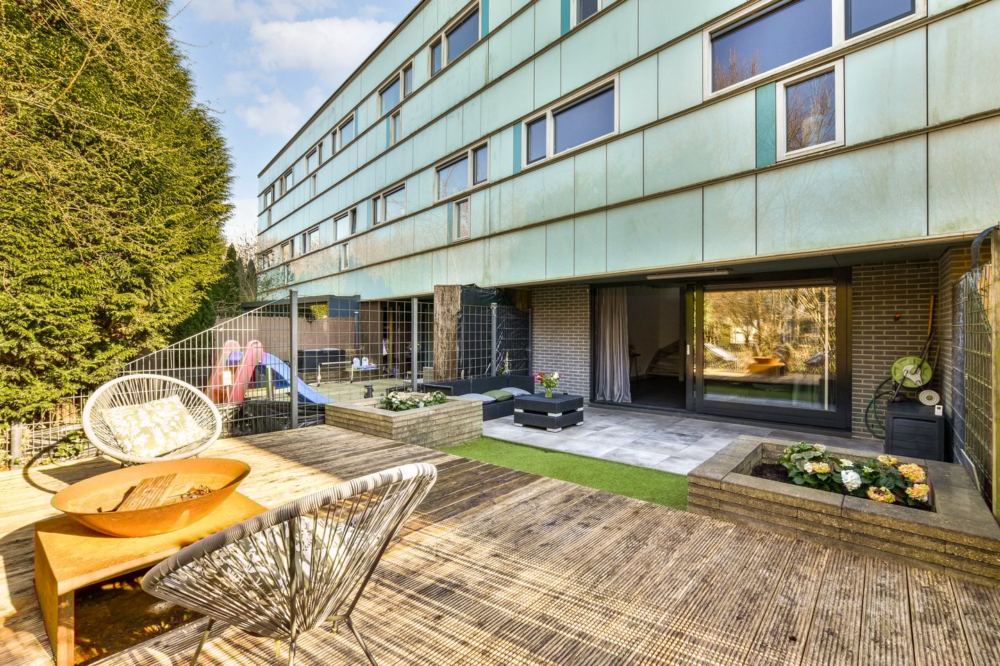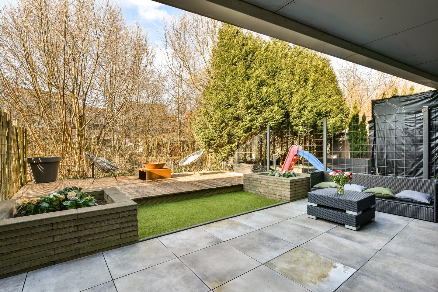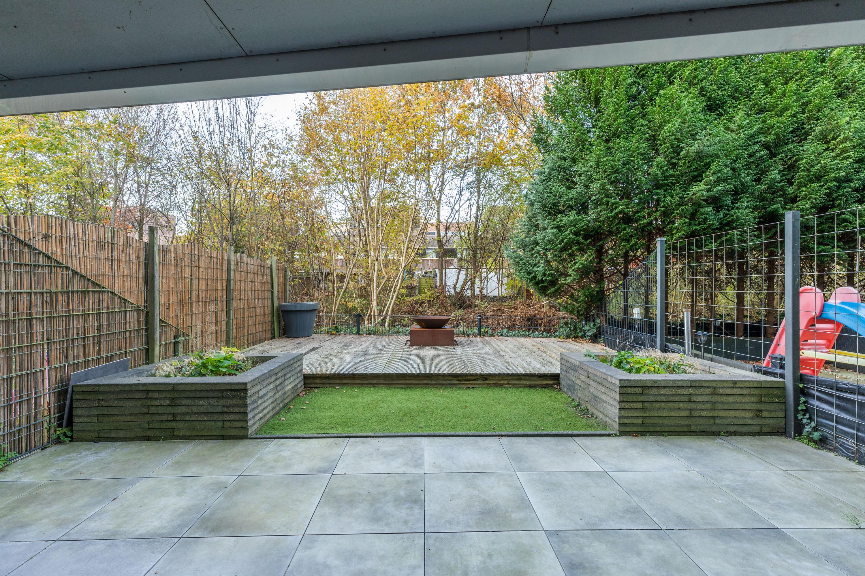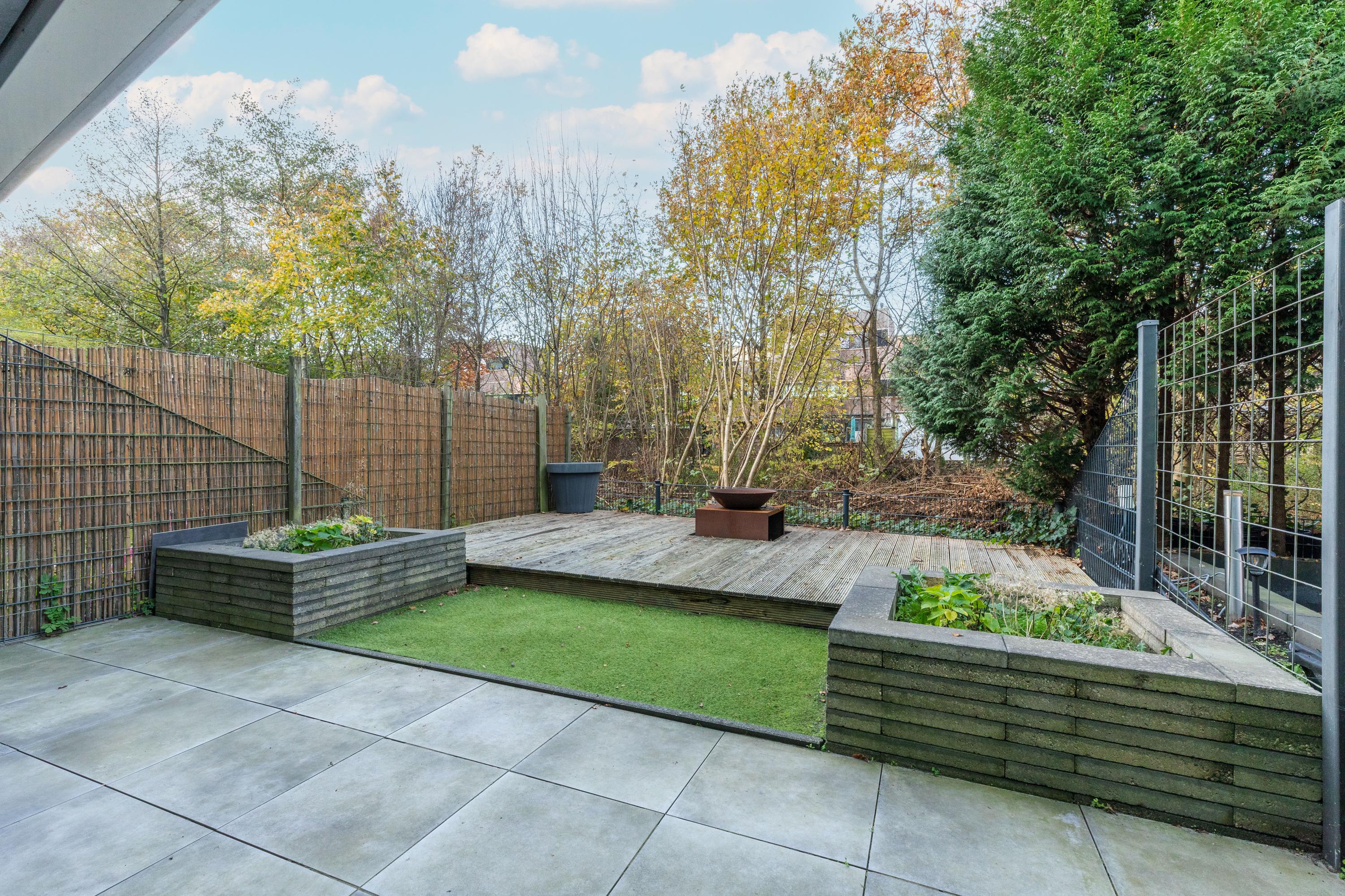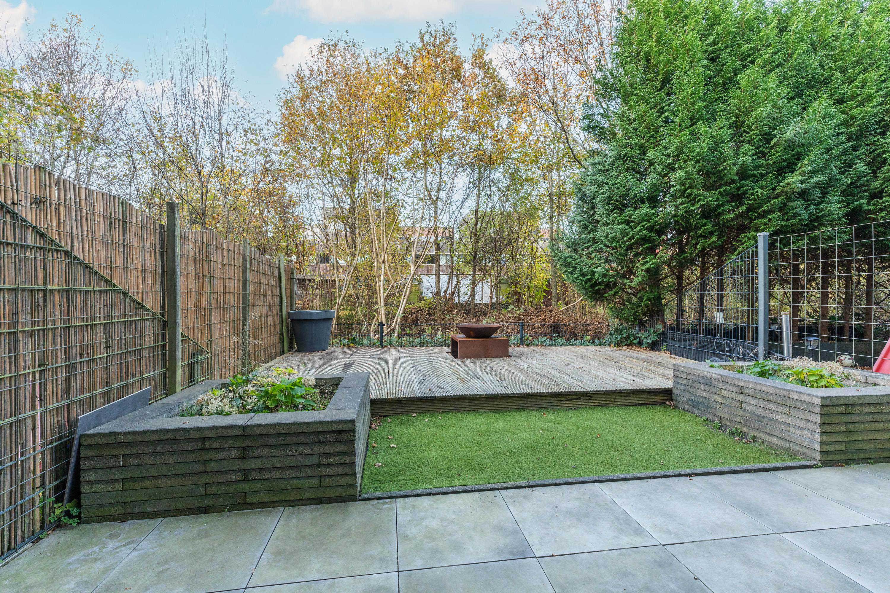 Via de schuifpui loop je zo de achtertuin in. De tuin is verzorgd aangelegd met grote tegels, gras en een houten vlonder. Voor liefhebbers van groen zijn er plantenbakken aangebracht. Dankzij de beschutte ligging, de afscheiding bij het terras en de groene begroeiing aan de achterzijde geniet je hier van veel privacy. Een buitenkraan maakt de tuin compleet.