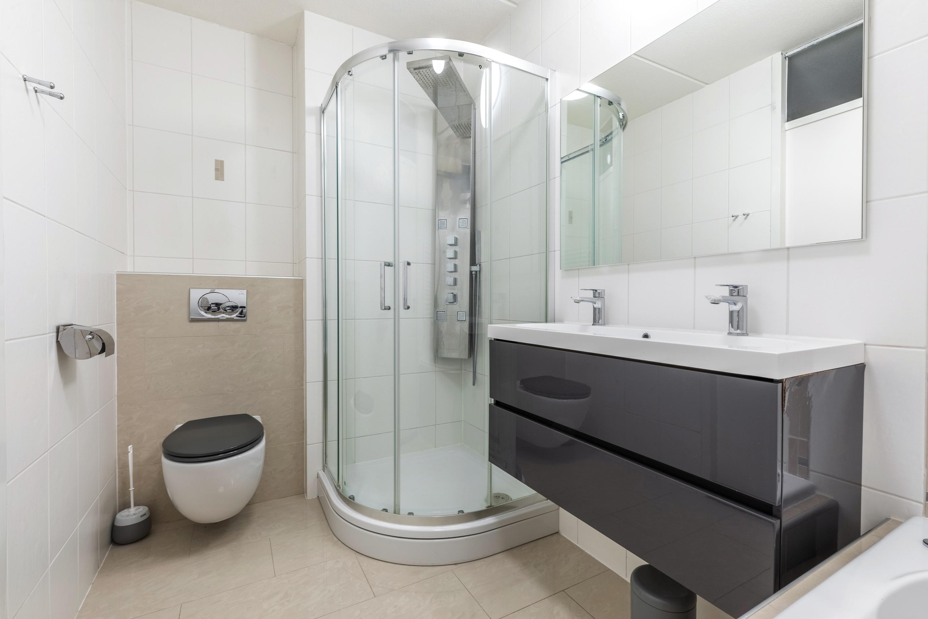The modern bathroom is the perfect place to unwind after a busy day. The room is equipped with a walk-in shower, jacuzzi bath, double sink with cabinet and a free-hanging toilet.