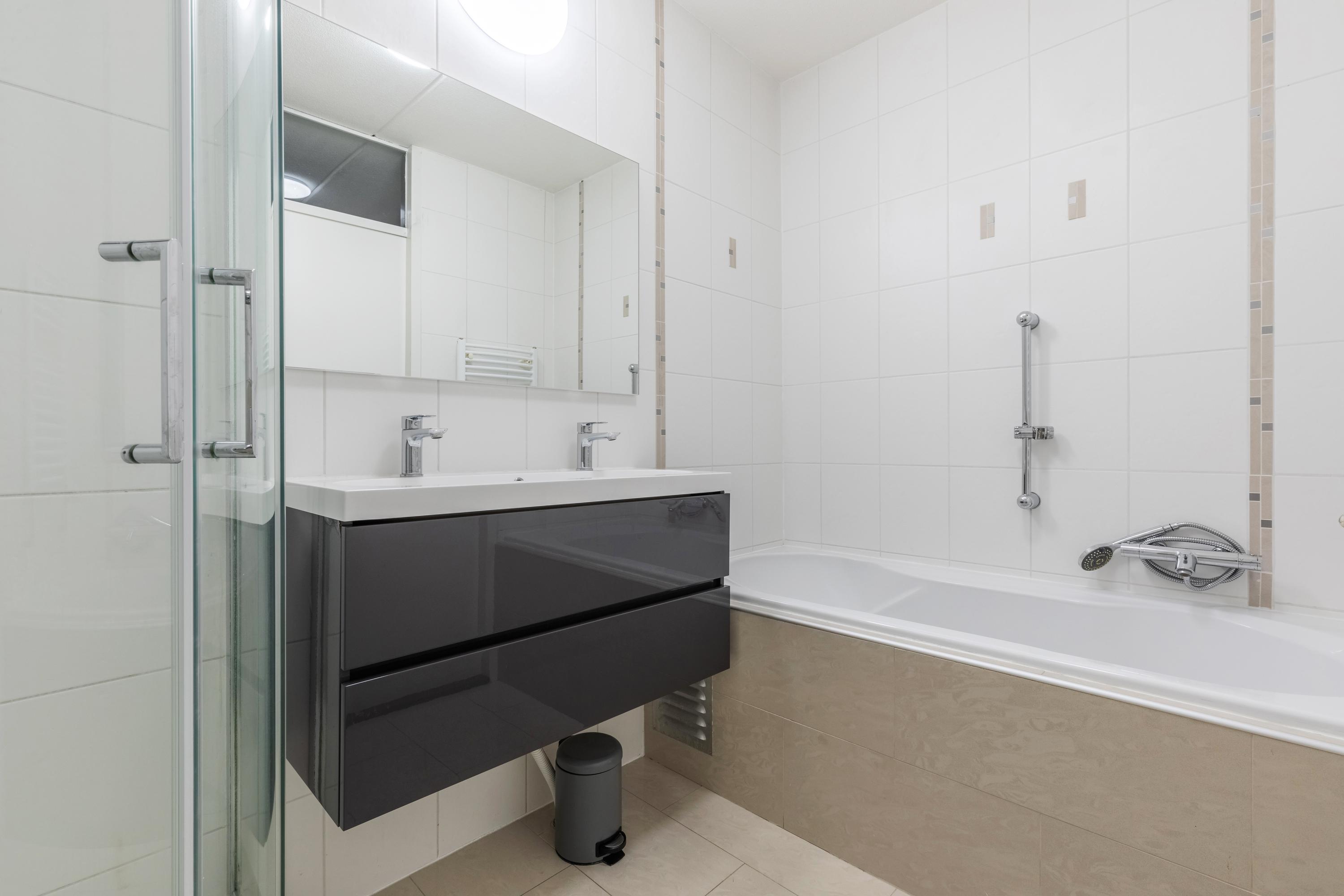 De moderne badkamer is de perfecte plek om na een drukke dag helemaal tot rust te komen. De ruimte is uitgerust met een inloopdouche, jacuzzi-ligbad, dubbele wastafel met meubel en een vrijhangend toilet.