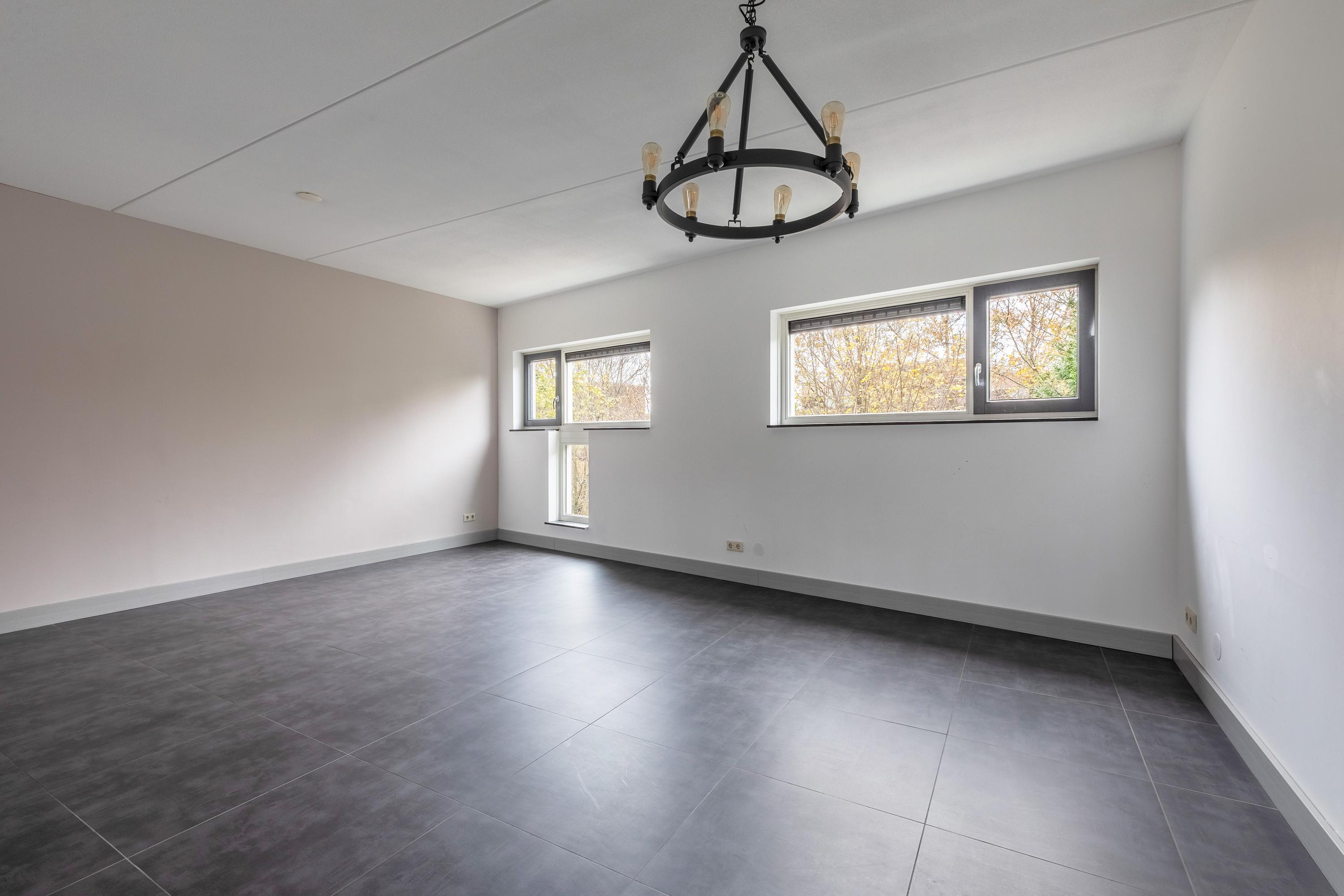 De ruime eetkamer ligt aan de tuinzijde en biedt een prettig uitzicht op het groen. De nette tegelvloer met vloerverwarming zorgt hier voor extra comfort.
