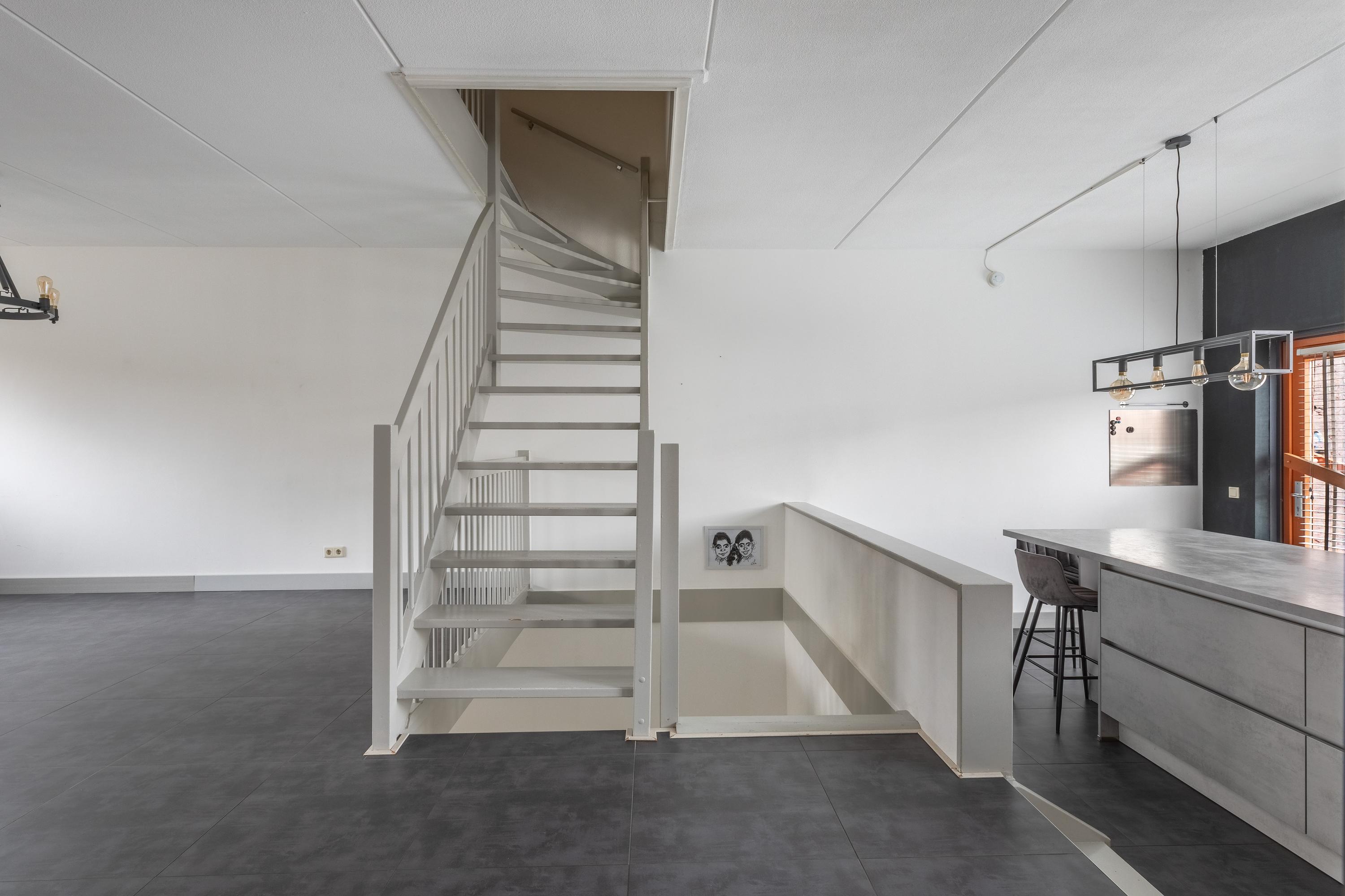 De eerste verdieping is volledig open gemaakt en ingericht als royale leefverdieping met aan de achterzijde de eetkamer en aan de voorzijde de keuken. Ideaal voor leuke momenten met familie en gezin.