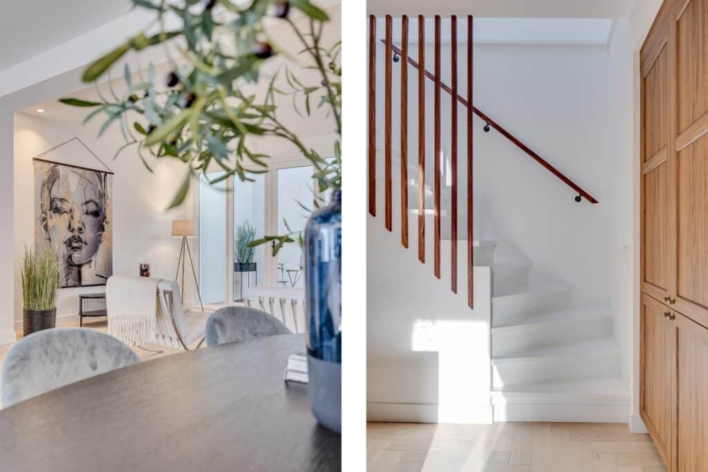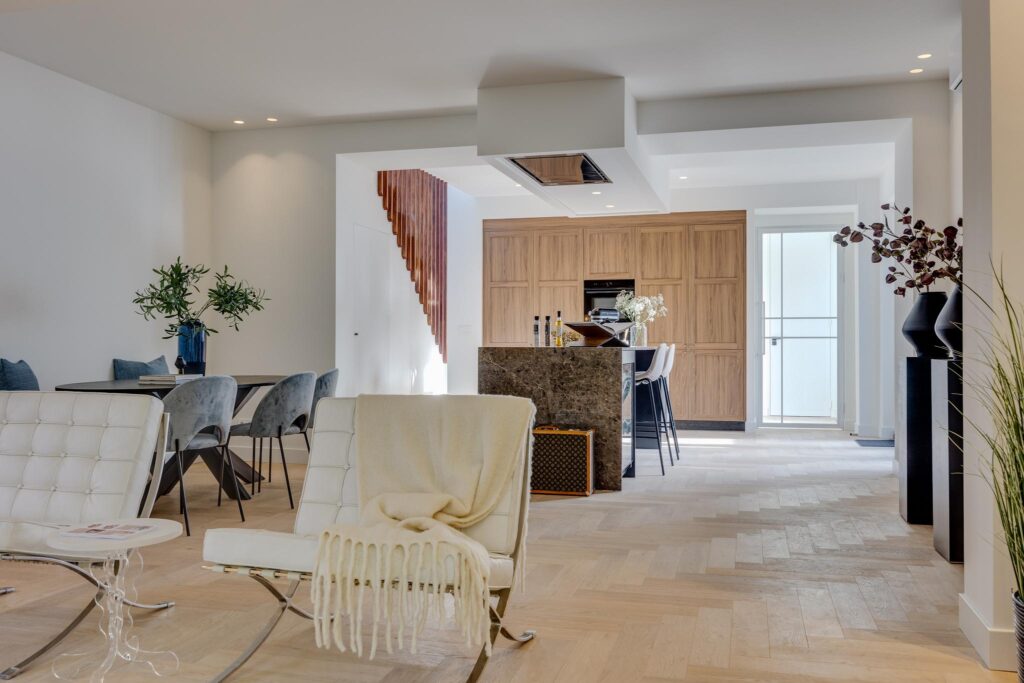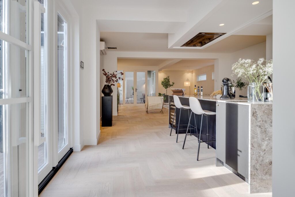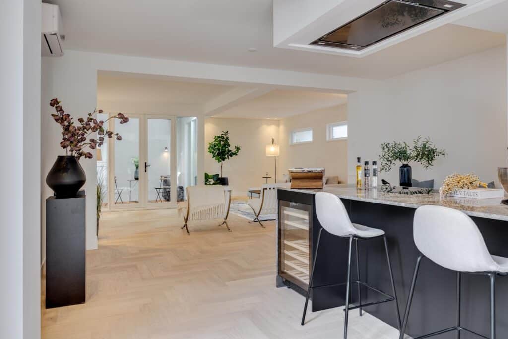 tot de kantoorruimte. De stijlvolle keuken met kookeiland is voorzien van alle hoogwaardige inbouwapparatuur waaronder een 6-pits inductiekookplaat, Quooker, 2 combi- ovens Wifi gestuurd met home connect systeem, vaatwasser, wijnklimaatkast en 2 koel-/vrieskasten. Door de openslaande deuren die grenzen aan de keuken, heeft u altijd zicht op de heerlijke buitenruimte. De ruime eet-/woonkamer grenst aan de prachtige inpandige patio, welke voor veel extra lichtinval zorgt. De volledige begane grond vloer is voorzien van vloerverwarming, airconditioning en een visgraatvloer. Via de trap met trapkast gaat u naar de eerste verdieping. Eerste verdieping: de overloop grenst aan 4 slaapkamers, een wasruimte, badkamer en een apart toilet. Twee slaapkamers beschikken over een luxe badkamer ensuite. Daarbij grenzen deze ook aan de inpandige patio, waarbij de master bedroom een frans balkon bezit. De master bedroom heeft een luxe badkamer met een vrijstaand bad, dubbele wastafel, toilet en inloopdouche. De overige badkamers beschikken over een wastafelmeubel en inloopdouche. De bovenverdieping is tevens voorzien van dakramen welke elektrisch bedienbaar zijn inclusief screens, een intercom met camera en bediening van de voordeur en airconditioning. Zolder: middels een vlizotrap is de zolder te bereiken en zorgt deze nog voor voldoende extra bergingsruimte. Bijzonderheden: - prachtige plek met alle voorzieningen bij de hand; - op loopafstand van het centrum; - volledig stijlvol gerenoveerde woning in historisch pand; - 4 slaapkamers en 3 badkamers, waarvan 2 ensuite; - vloerverwarming begane grond; - volledig voorzien van airconditioning; - mechanische installatie aanwezig; - volledig geïsoleerd; - oplevering kan snel; Een huis ziet, voelt en beleeft u pas echt tijdens een bezichtiging. Dat is hier nu reeds mogelijk. Dan pas ervaart u het “wauw gevoel” wat deze woning u geeft. Maak een afspraak en wij leiden u graag rond!