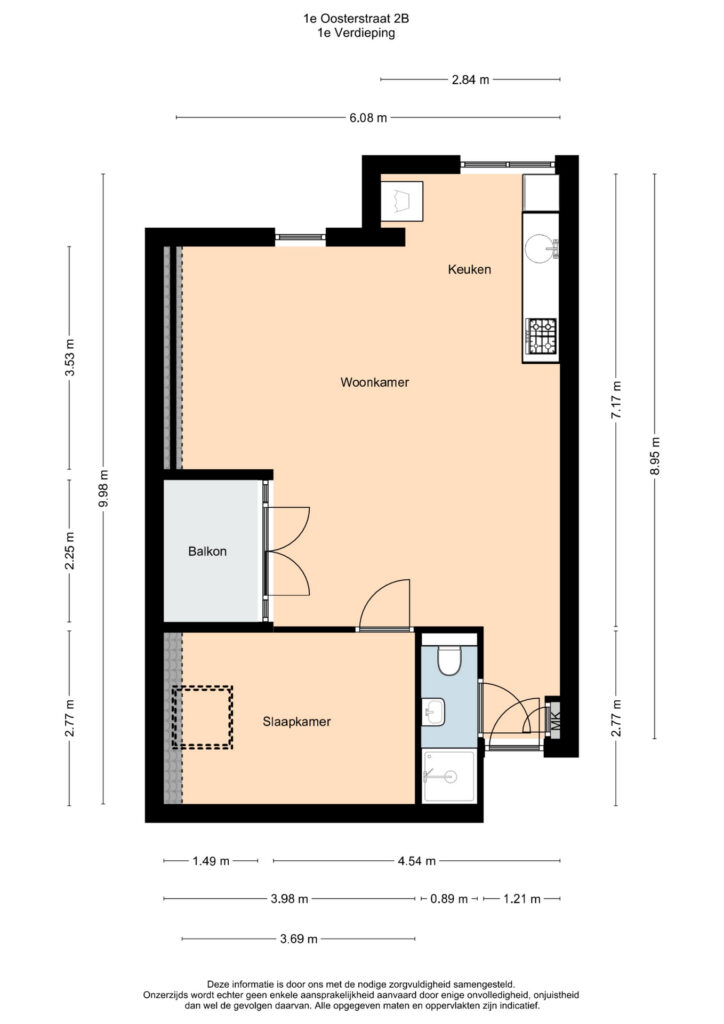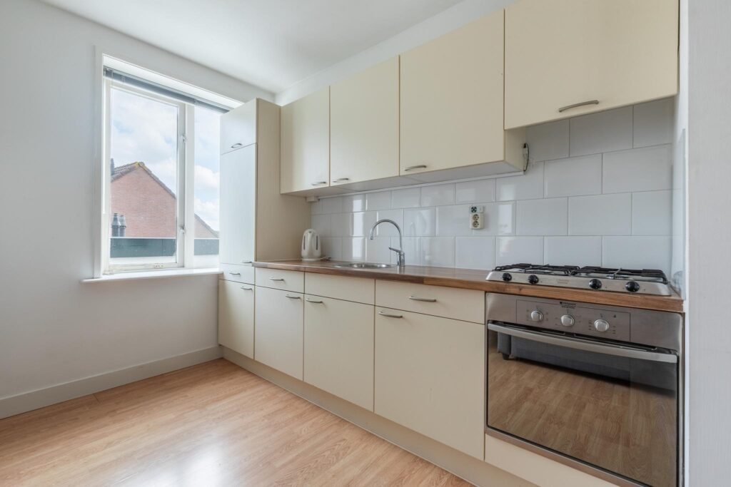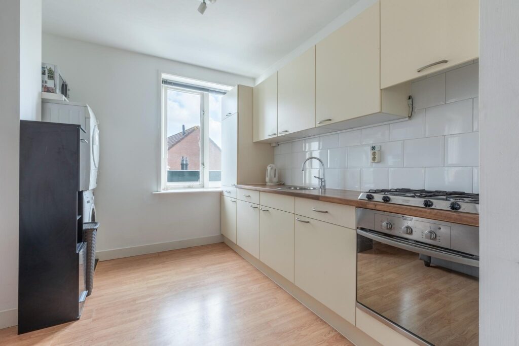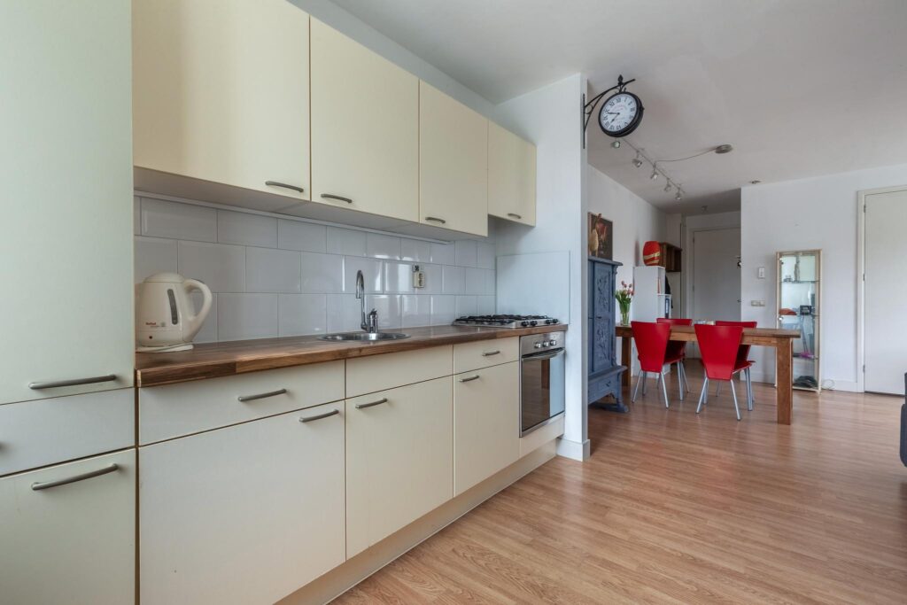 Indeling: entree/hal, meterkast, recent vernieuwde badkamer met douche, wastafelmeubel en toilet, ruime lichte woonkamer met toegang tot het balkon, keuken v.v. diverse inbouwapparatuur en een aansluiting voor een wasmachine, slaapkamer met ruime kledingkast.