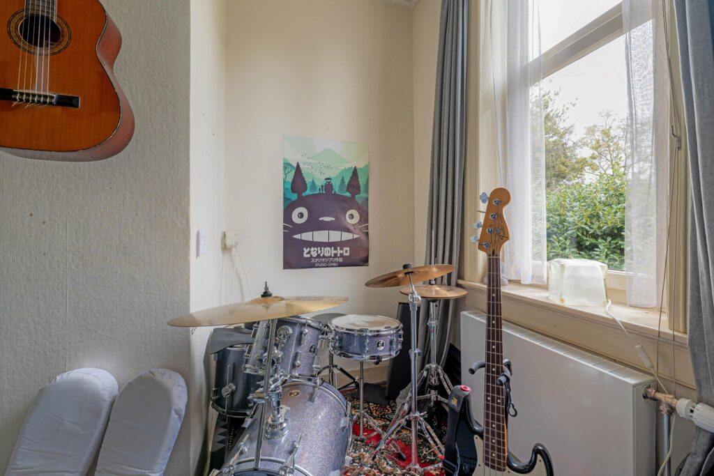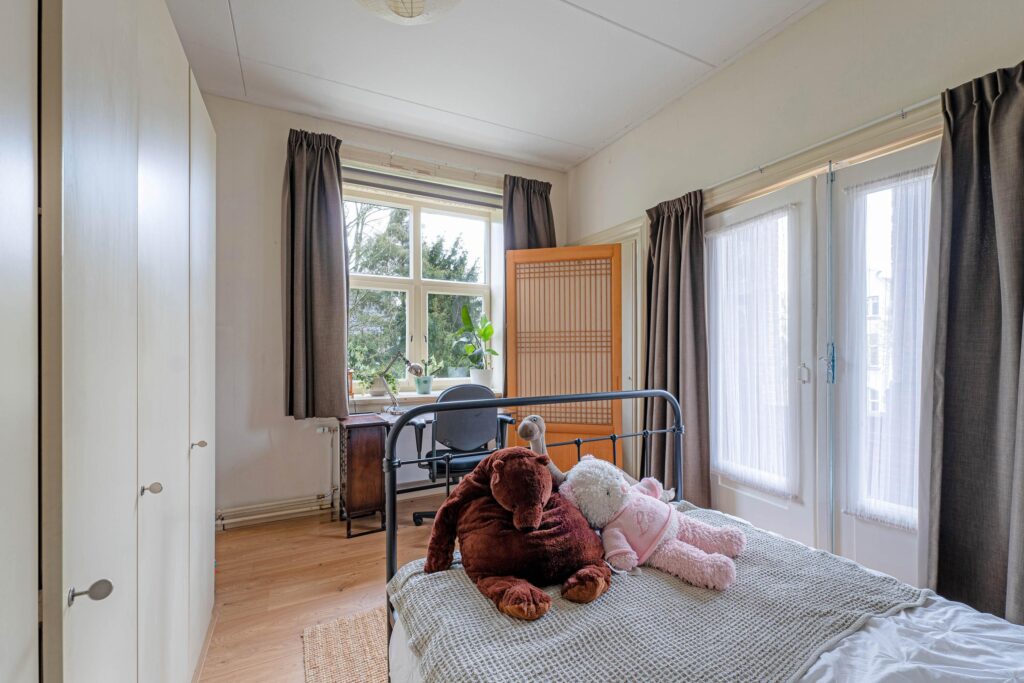 Aan de voorzijde bevinden zich twee slaapkamers, waarvan de grotere kamer toegang heeft tot een charmant balkon en een inpandige kleinere kamer - momenteel in gebruik als muziekstudio - biedt veelzijdige mogelijkheden en kan uitstekend dienen als inloopkast of rustige werkplek. Uiteraard is het ook mogelijk één grote ruimte te creëren.
