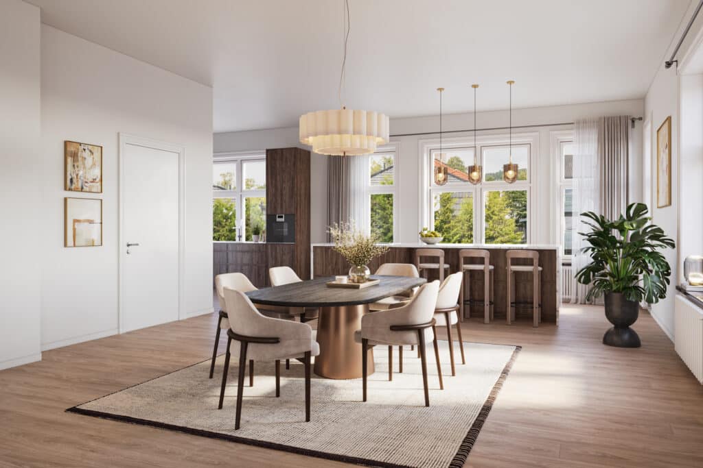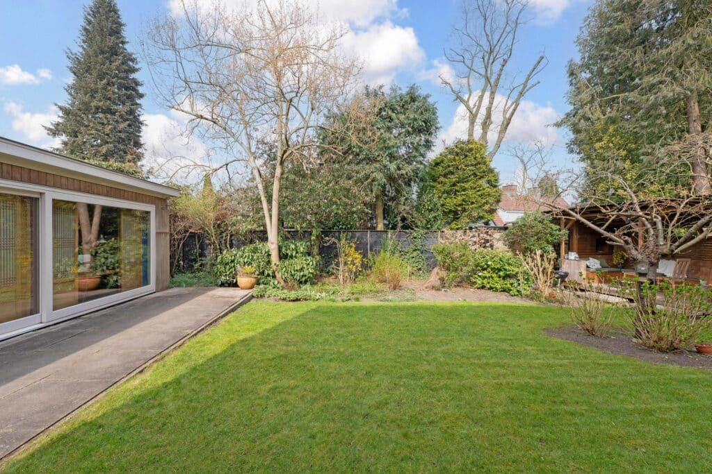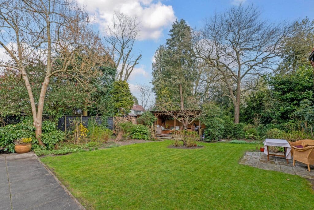 De royale woonkamer is voorzien van een sfeervolle schouw en openslaande deuren naar het zonnige terras in de voortuin. Aansluitend bevinden zich de eetkamer en de tuinkamer, die via dubbele deuren direct toegang bieden tot de zonnige achtertuin. Deze ruimtes kunnen eventueel samengevoegd worden tot één grote open leefruimte, wat zorgt voor een moderne en open woonbeleving.