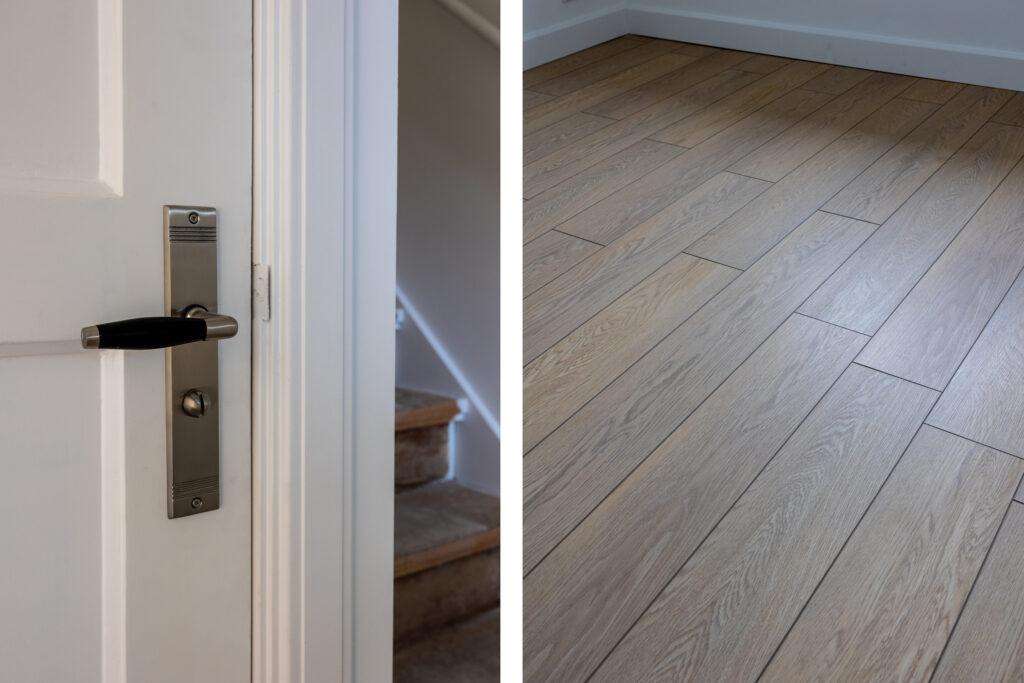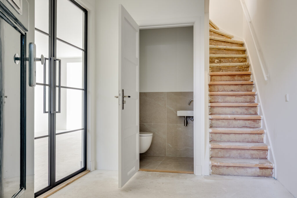 De gehele begane grond is strak afgewerkt en o.a. voorzien van mooie dubbele taatsdeur, inbouwspots en strak gestucte wanden. Tevens is de volledige vloer vervangen voor een betonnen vloer met isolatie en vloerverwarming.