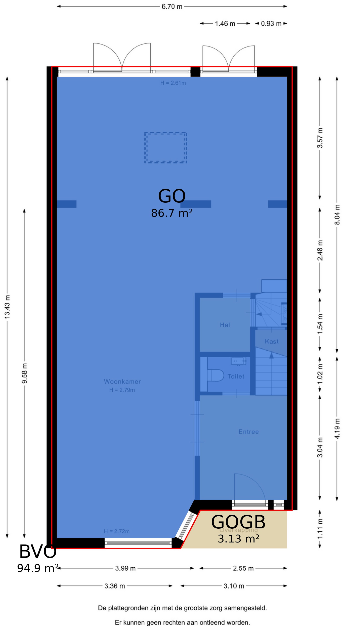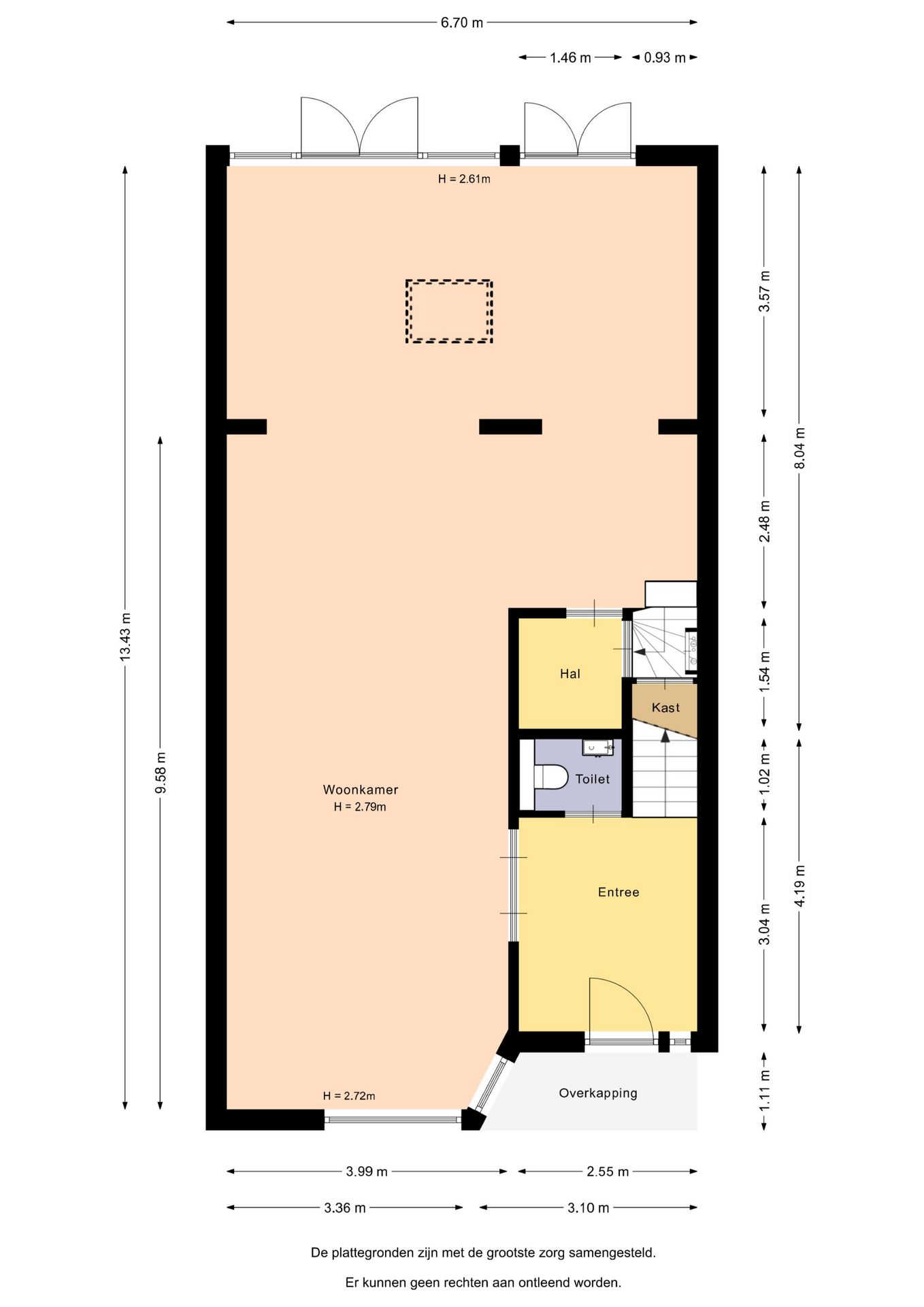 Begane grond: Via de diepe voortuin bereikt u de overdekte entree met ruime hal en modern toilet. Middels dubbele taatsdeuren bereikt u de ruime woonkamer met erker aan de voorzijde. De woning is aan de achterzijde volledig uitgebouwd en v.v. brede pui met openslaande deuren naar de tuin en een lichtstraat voor extra lichtinval.