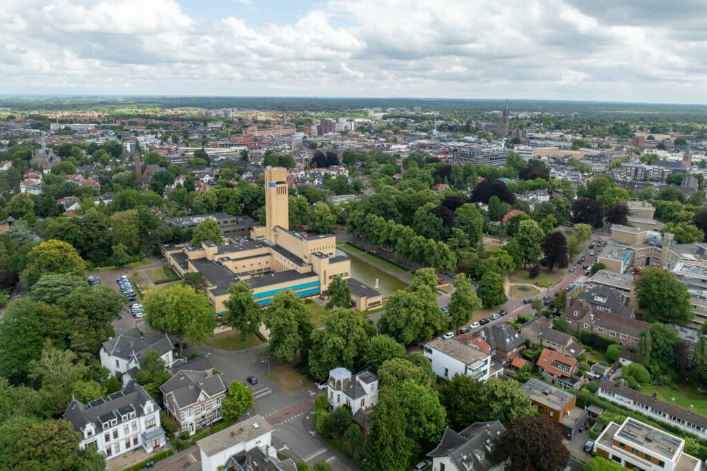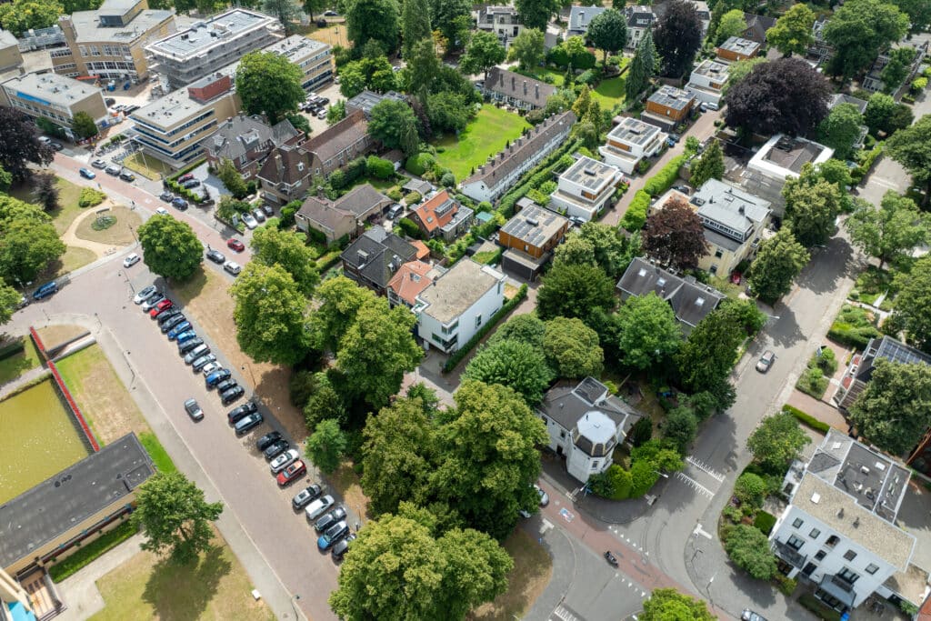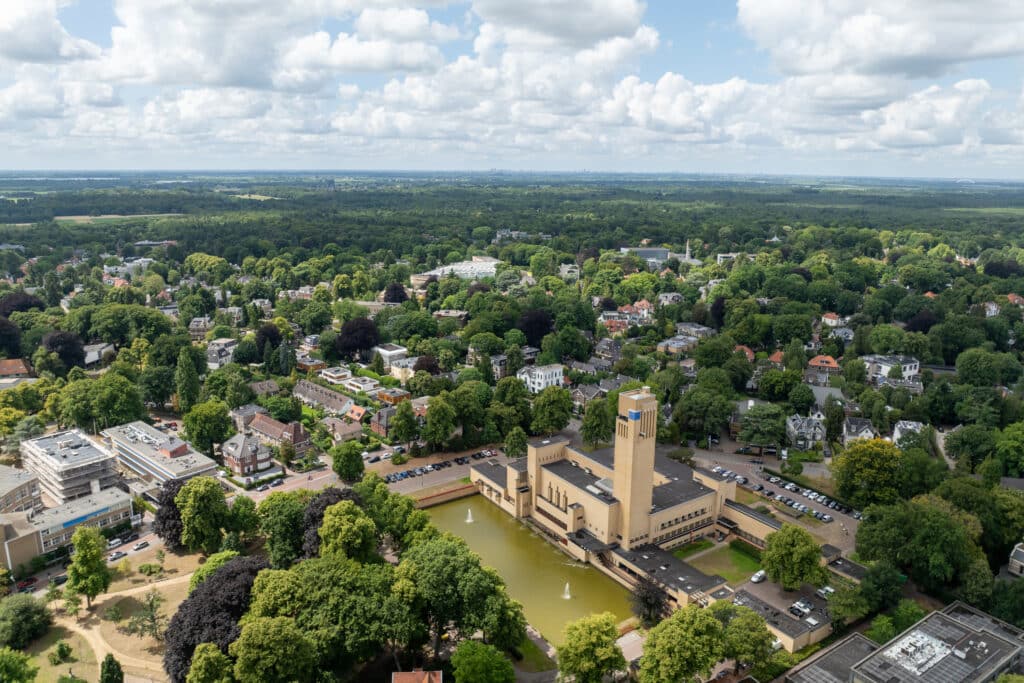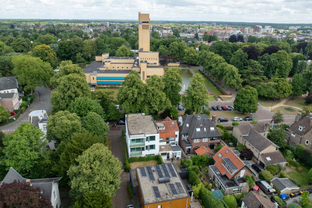 Wat deze locatie écht bijzonder maakt, is de ligging in het Raadhuiskwartier. Deze statige wijk dankt haar naam aan het iconische Raadhuis van Hilversum, een internationaal beroemd architectonisch meesterwerk van Willem Marinus Dudok. Het raadhuis, met zijn strakke lijnen, imposante toren en prachtige ligging in het groen, geeft de buurt een unieke uitstraling en allure.