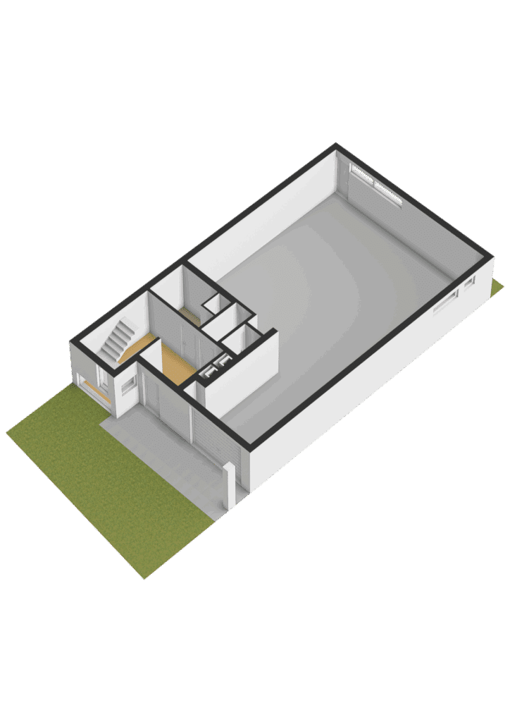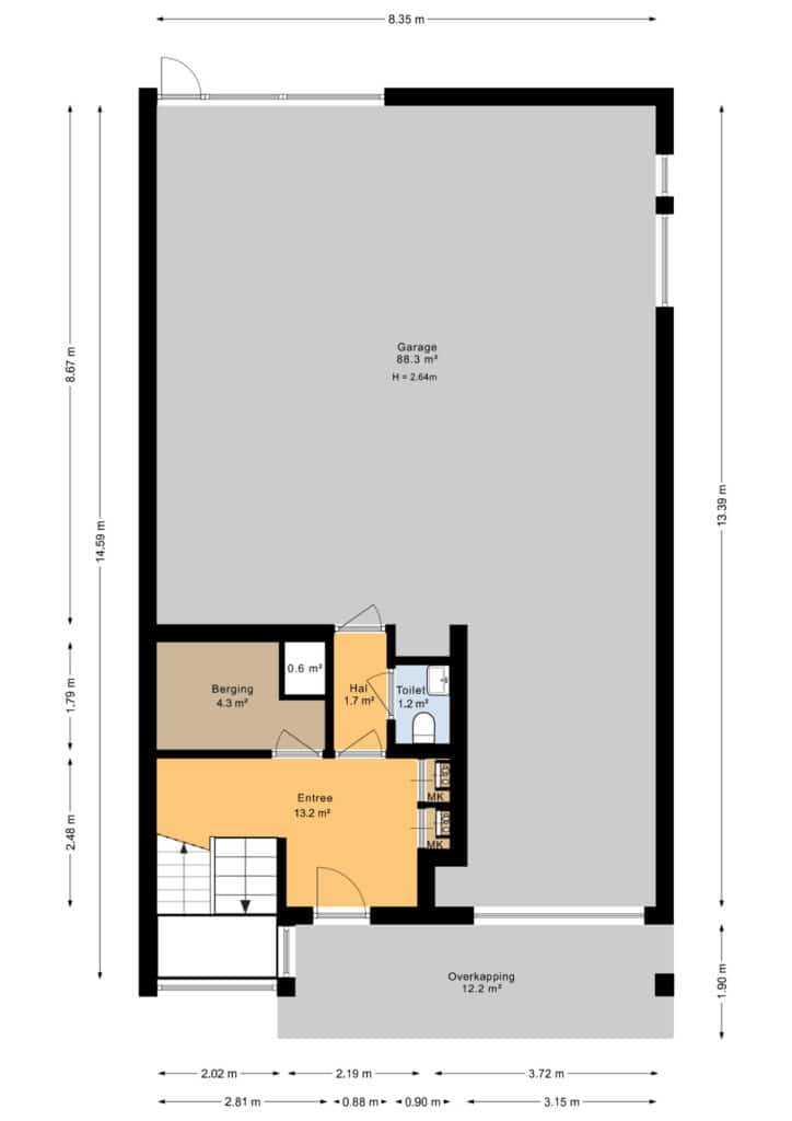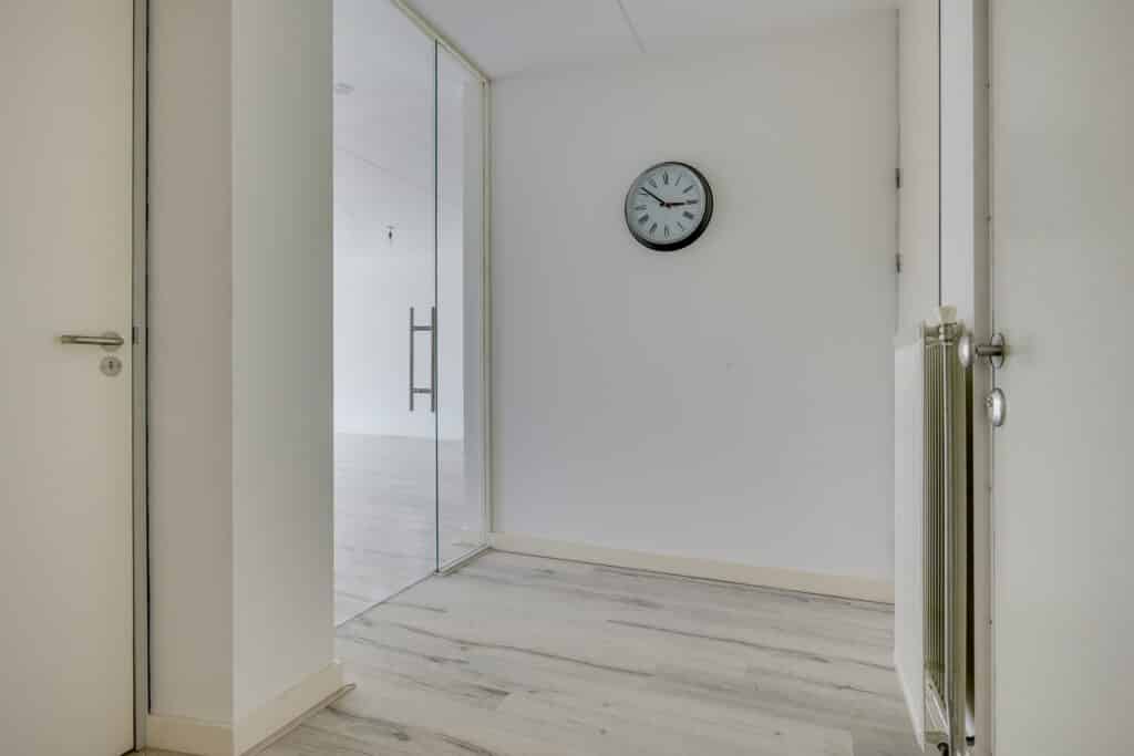 Bij binnenkomst via de centrale entree komt u in de hal, die u direct toegang geeft tot alle vertrekken. Links bevindt zich toilet en een praktische berging – ideaal voor het opbergen van voorraad en huishoudelijke spullen.