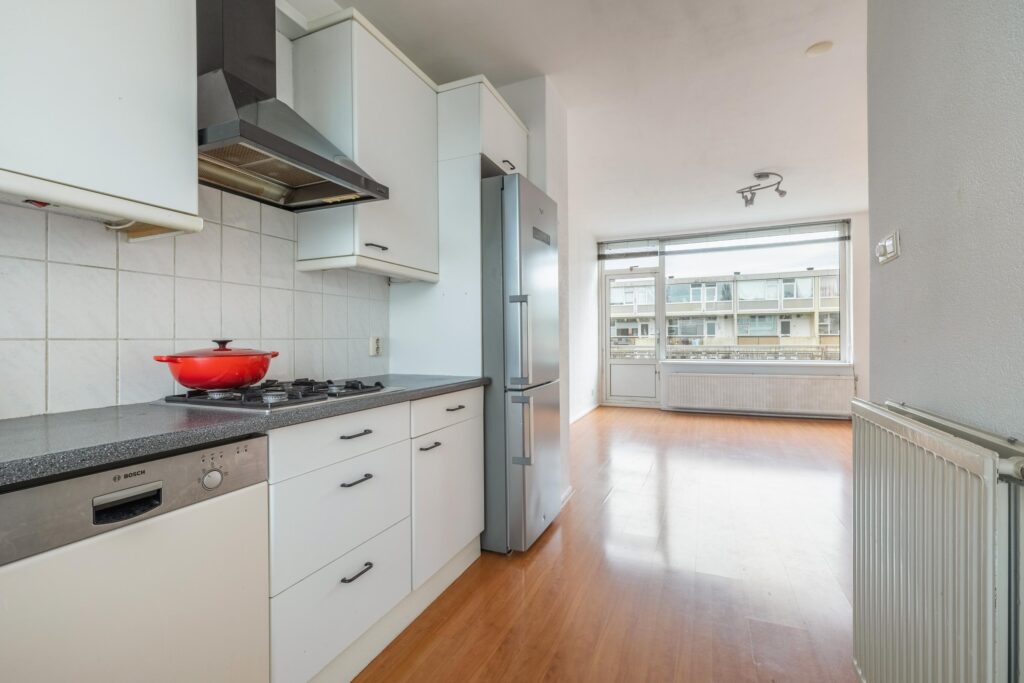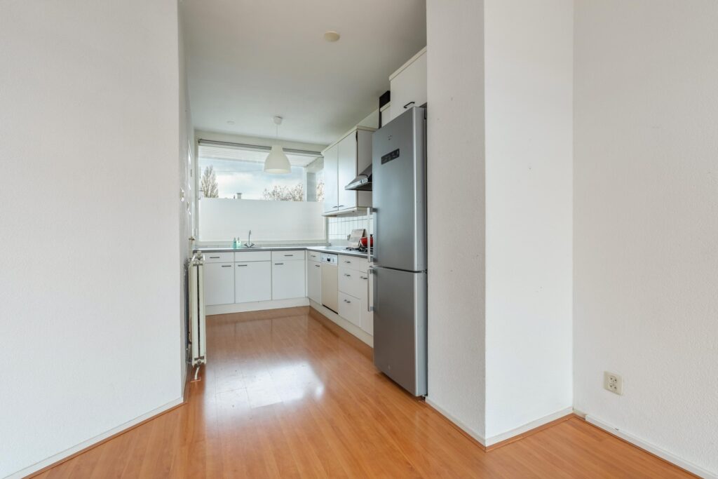 Entree, hal, toilet, lichte woonkamer met deur naar het balkon en een open keuken voorzien van inbouwapparatuur (o.a. koelkast en 4-pits gaskookplaat).