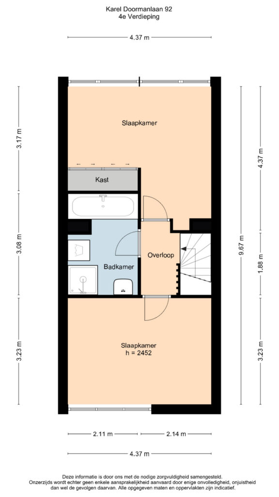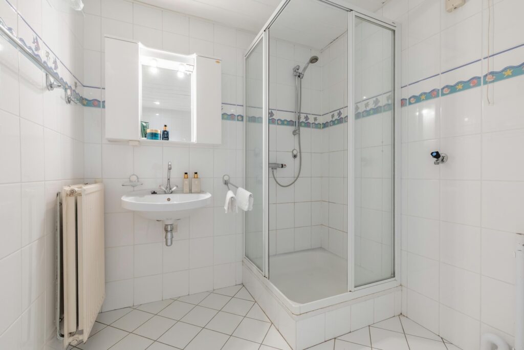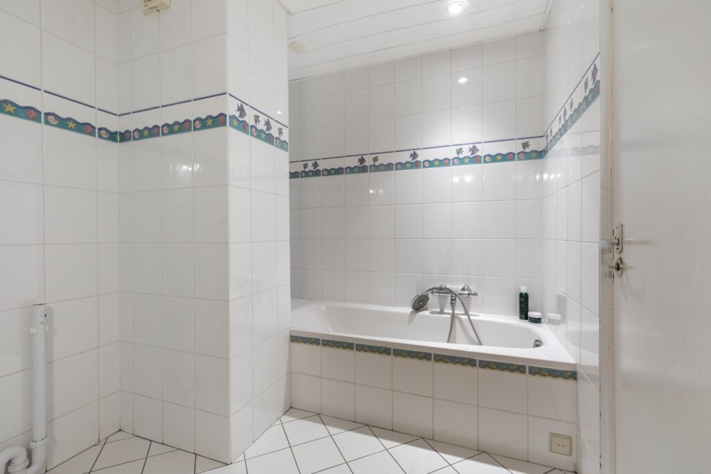 Verdieping: overloop, 2 ruime slaapkamers (voorheen 3) met vaste kasten en een moderne, complete badkamer met ligbad, separate douche, vaste wastafel en aansluitingen voor wasmachine en droger.