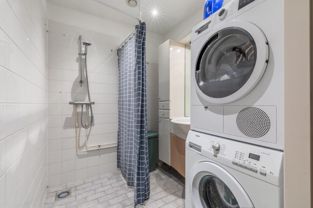 De badkamer beschikt over een douche, wastafel en de aansluitingen voor wasmachine en droger. Daarnaast is er een aparte ruimte voor de cv-installatie.
