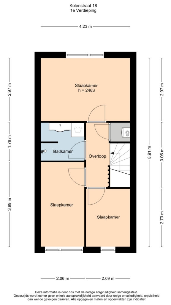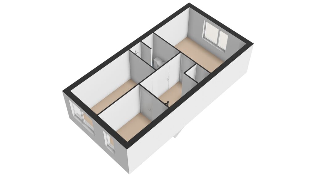 De overloop geeft toegang tot drie slaapkamers. Aan de achterzijde de hoofdslaapkamer. Aan de voorzijde twee slaapkamers.