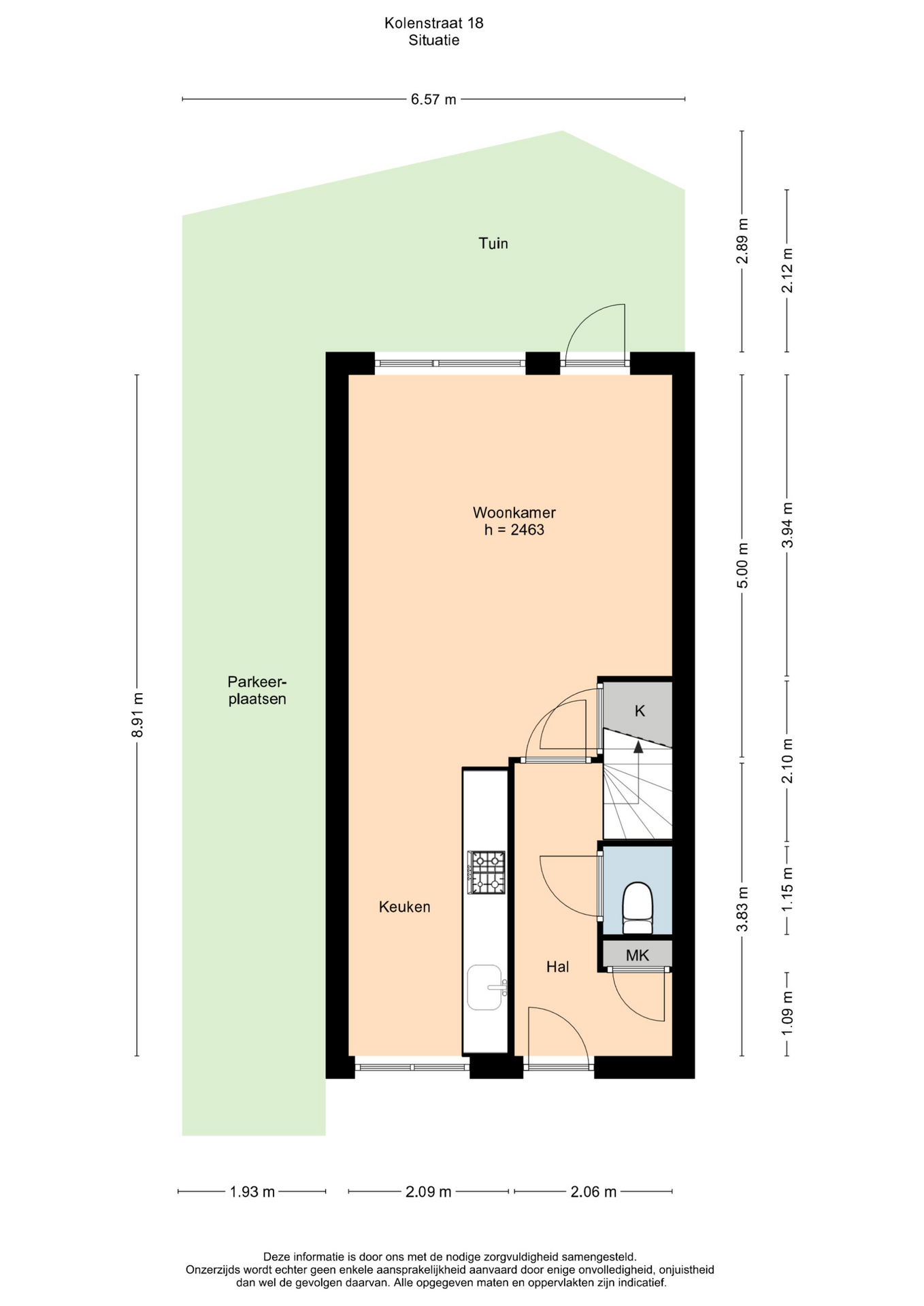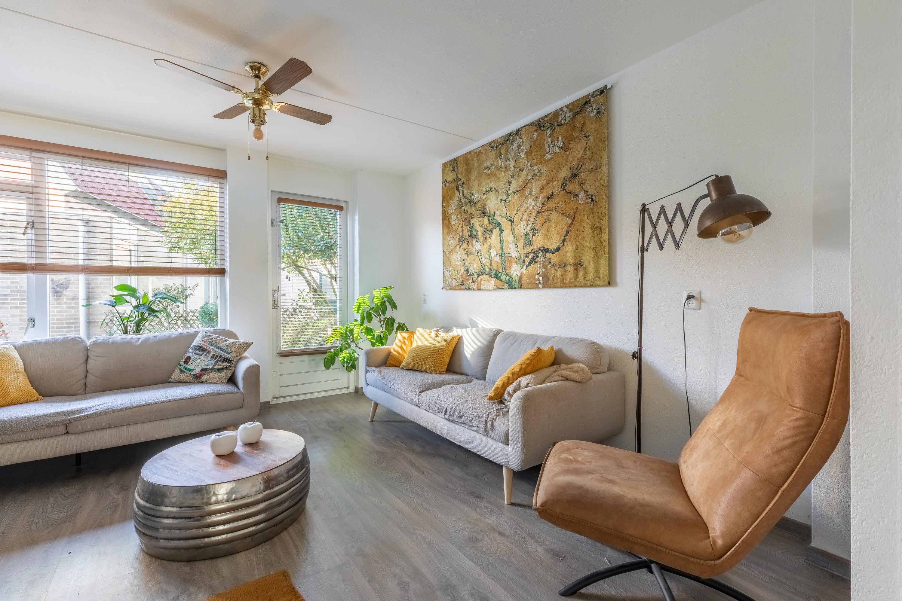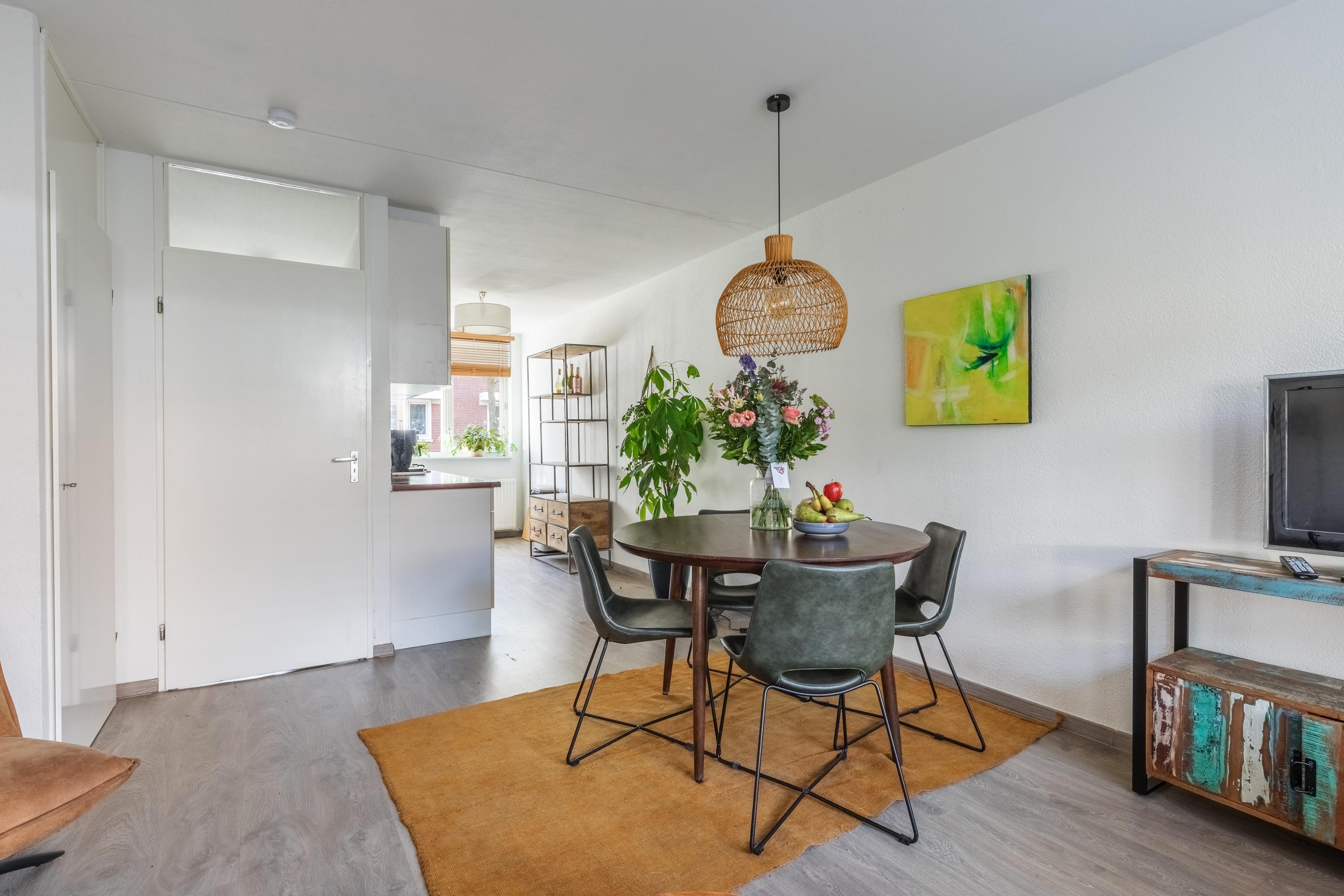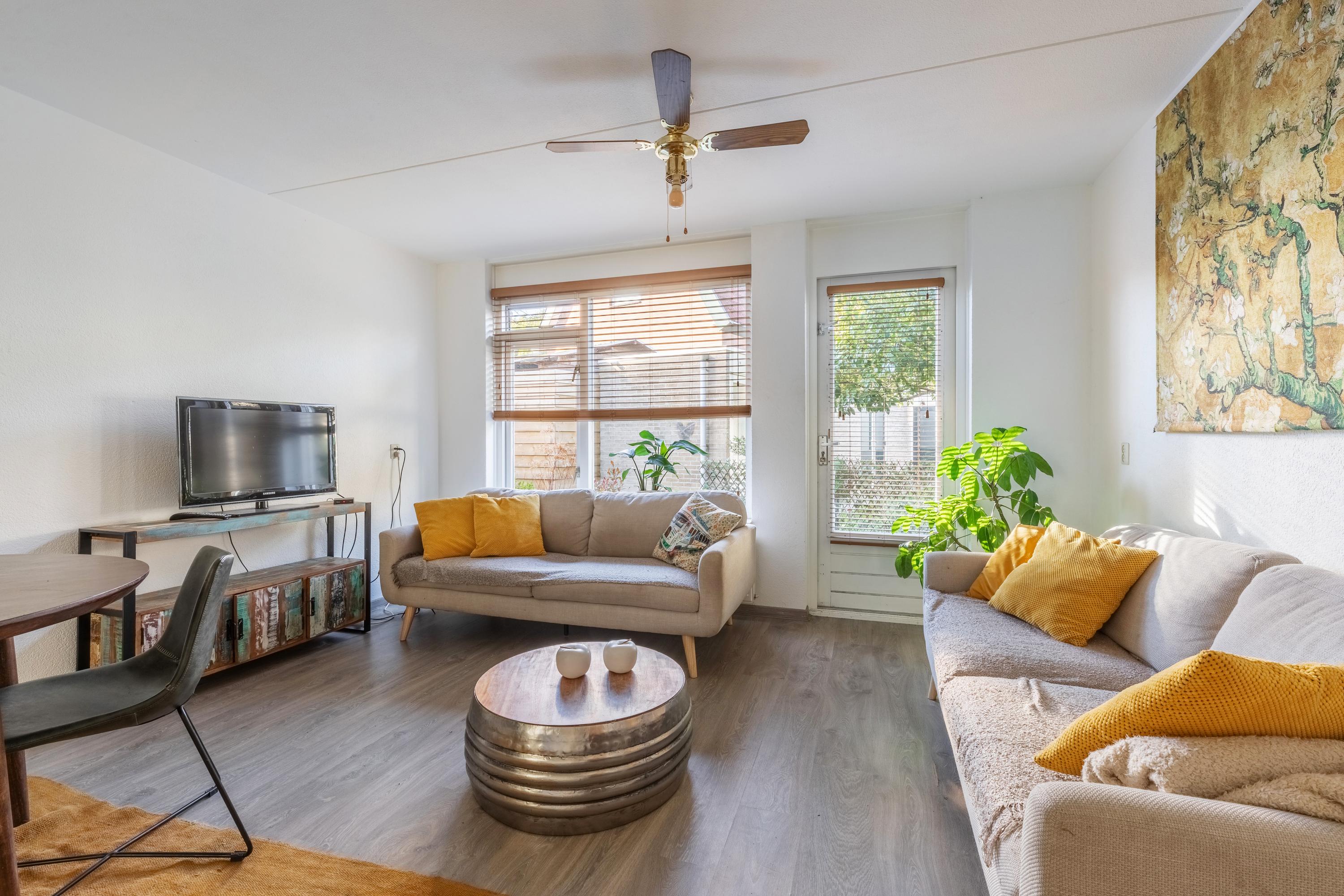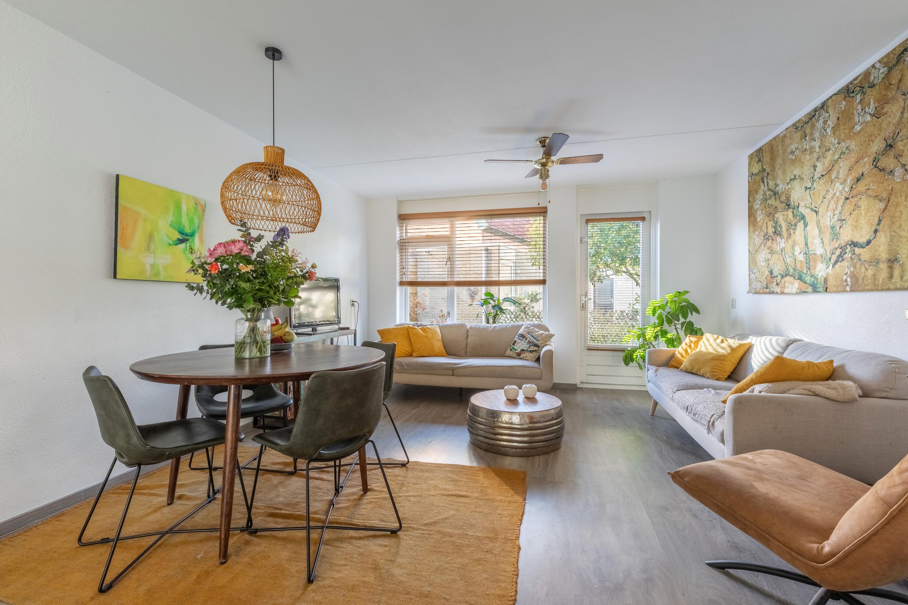 Via de entree kom je in de hal met toilet en trapopgang. De lichte woonkamer biedt toegang tot de tuin en voelt prettig ruim aan.