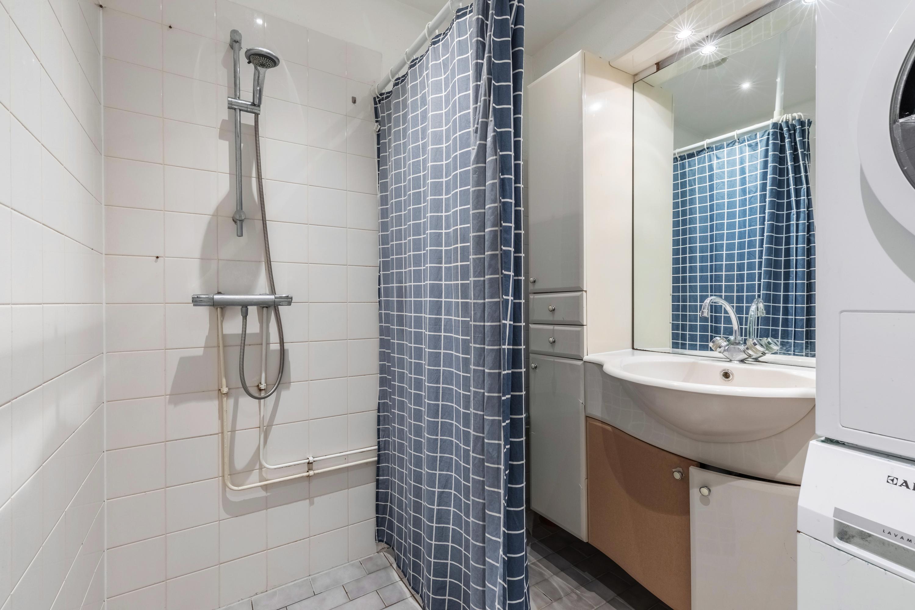 De badkamer beschikt over een douche, wastafel en de aansluitingen voor wasmachine en droger. Daarnaast is er een aparte ruimte voor de cv-installatie.