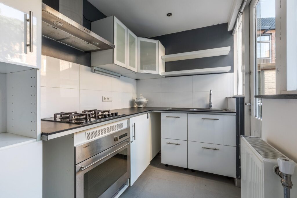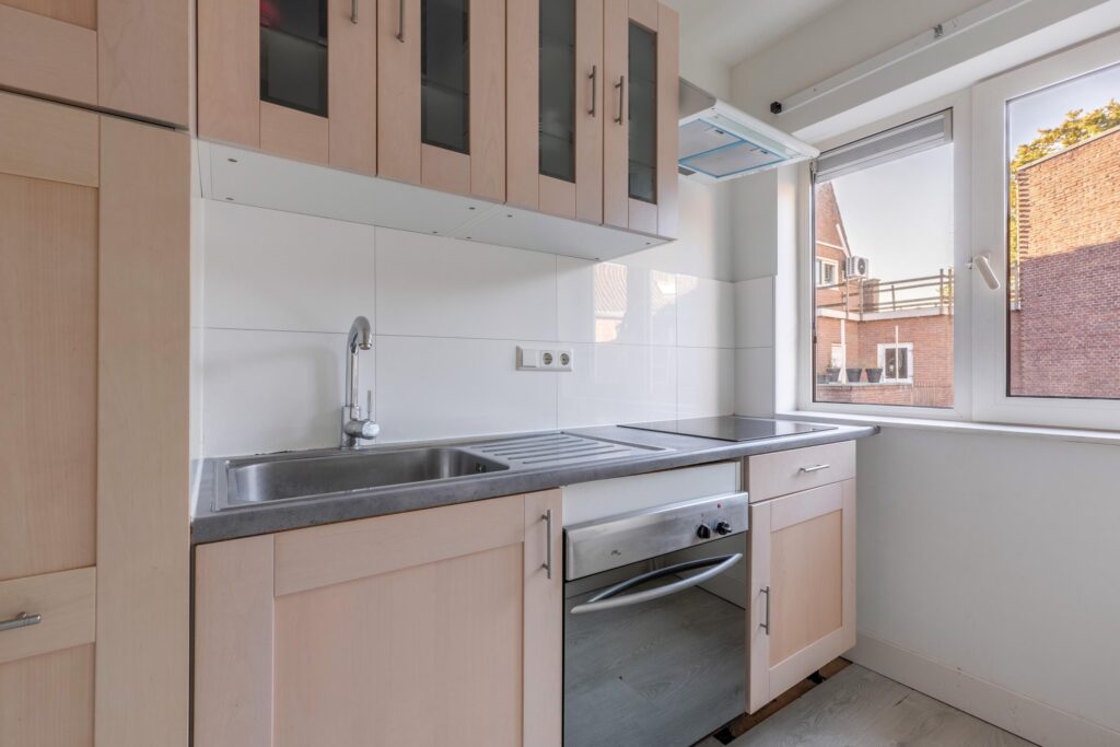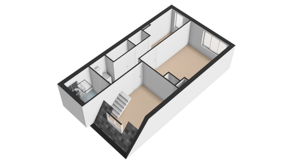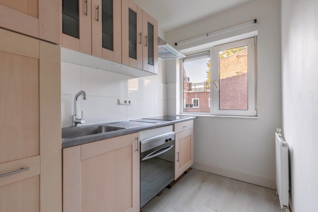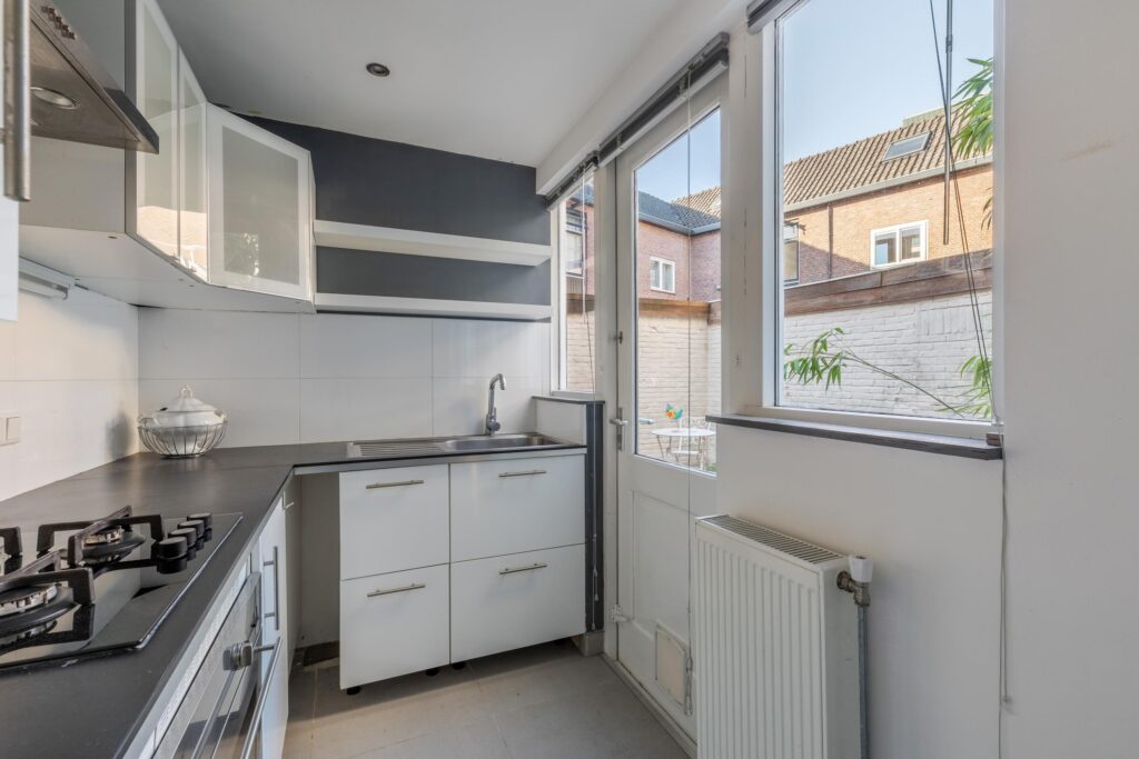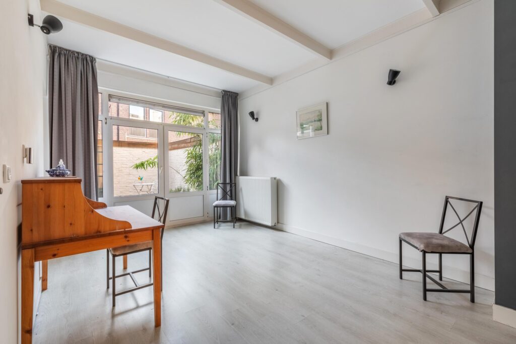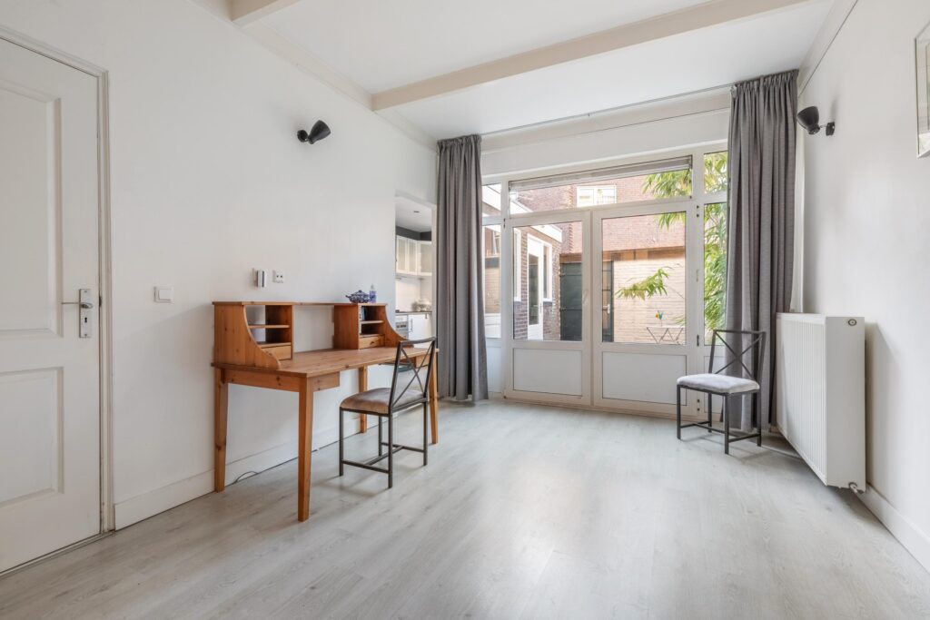Begane grond: entree met hal, trap naar de stahoge kelder en een toilet met fonteintje. Tevens bevindt zich op deze etage een badkamer met douche en wastafel. De lichte woonkamer heeft een prettige zithoek aan de voorzijde en voldoende ruimte voor een royale eethoek aan de tuinzijde. Aan de achterzijde ligt de open keuken, voorzien van een keukenblok met spoelbak, 4-pits gasfornuis en afzuigkap. Via openslaande deuren bereikt u de gezellige stadstuin met achterom, waar zich tevens een berging bevindt – ideaal voor fietsen en extra opslag.