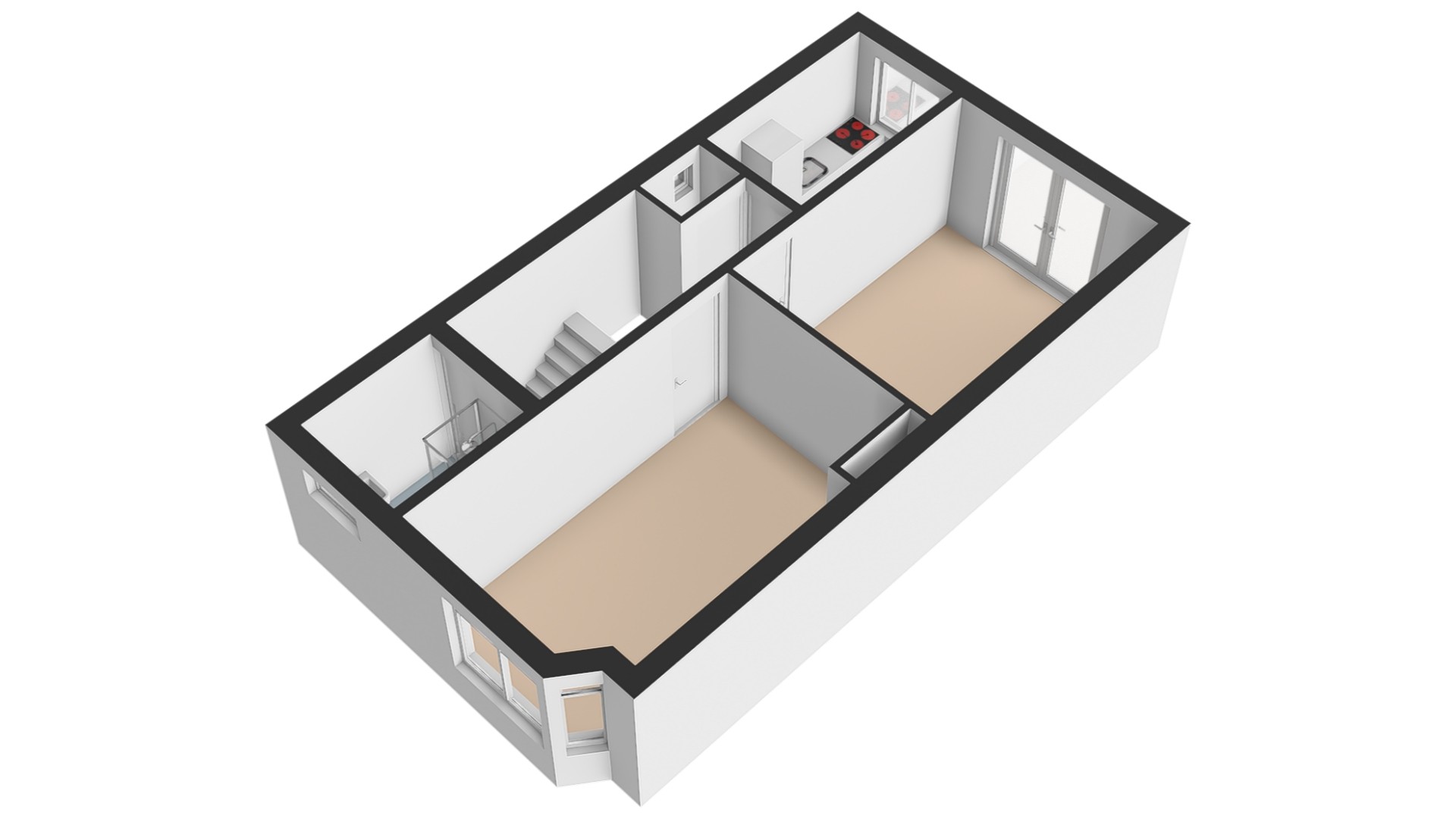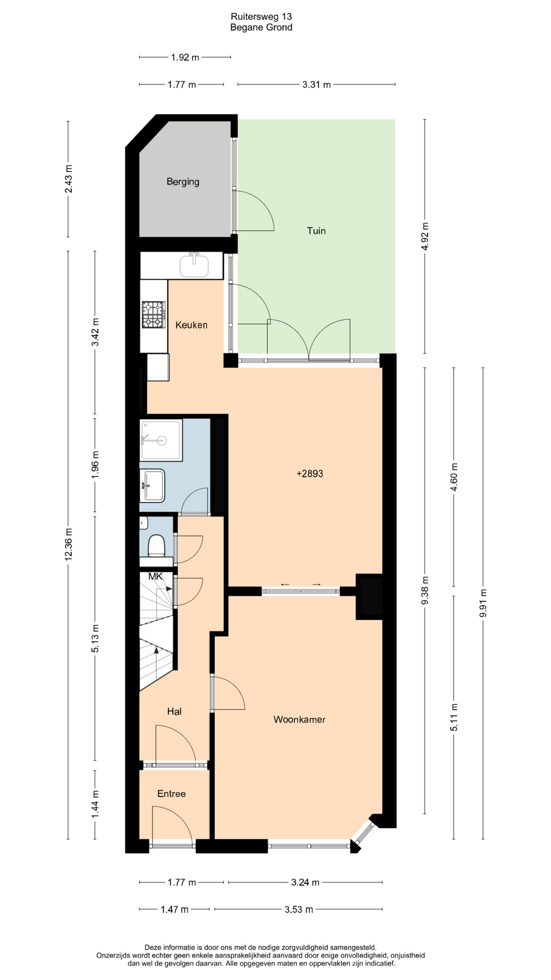 Begane grond: entree met hal, trap naar de stahoge kelder en een toilet met fonteintje. Tevens bevindt zich op deze etage een badkamer met douche en wastafel. De lichte woonkamer heeft een prettige zithoek aan de voorzijde en voldoende ruimte voor een royale eethoek aan de tuinzijde. Aan de achterzijde ligt de open keuken, voorzien van een keukenblok met spoelbak, 4-pits gasfornuis en afzuigkap. Via openslaande deuren bereikt u de gezellige stadstuin met achterom, waar zich tevens een berging bevindt – ideaal voor fietsen en extra opslag.