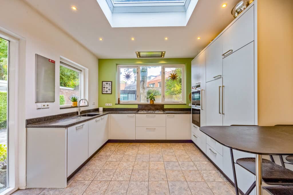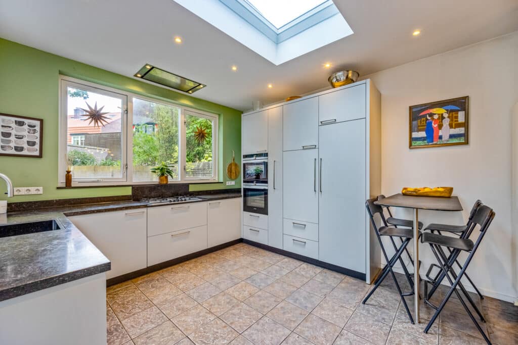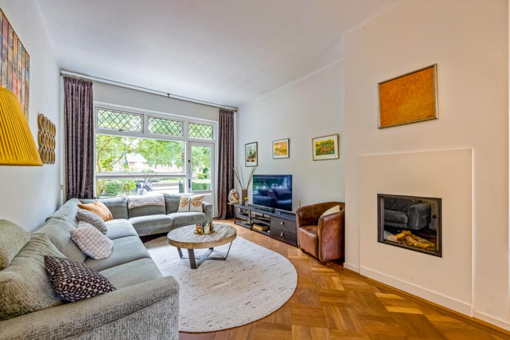Via de entree betreedt u de vestibule en hal, voorzien van een fraaie granito vloer. Hier bevindt zich het gastentoilet met fontein en toegang tot de stahoge kelder. De royale woon-eetkamer is licht en ruim en beschikt over een sfeervolle open haard en een praktische leeshoek. Aansluitend ligt de moderne woonkeuken, volledig uitgerust met inbouwapparatuur.