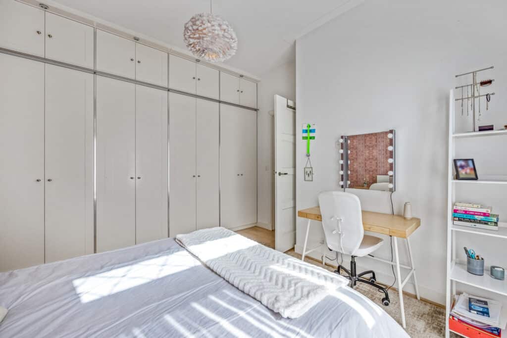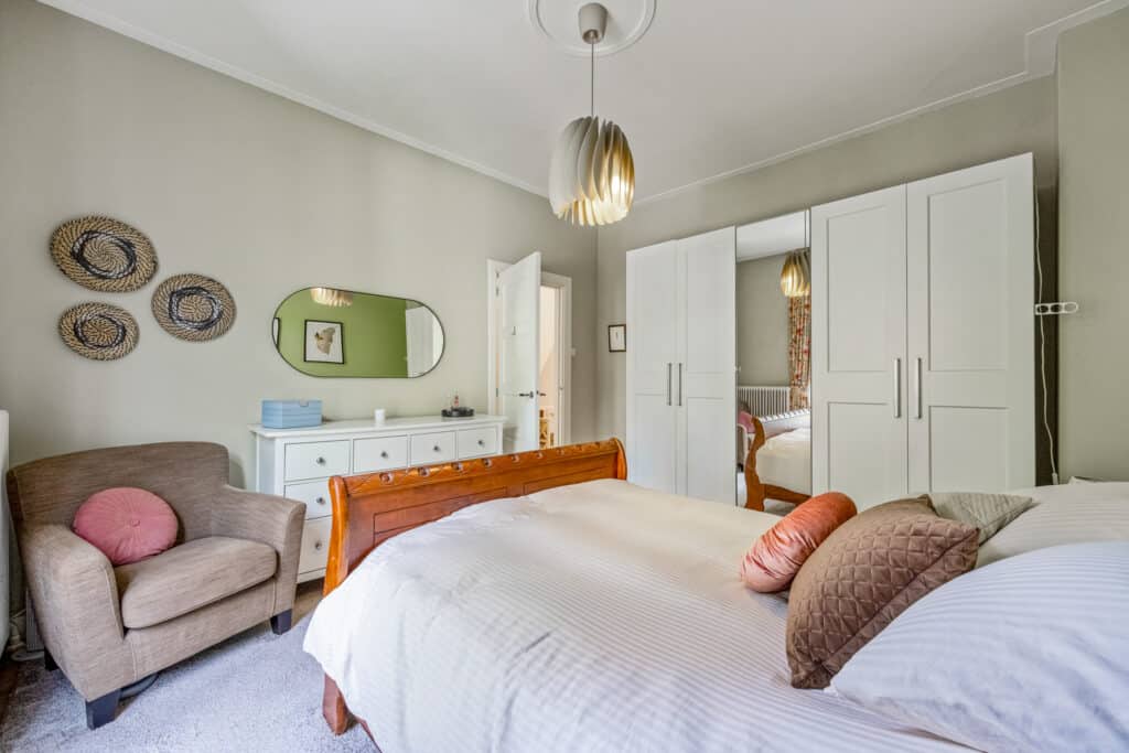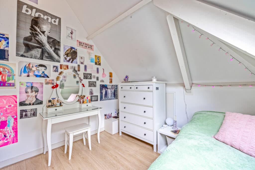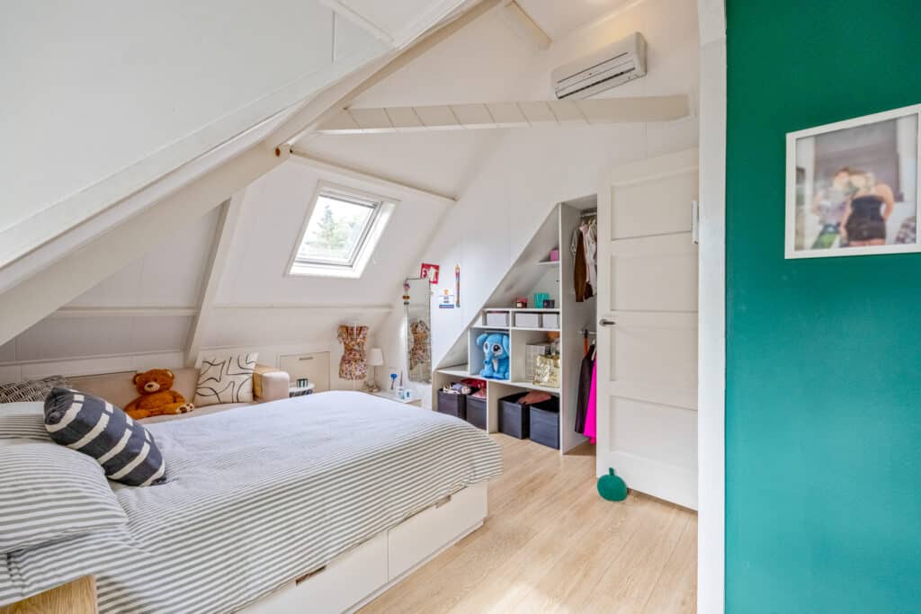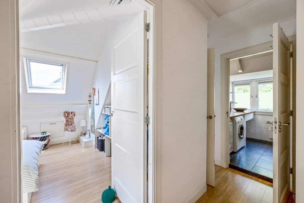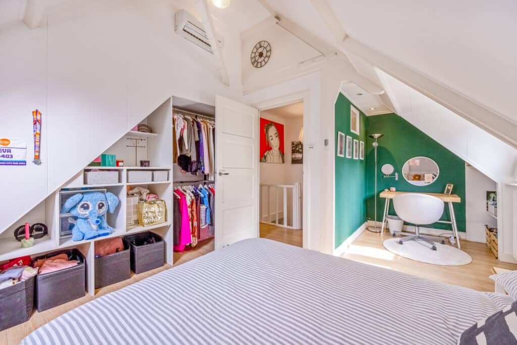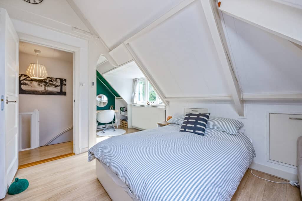 Een vaste trap leidt naar de tweede verdieping, die stijlvol en keurig is afgewerkt. Hier vindt u een speelse, L-vormige vierde slaapkamer met veel bergruimte, evenals een vijfde slaapkamer aan de achterzijde. Deze verdieping heeft bovendien een tweede moderne badkamer met inloopdouche, wastafel en derde toilet. Tevens is er ruimte voor de wasmachine en droger, en een aparte kast met de c.v.-opstelling.