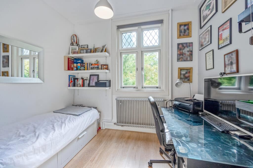 Op de eerste verdieping bevinden zich twee royale slaapkamers en een derde, wat kleinere kamer die zich uitstekend leent als kinderkamer of werkkamer. De moderne badkamer is luxe afgewerkt en beschikt over een ligbad, een separate inloopdouche, een dubbel wastafelmeubel en een tweede toilet.