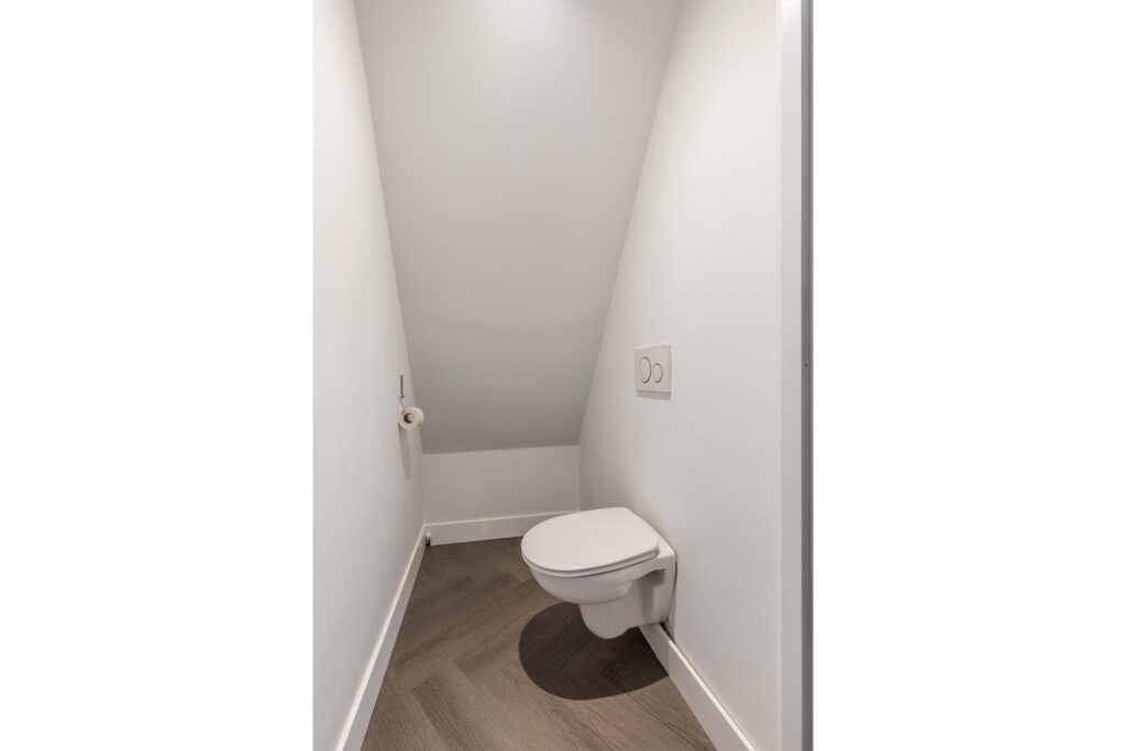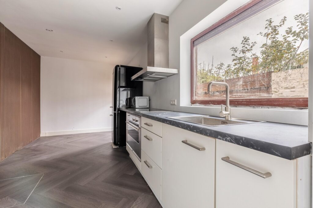 Entree met toilet. De woning beschikt over een ruime en lichte woonkamer. Aan de achterzijde bevindt zich de moderne keuken, voorzien van een SMEG