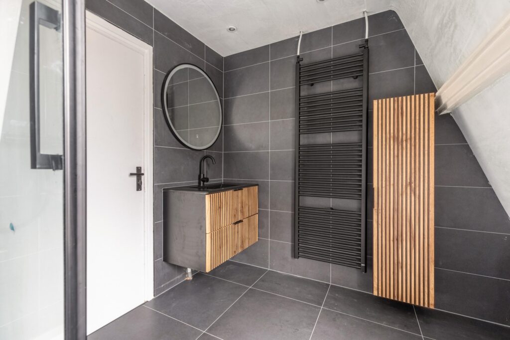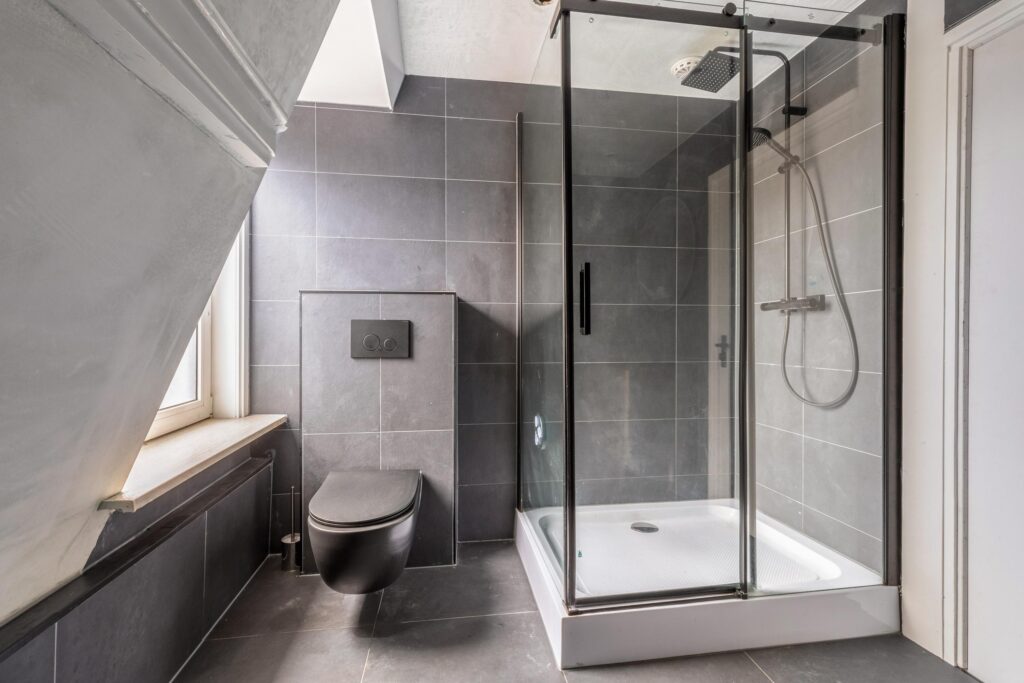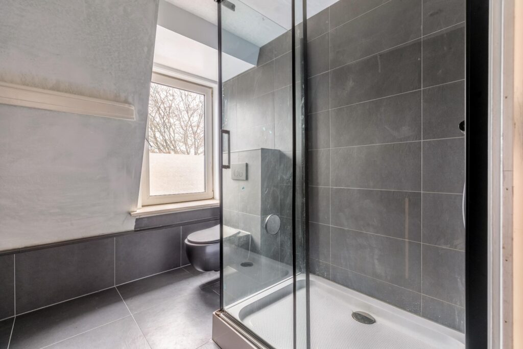 Overloop met toegang tot twee slaapkamers van goed formaat en een groot dakterras. De moderne badkamer is uitgerust met een douche, wastafelmeubel en tweede toilet.