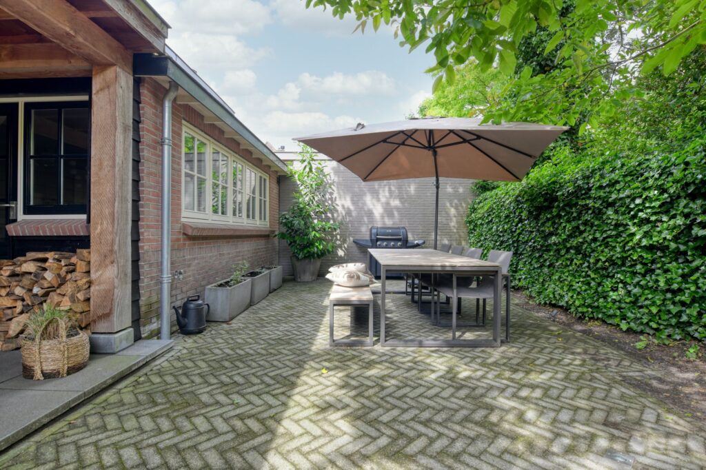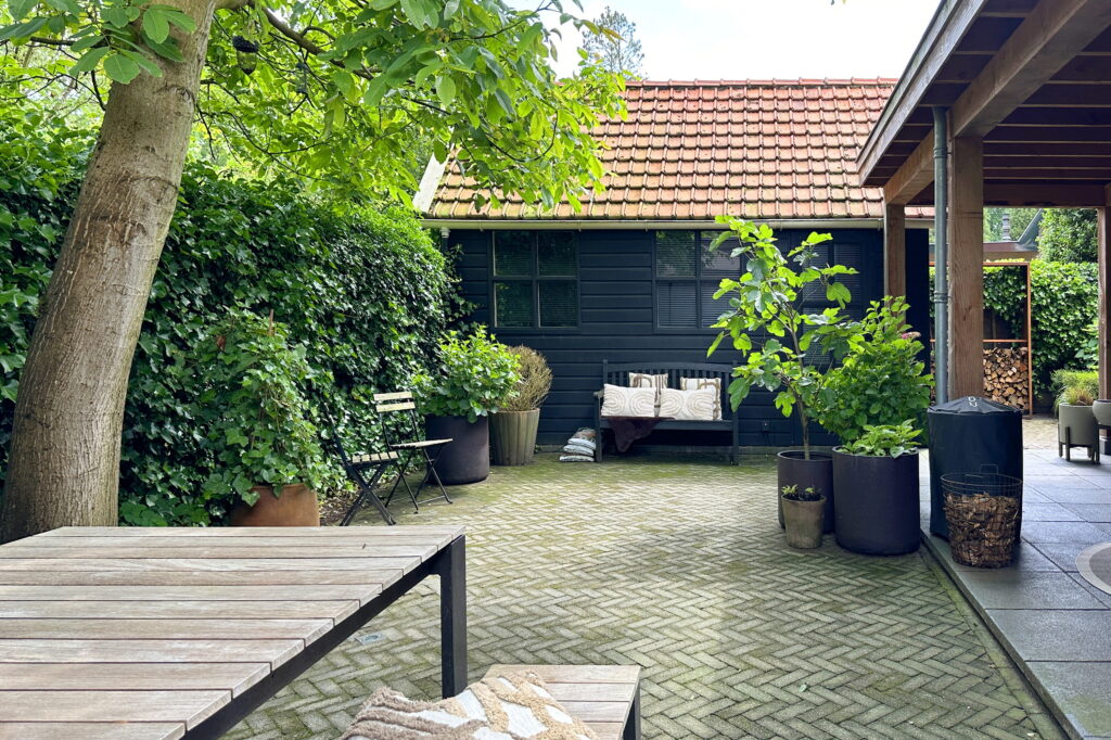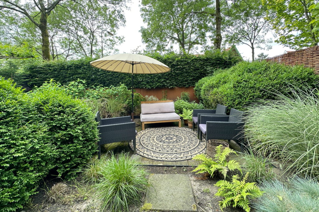 De achtertuin ligt in de breedte en is verzorgd aangelegd met strakke hagen, natuurlijke beplanting en rijk bloeiende bloemen. De veranda biedt een fijne plek in de schaduw én beschutting als het regent.