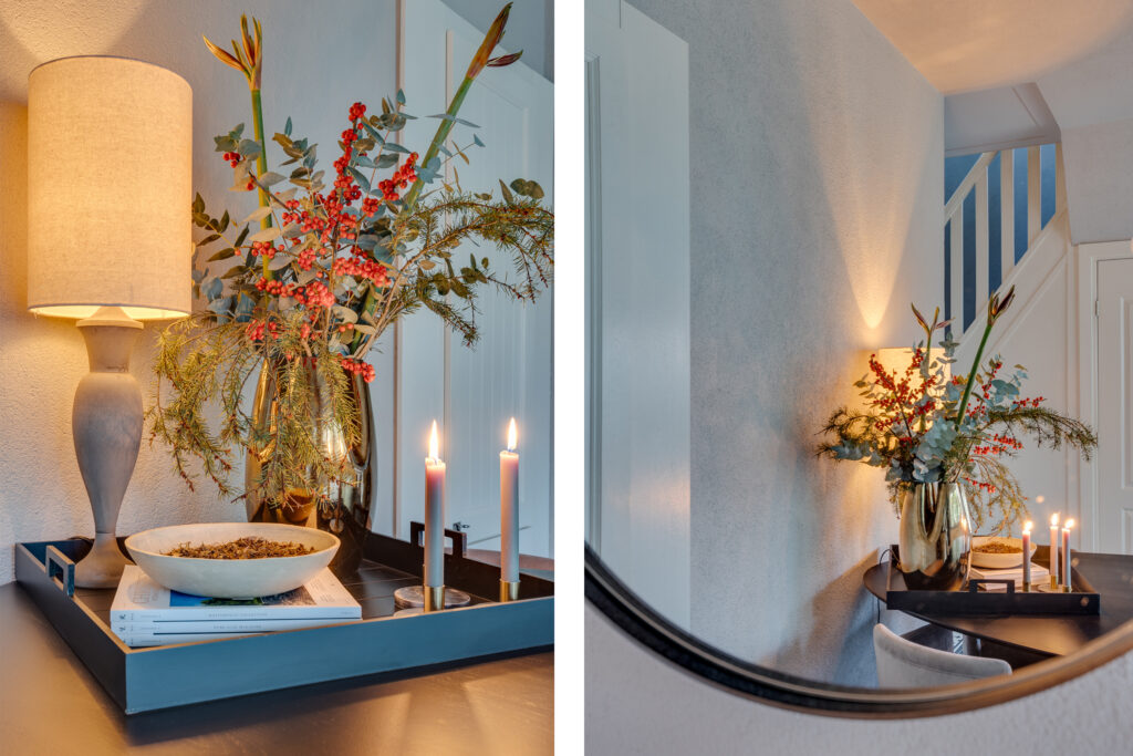 Via een met waaltjes en boerengrind bestraat opritpad loop je naar de voordeur met optrede. In de hal valt direct de Portugese tegelvloer op. Vanuit hier bereik je het toilet, de meterkast, de trapopgang, een werkkamer met ingebouwde kasten en de leefruimten.