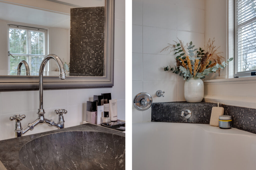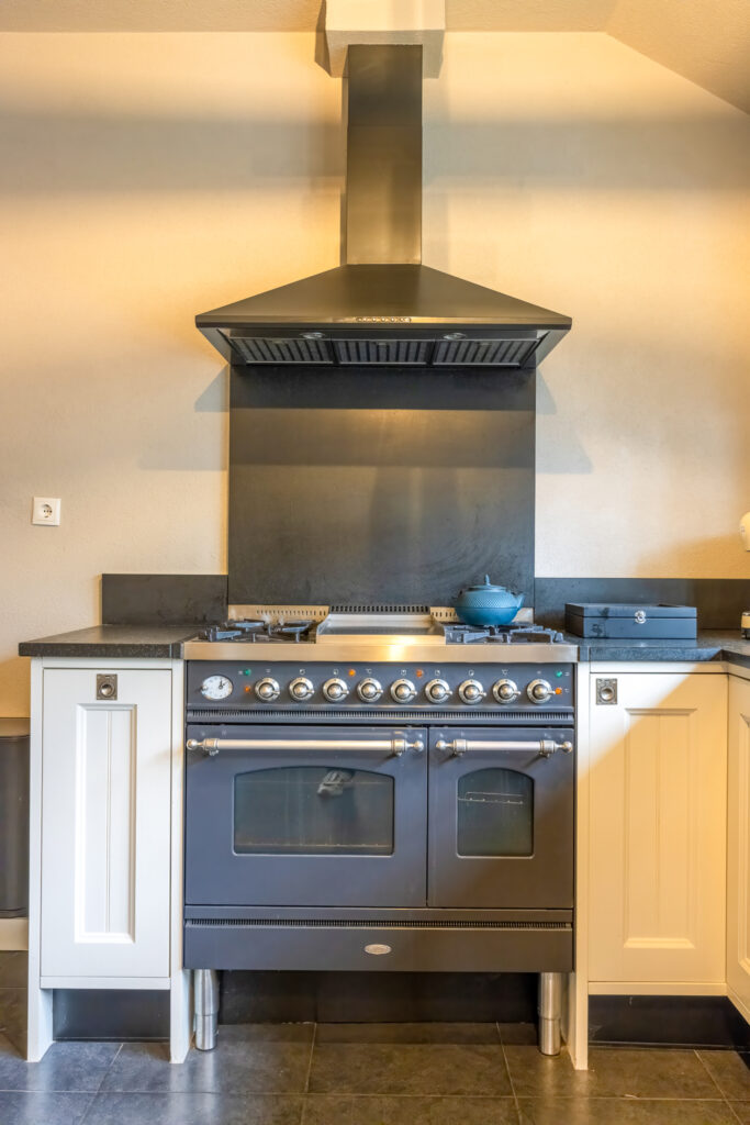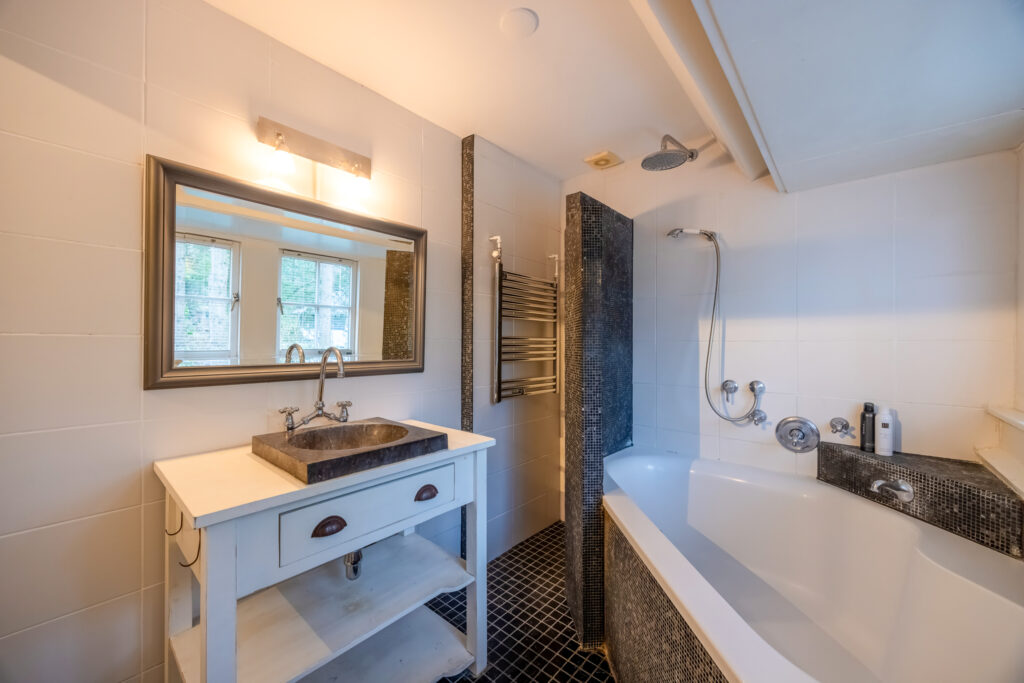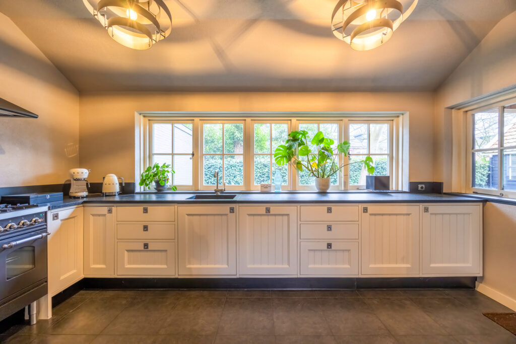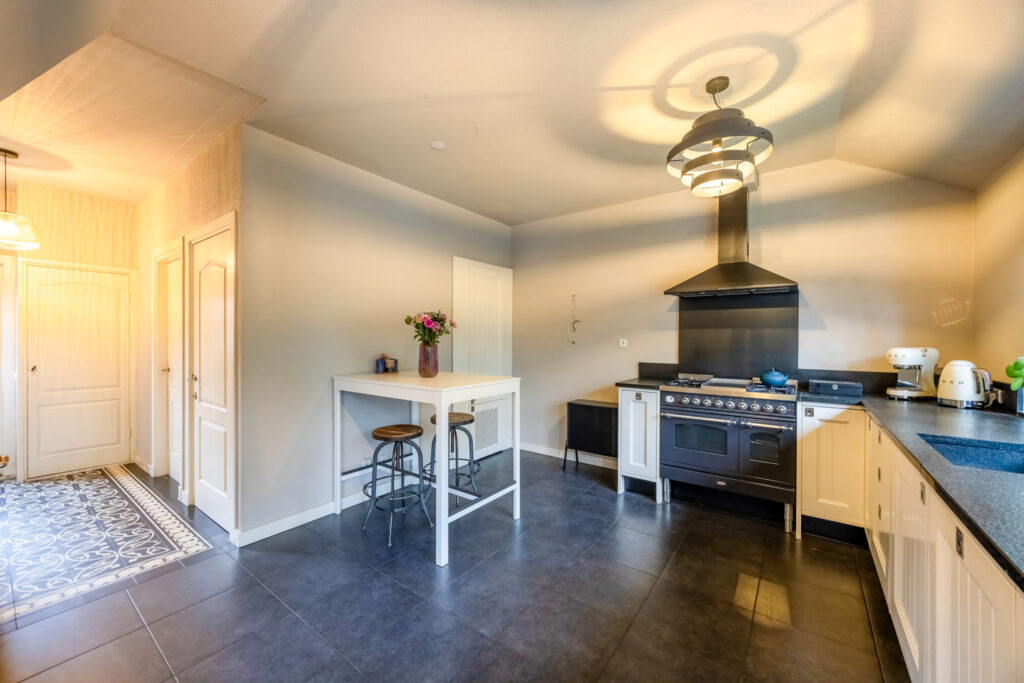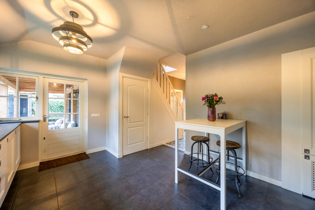 De witte houten keuken in landelijke stijl is een plaatje: met een donker granieten werkblad en fraaie inbouwapparatuur. De leefkeuken ligt aan de achterzijde, heeft een donkere hardstenen vloer en kijkt uit over de tuin. In het midden is ruimte voor een eettafel – de plek waar het dagelijks leven samenkomt. Ook prettig: de diepe trapkast is bereikbaar vanuit de keuken.