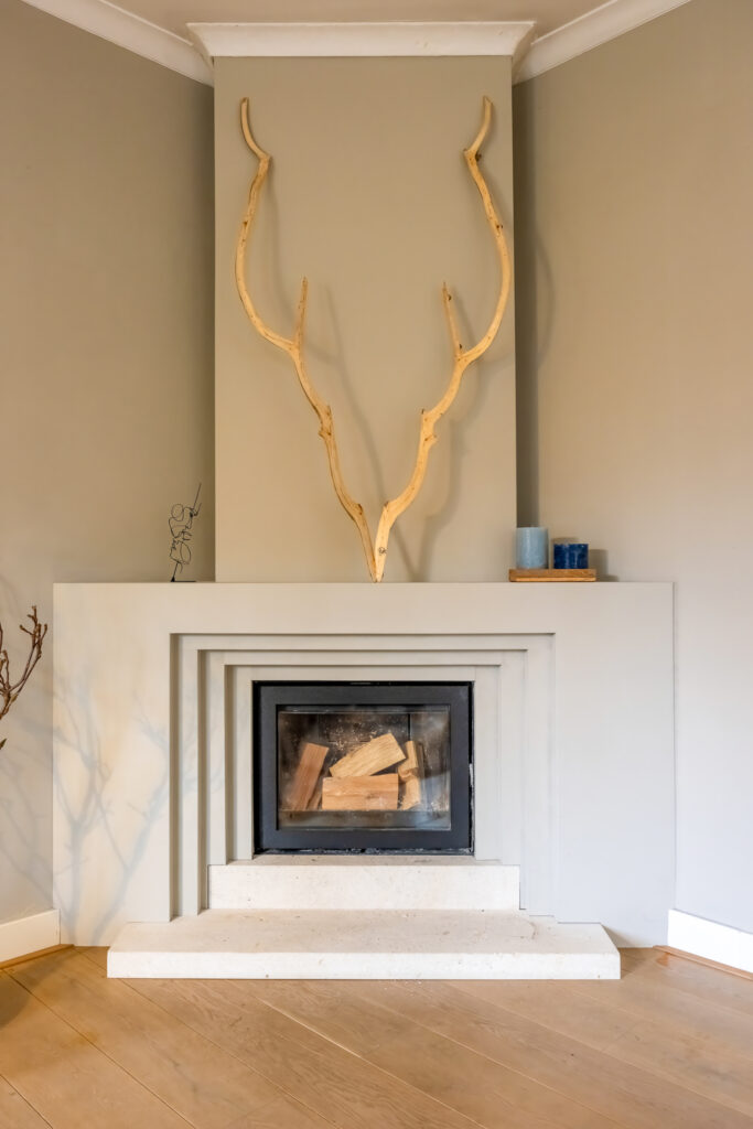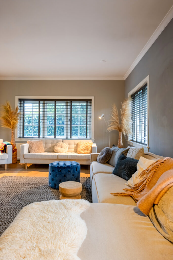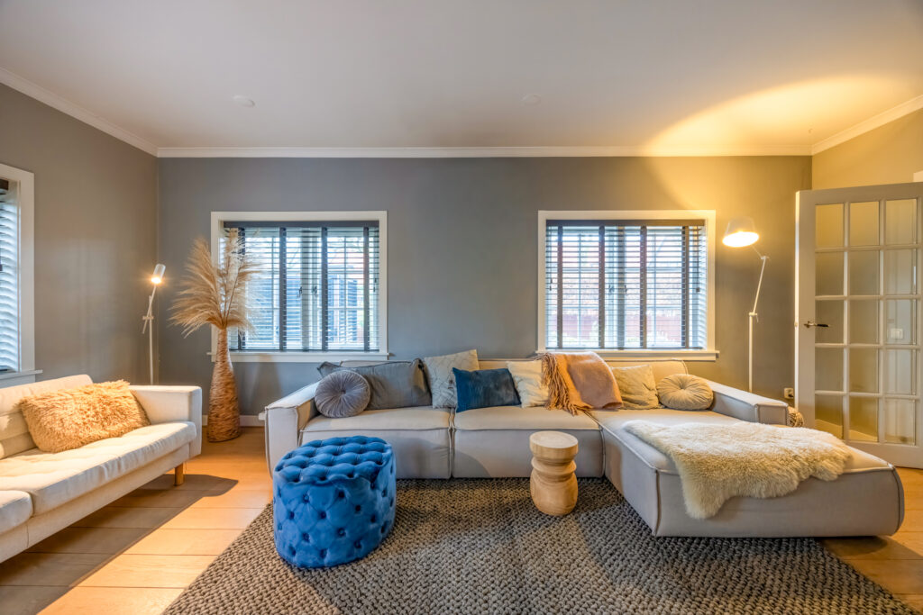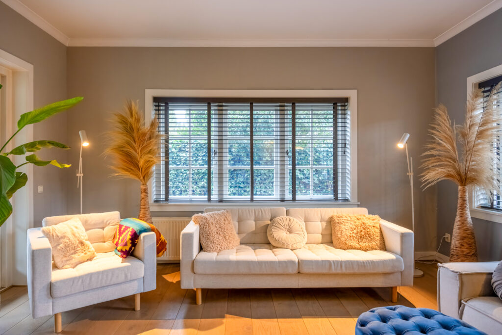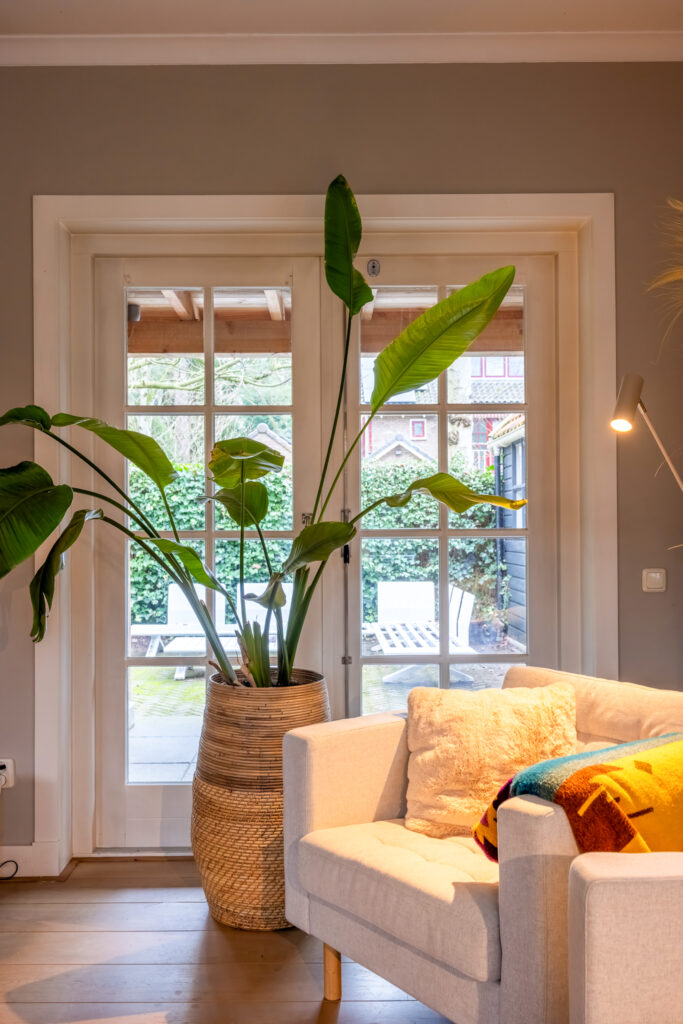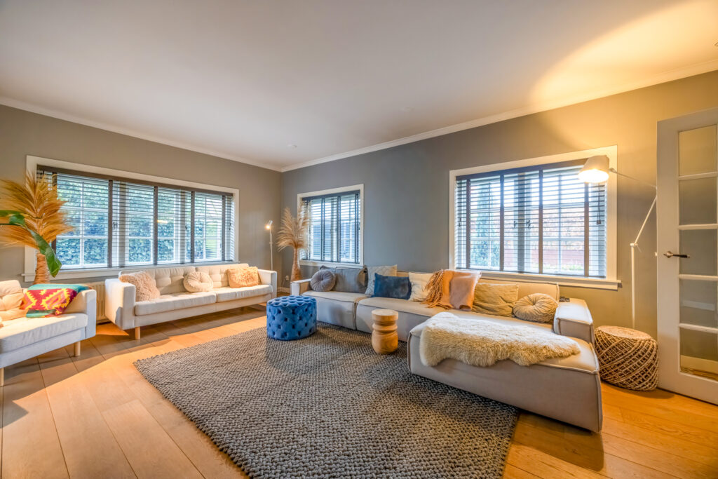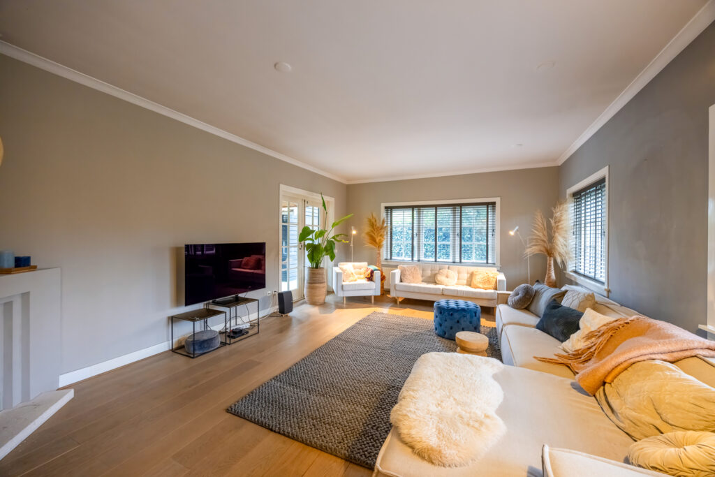De woonkamer is licht en heeft zicht op zowel voor- als achtertuin. De openslaande tuindeuren met roedeverdeling versterken het cottage-gevoel. Een schouw met gashaard zorgt voor warmte op koude avonden. Op de vloer liggen brede houten delen en de hoge plafonds zijn strak gestukt, afgewerkt met hoge plinten.