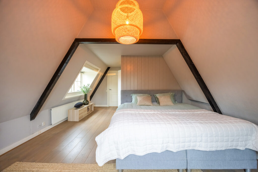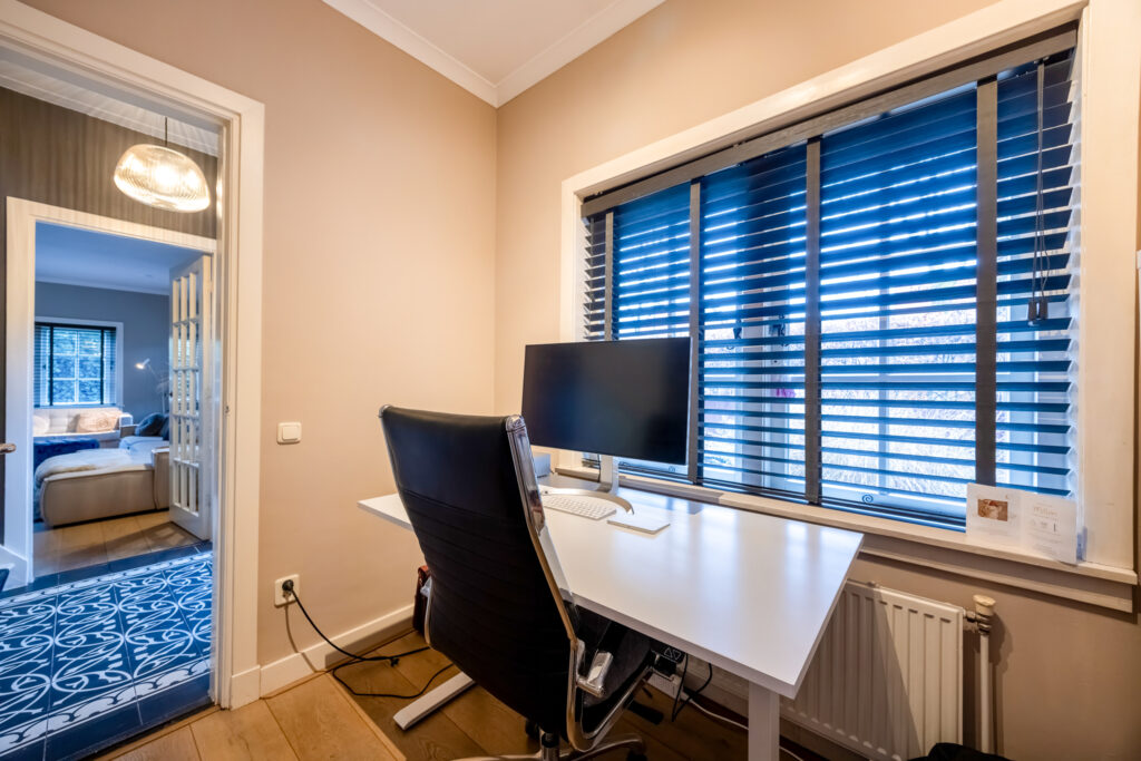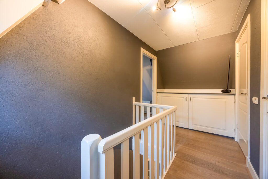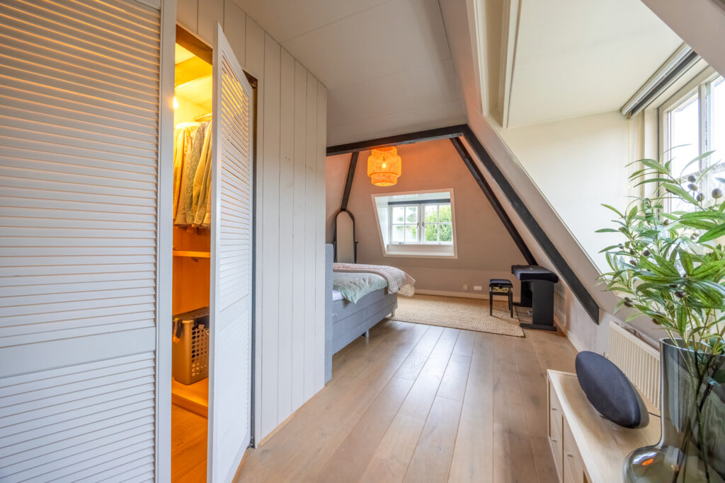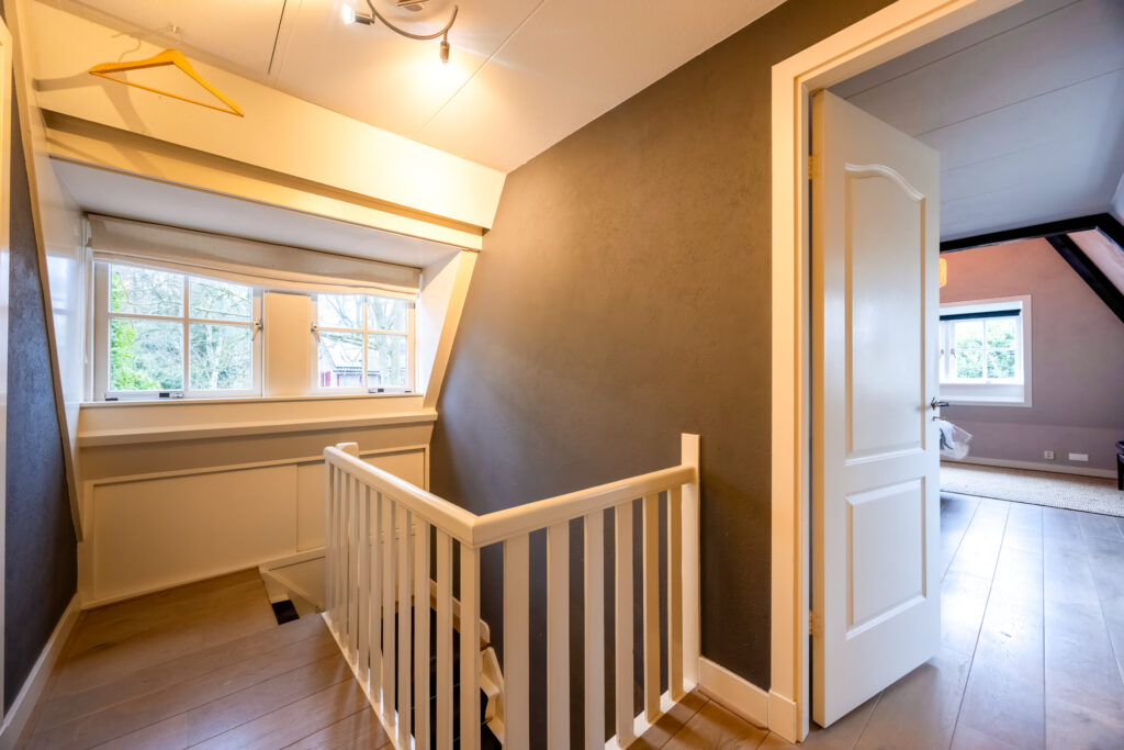 Op de overloop met balustrade liggen twee fijne slaapkamers, waarvan één met een ruime walk-in-closet. Door de roedeverdeling in de ramen kijk je uit over de rust en het bosrijke van de straat.