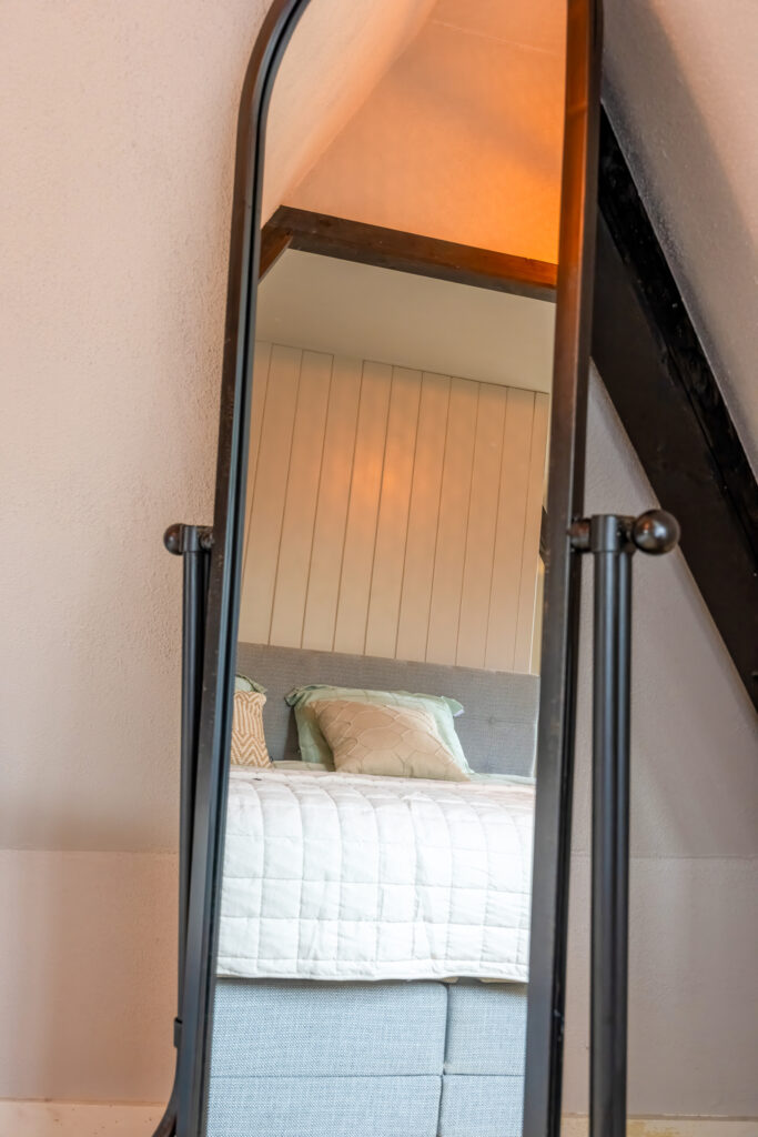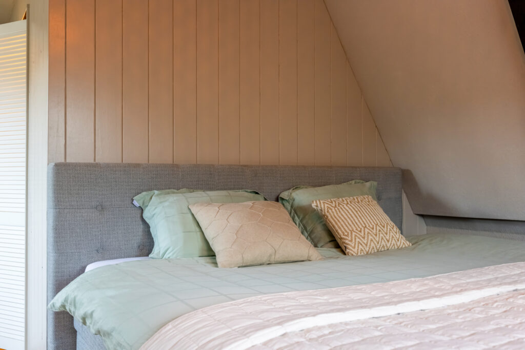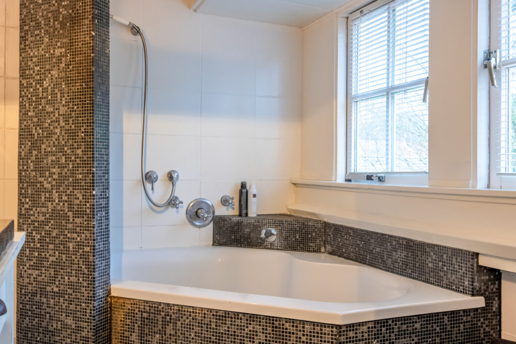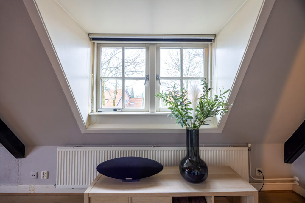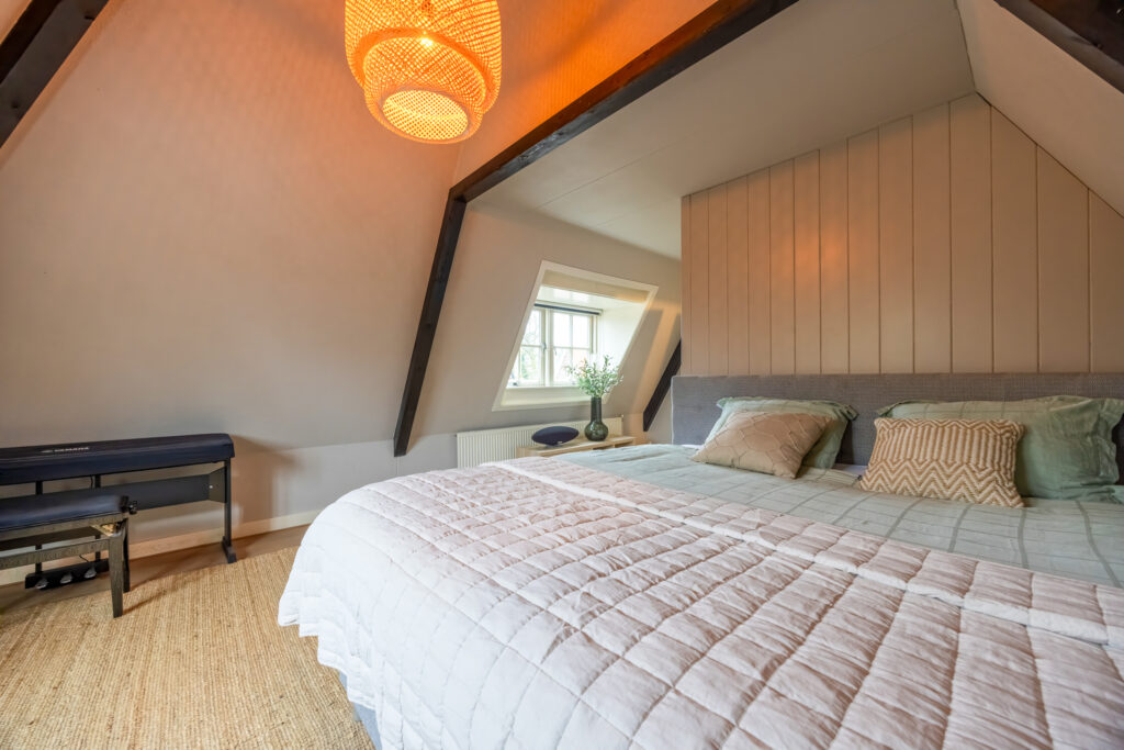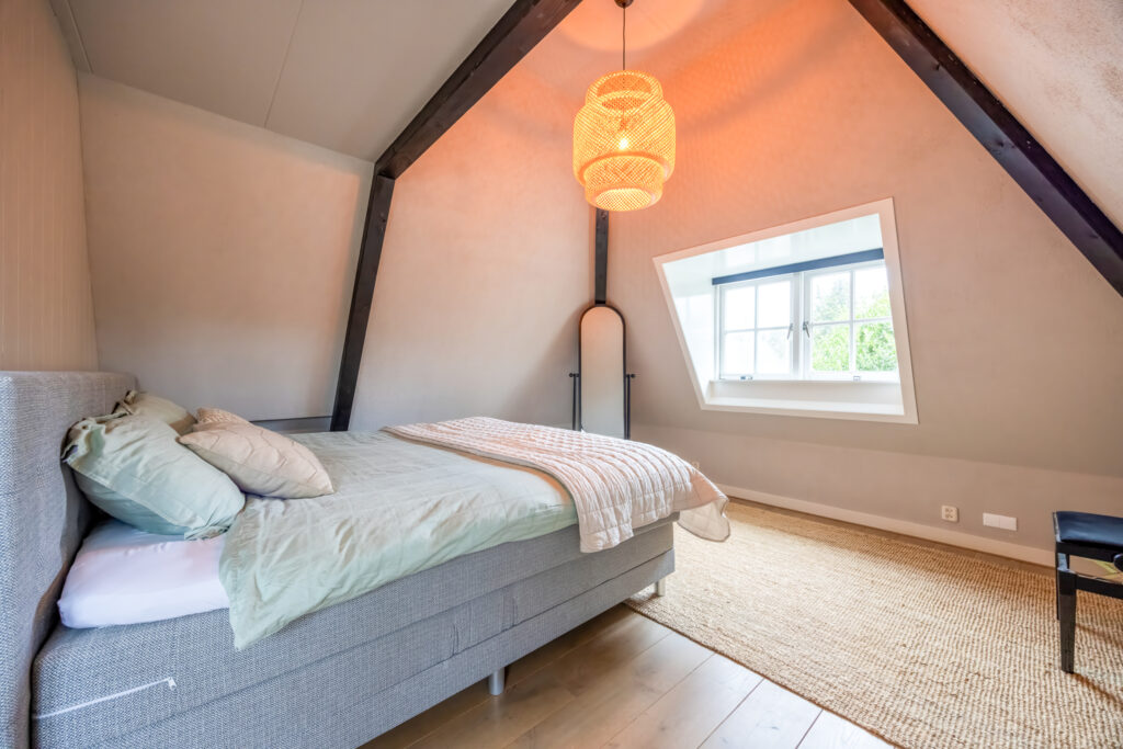 Op de overloop met balustrade liggen twee fijne slaapkamers, waarvan één met een ruime walk-in-closet. Door de roedeverdeling in de ramen kijk je uit over de rust en het bosrijke van de straat.