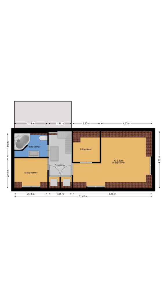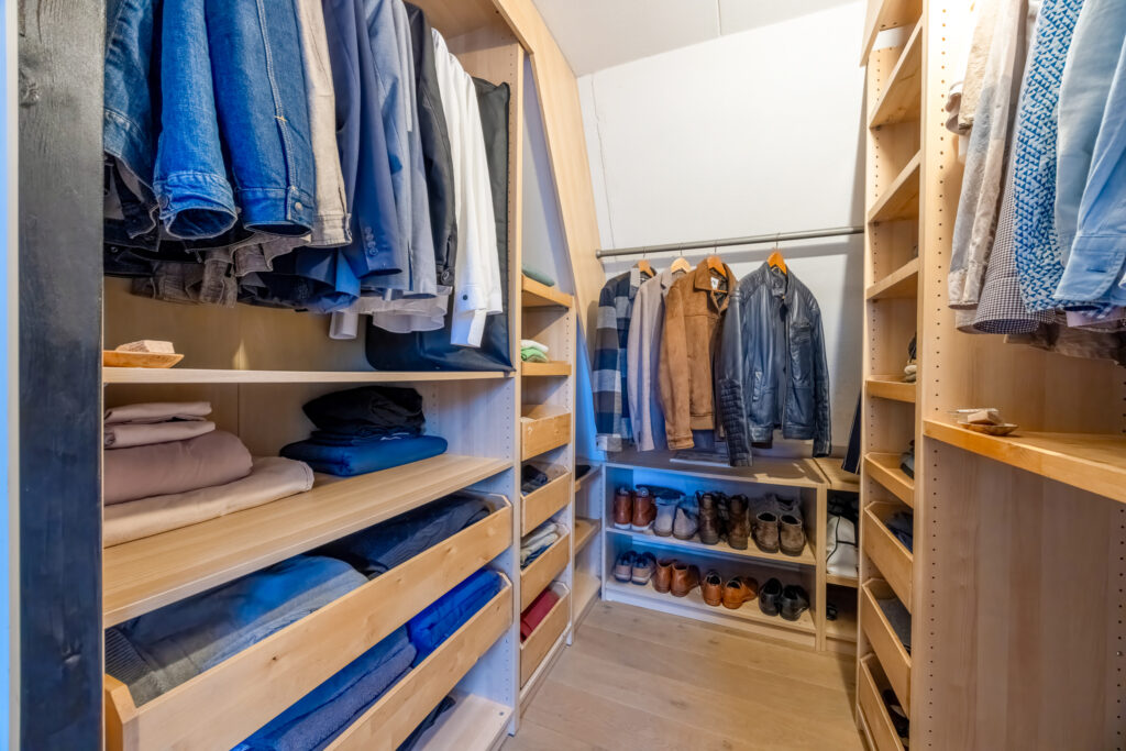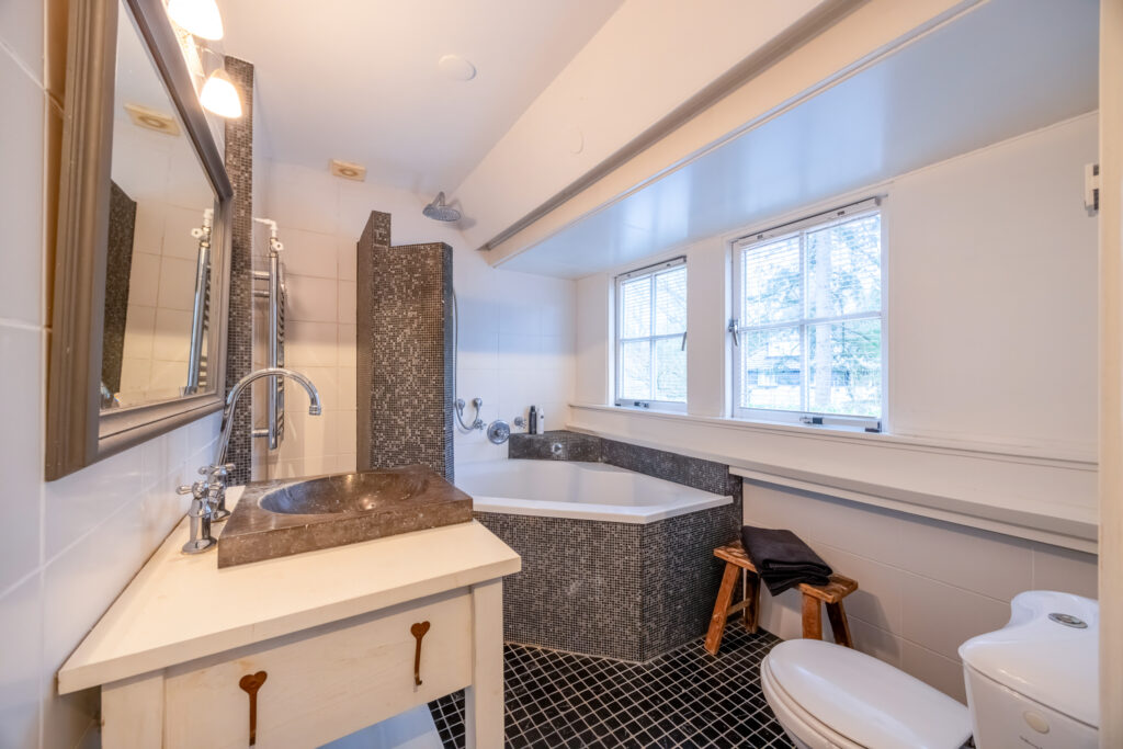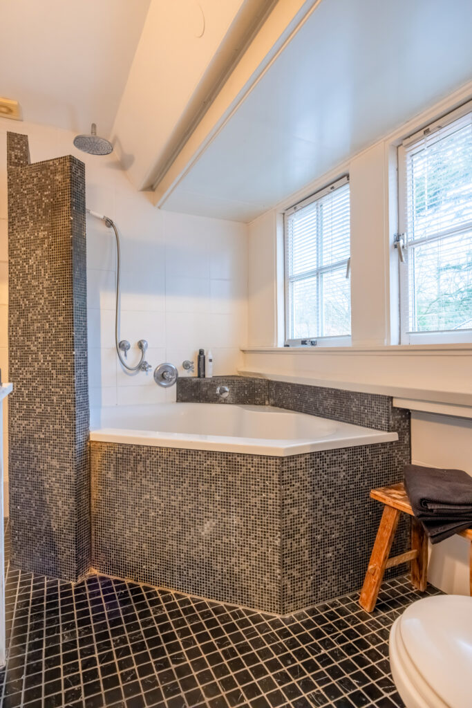 De badkamer met brede dakkapel is compleet uitgevoerd met inloopdouche, wastafelmeubel, toilet en ligbad. Daarnaast is er een praktische, ingebouwde wasruimte met aansluitingen voor wasmachine en droger.