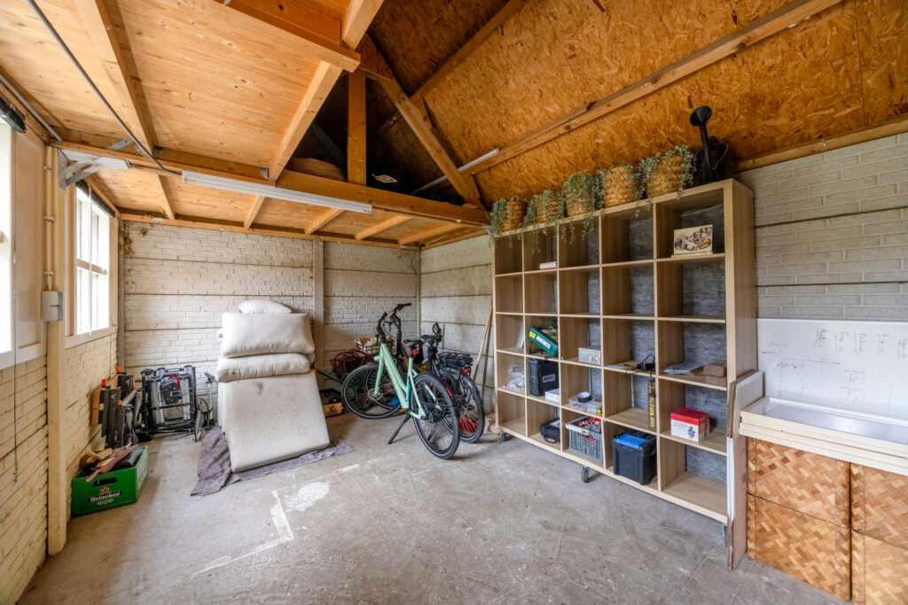 De garage is buitenom bereikbaar en uitgevoerd met een oranje pannendak, zwarte houten gevelbekleding en openslaande deuren. Er is ruimte voor een auto, fietsen en tuingereedschap. Uiteraard is er elektra aanwezig.