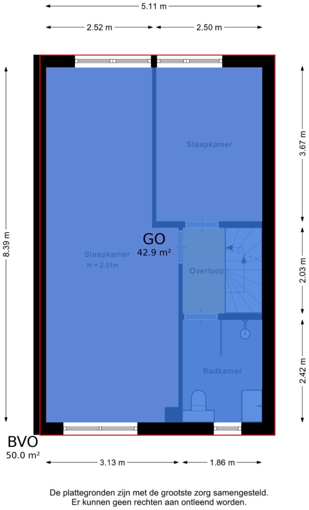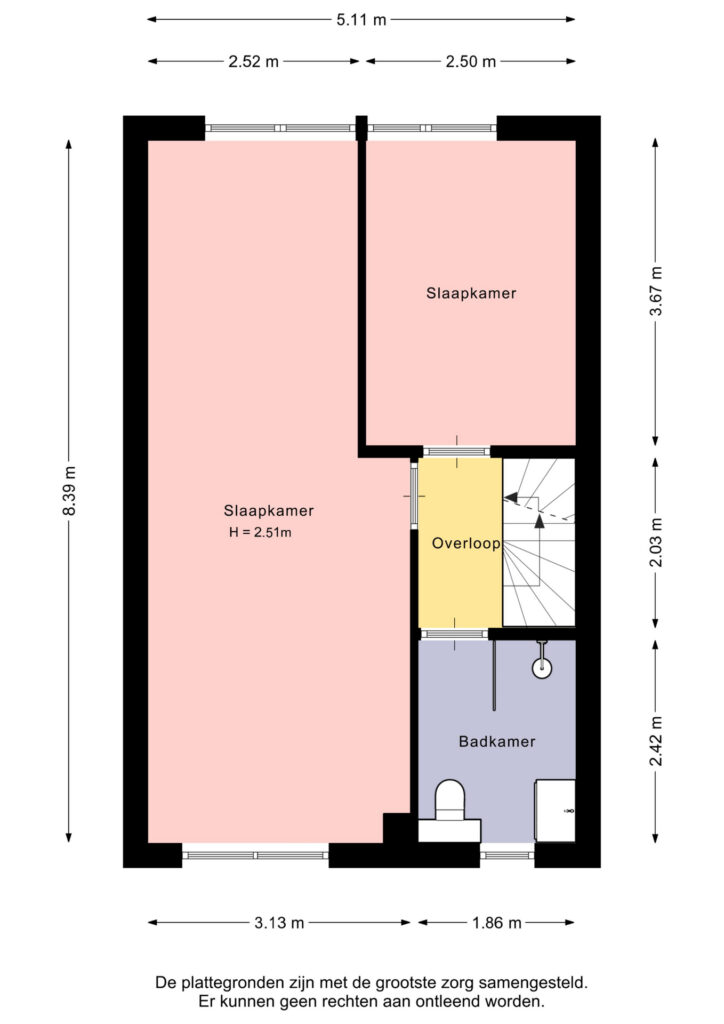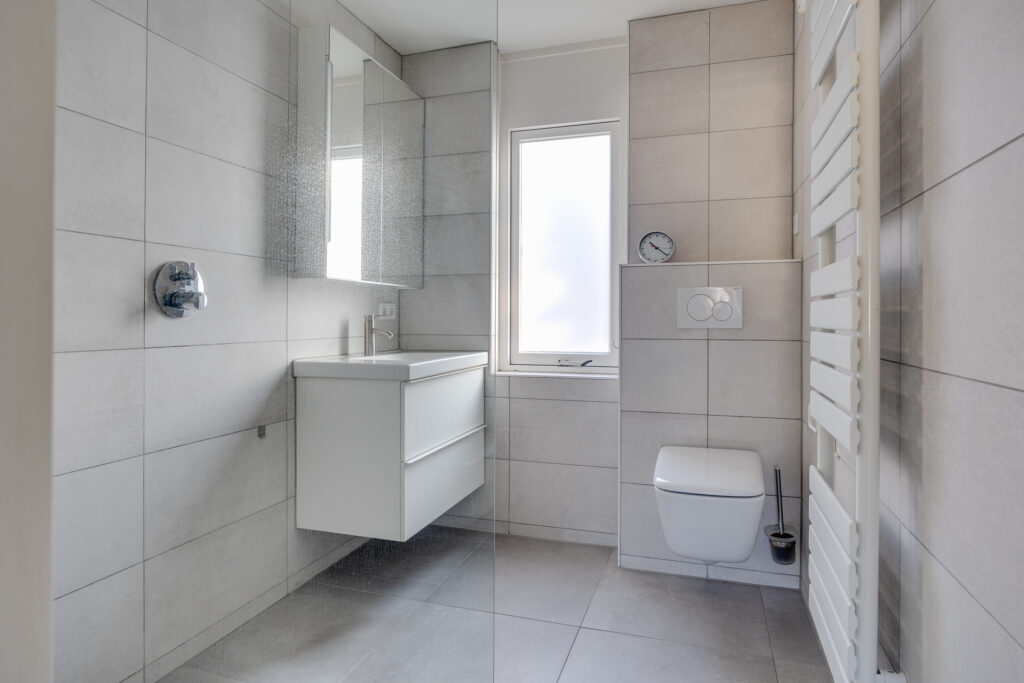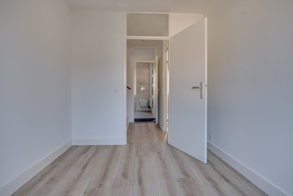 Eerste verdieping: op de eerste verdieping bevinden zich twee slaapkamers en een badkamer. De praktische en lichte indeling biedt eventueel de mogelijkheid om de oorspronkelijke indeling met drie slaapkamers eenvoudig terug te brengen. De badkamer is uitgevoerd met een inloopdouche, toilet en wastafelmeubel.