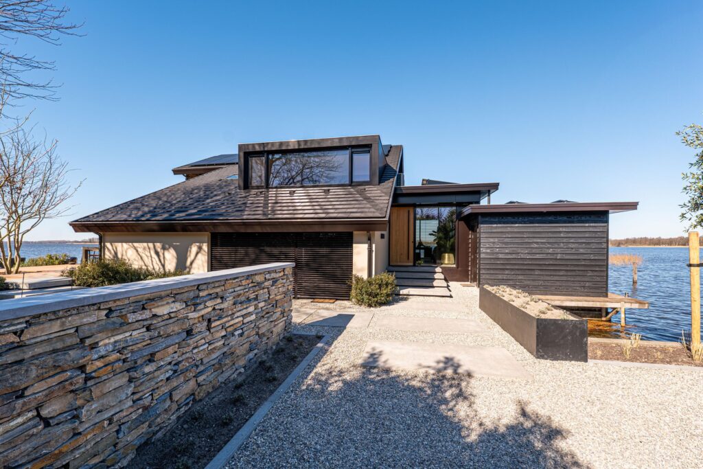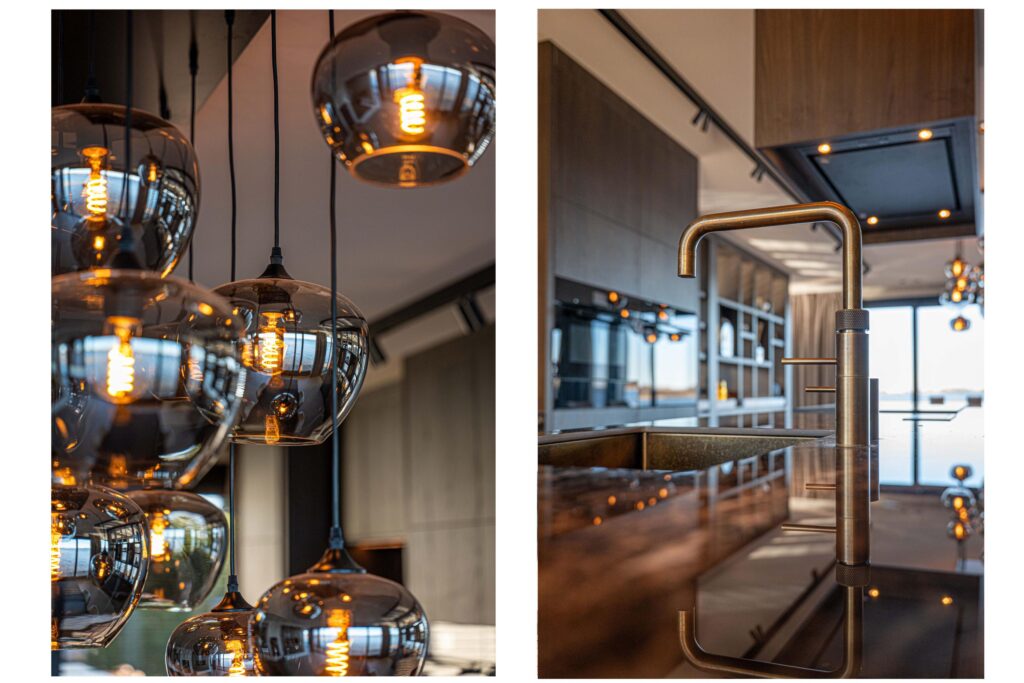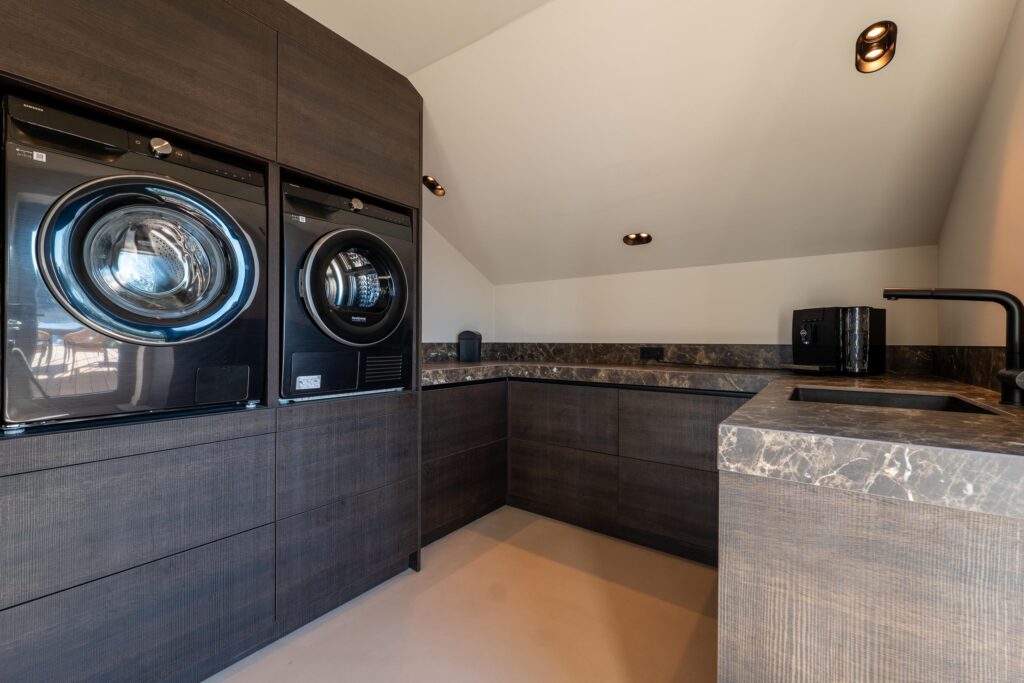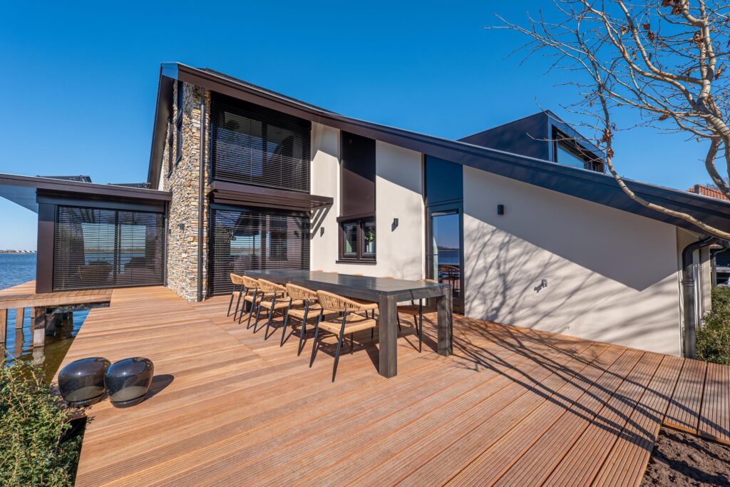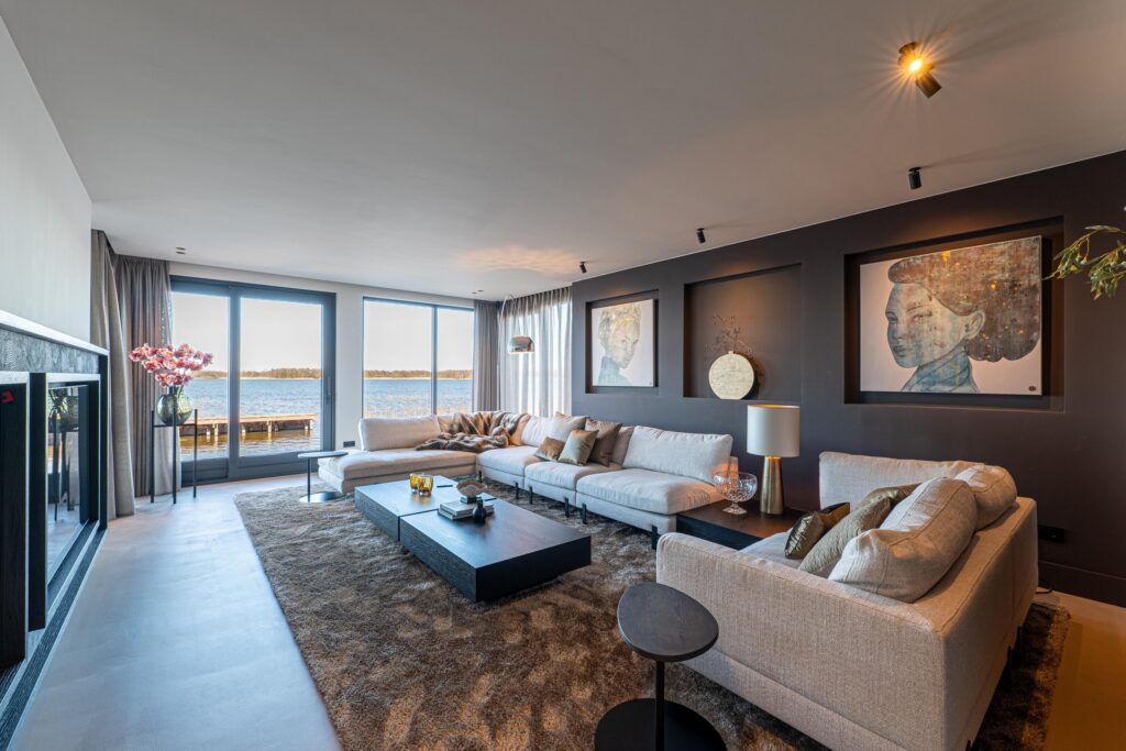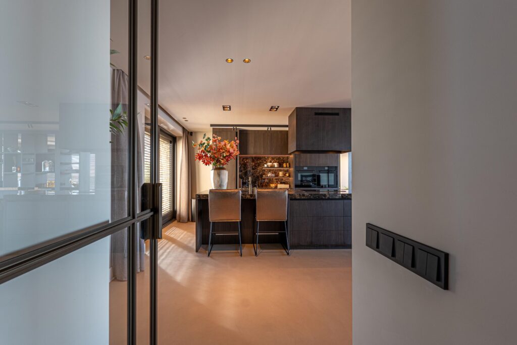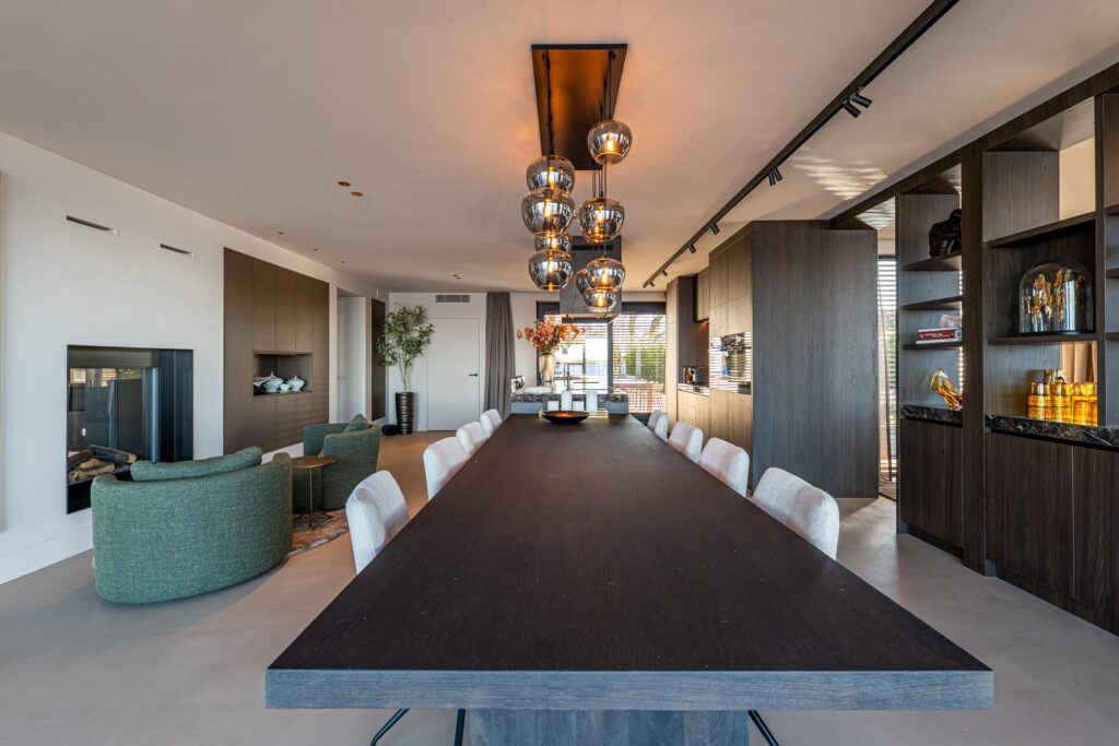 De riante woonkeuken vormt het hart van de villa en biedt een adembenemend uitzicht over de serene plassen. Dankzij de grote schuifpuien aan weerszijden wordt buiten moeiteloos naar binnen gehaald, waardoor u het gevoel van wonen aan het water in zijn volle glorie ervaart. De keuken is vervaardigd van elegante dekton werkbladen en omgeven door hoogwaardige kastenwanden waarin diverse inbouwapparatuur naadloos is geïntegreerd.