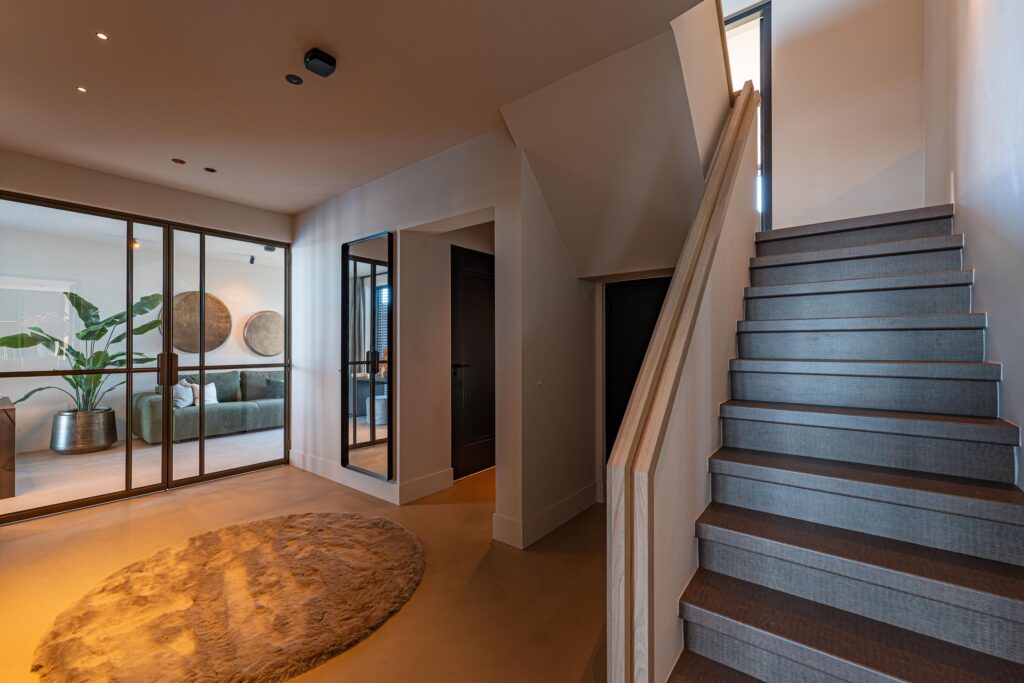 De begane grond verwelkomt u met een royale hal, waarin op maat gemaakte taatsdeuren leiden naar een stijlvolle tweede hal met garderobe, voorzien van maatwerk kasten. Aan de linkerzijde bevinden zich het toilet en de bioscoopruimte, uitgerust met airconditioning.