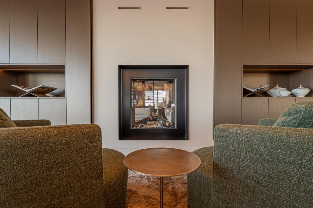 De royale woonkamer ademt warmte en stijl, met als centraal element een sfeervolle doorkijk haard (butaangas), die tevens zichtbaar is vanuit de keuken en zo een harmonieus geheel vormt.