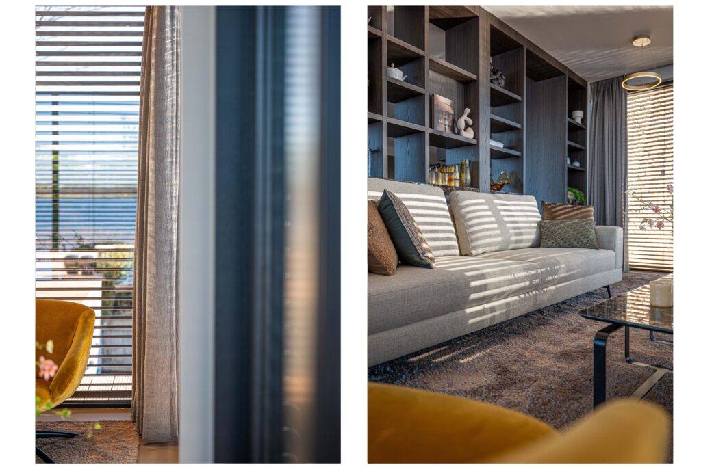 Grenzend aan de keuken bevindt zich, achter een op maat gemaakte roomdivider, een sfeervolle zithoek met eveneens een schuifpui naar het terras.
