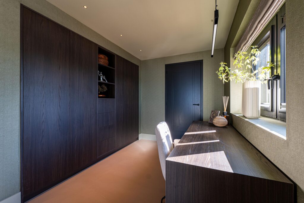 Middels de keuken is tevens de kantoorruimte bereikbaar, ook ideaal te gebruiken als bijvoorbeeld speelruimte voor de kinderen. Loopt u verder door dan komt u terecht in de handige bijkeuken met wasruimte welke eveneens in dezelfde stijl is afgewerkt.