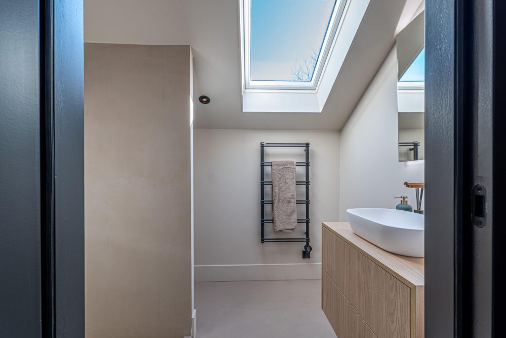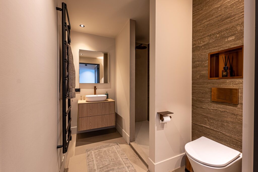 De doordachte indeling van deze verdieping biedt 1 separate badkamer en slaapkamer met en-suite badkamer. Beide badkamers zijn uitgerust met een stijlvolle inloopdouche, een elegante wastafel, een zwevend toilet en een elektrische designradiator. Hiermee is optimaal comfort en privacy gewaarborgd voor alle bewoners en gasten.