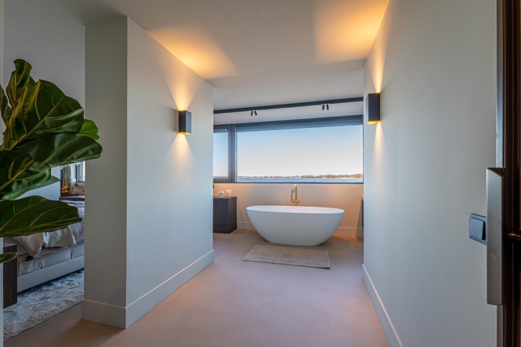 De master badkamer is voorzien van een dubbele wastafel, een vrijstaand designbad, een luxe inloopdouche en een toilet. Dankzij de doordachte positionering geniet u zelfs hier van het adembenemende uitzicht, waardoor baden of douchen een ongeëvenaarde ervaring wordt.