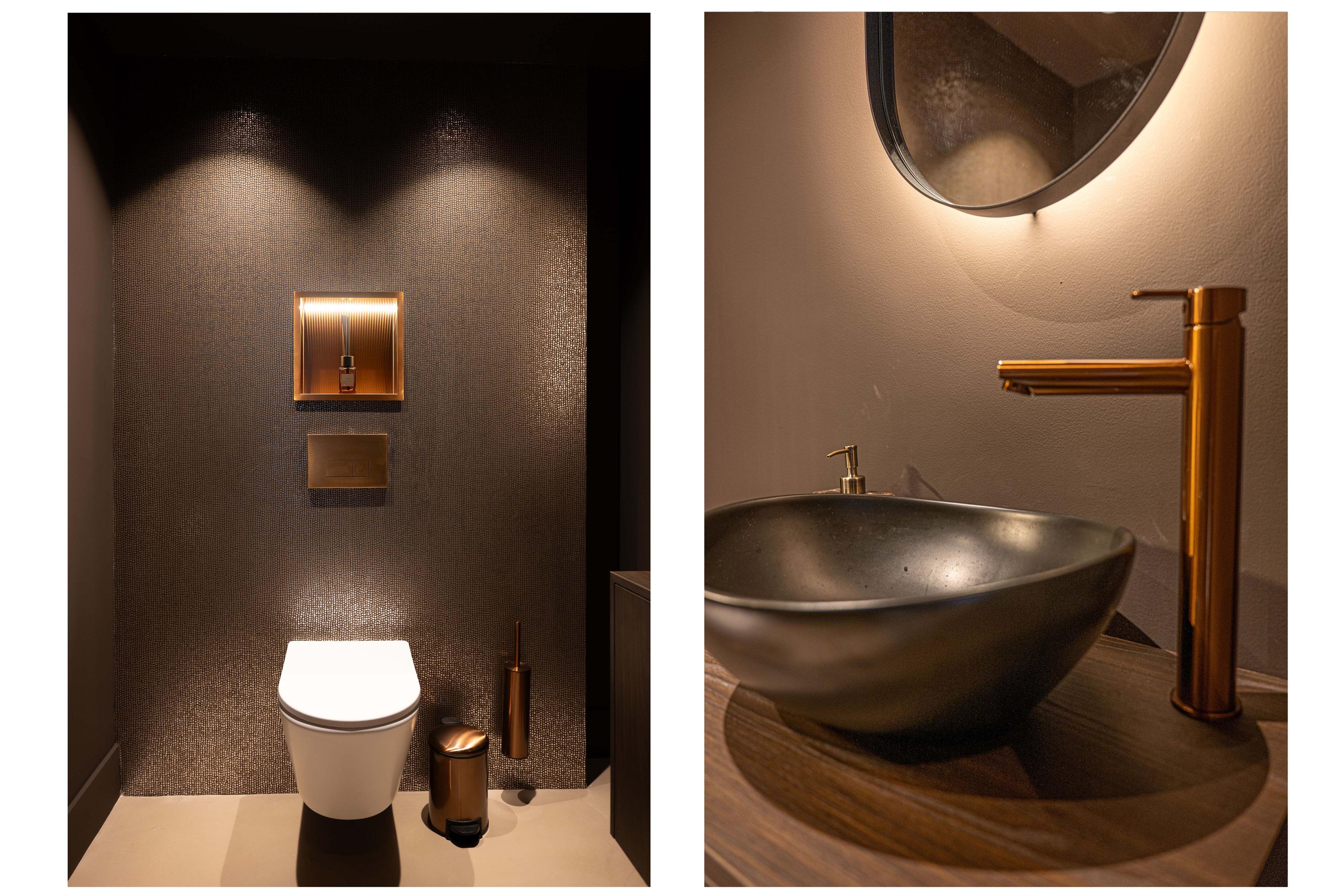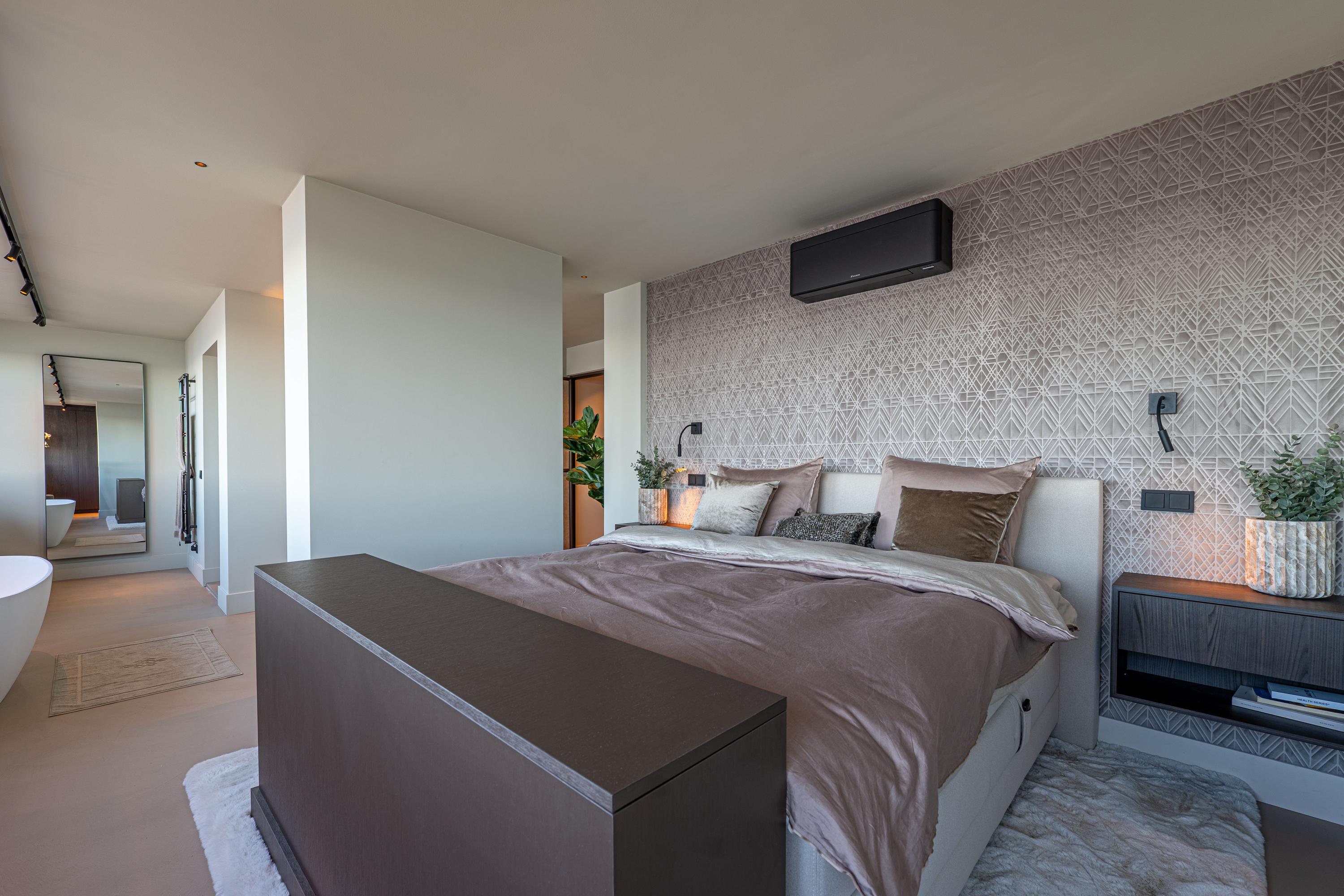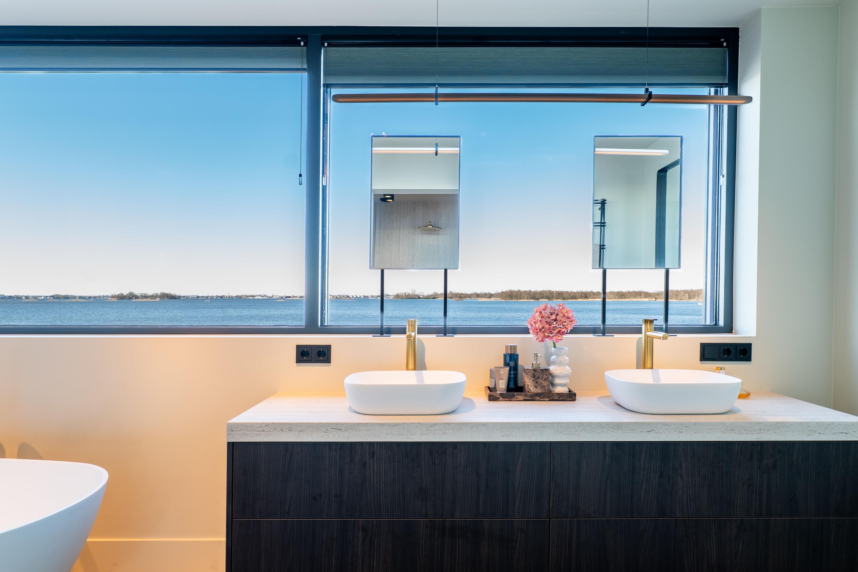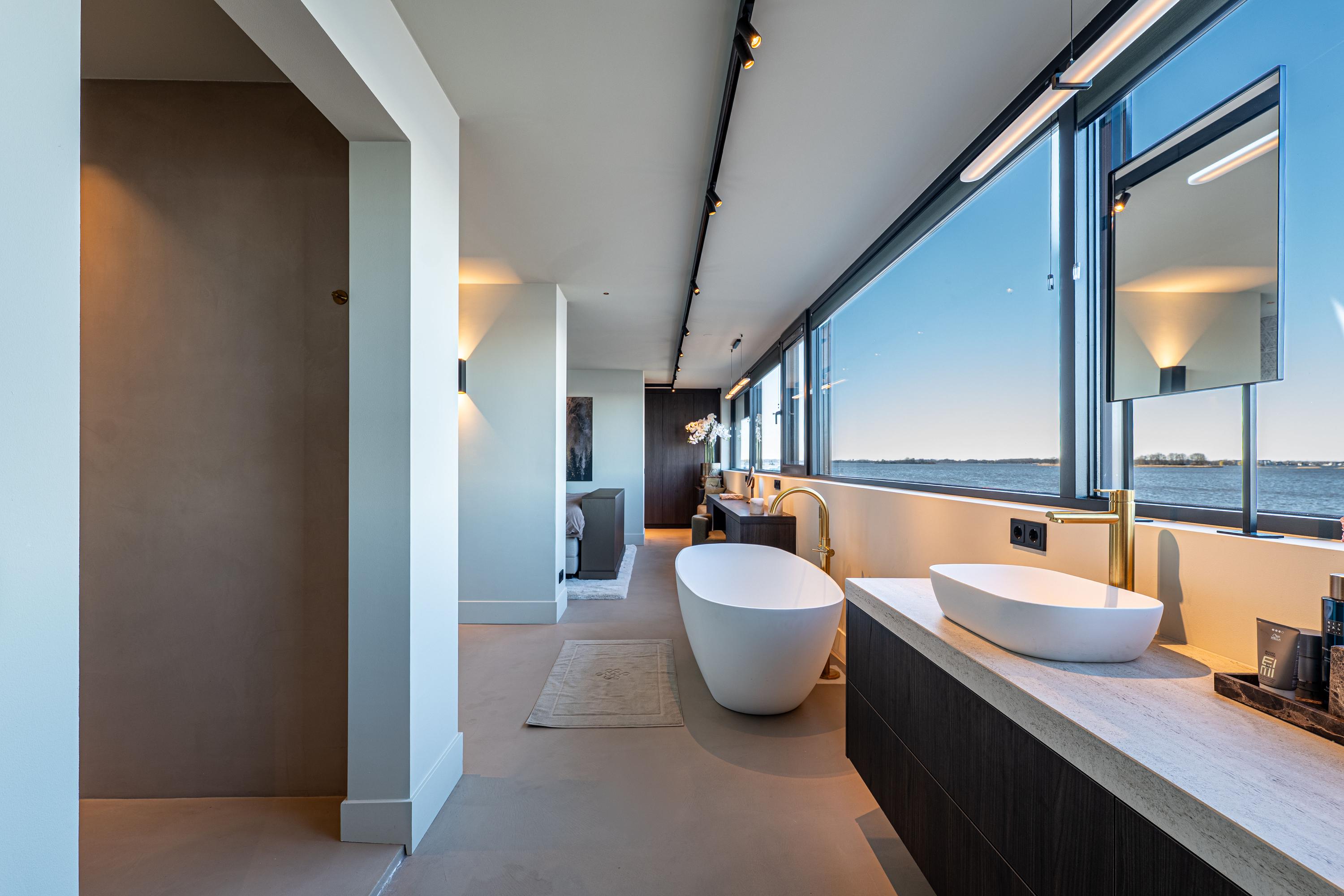 De master badkamer is voorzien van een dubbele wastafel, een vrijstaand designbad, een luxe inloopdouche en een toilet. Dankzij de doordachte positionering geniet u zelfs hier van het adembenemende uitzicht, waardoor baden of douchen een ongeëvenaarde ervaring wordt.
