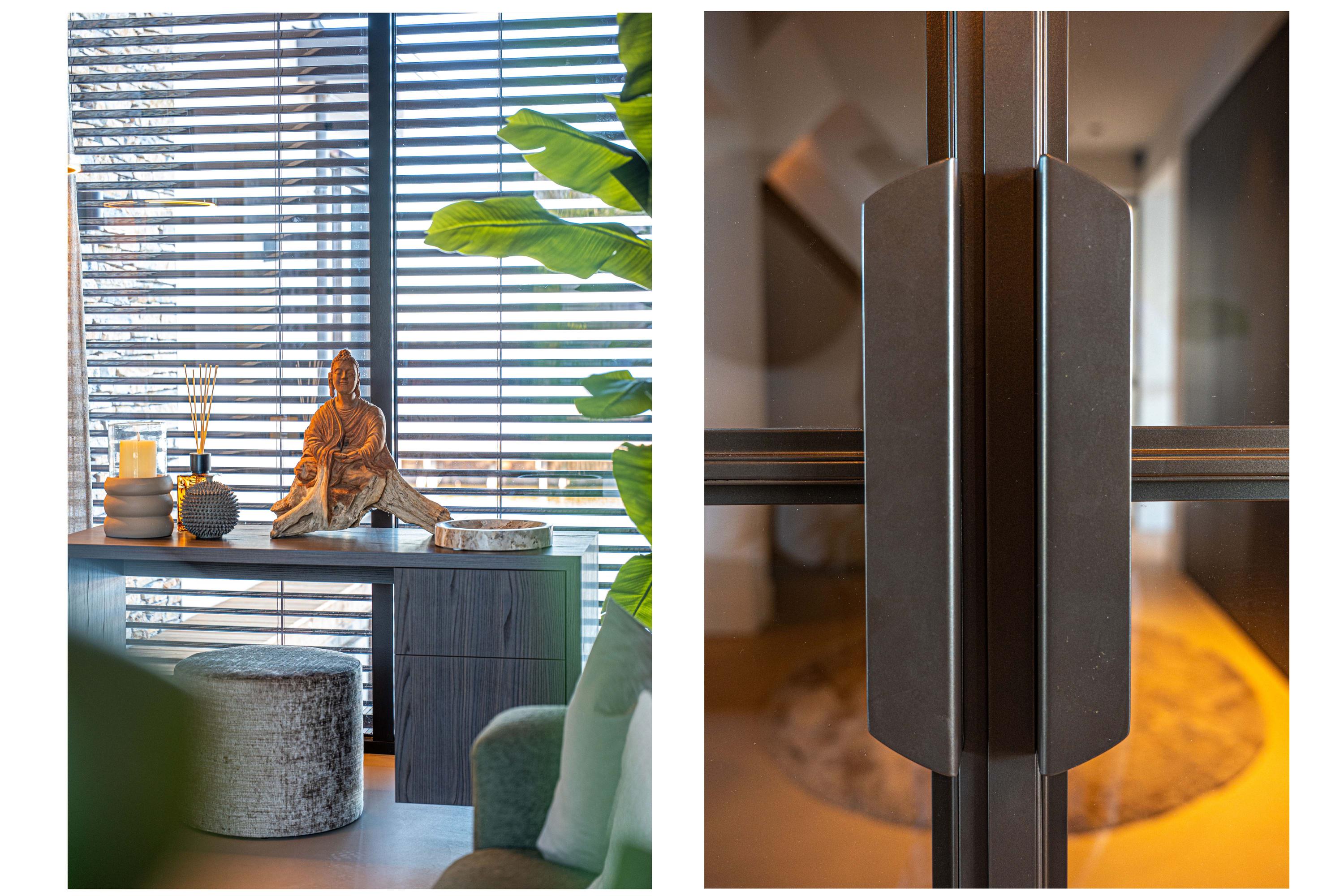 Grenzend aan de keuken bevindt zich, achter een op maat gemaakte roomdivider, een sfeervolle zithoek met eveneens een schuifpui naar het terras.